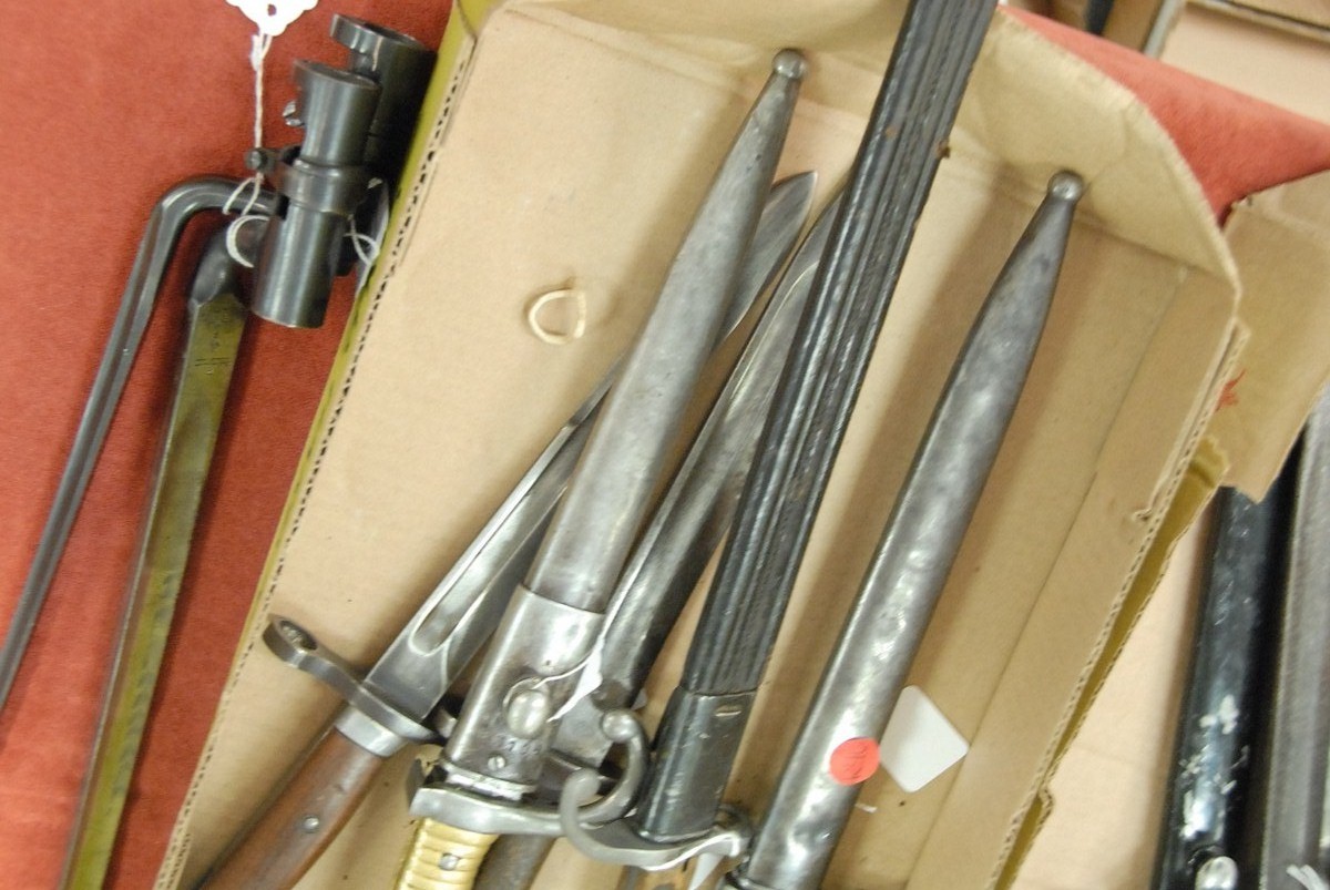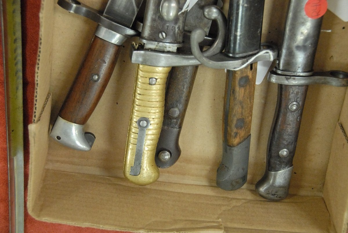 Box of bayonets including one for 1908-1934 Mauser and one for Remington Rolling Block.