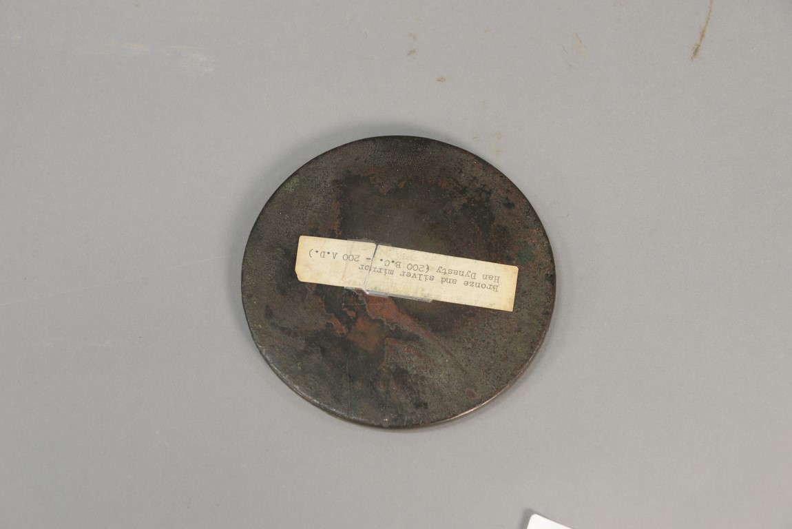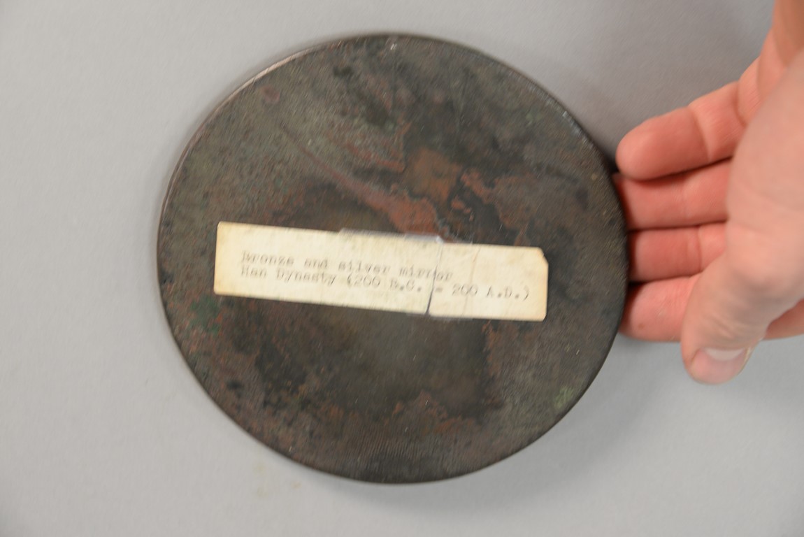 Chinese bronze disc mirror, possibly Han Dynasty. dia. 5 1/4 in.
