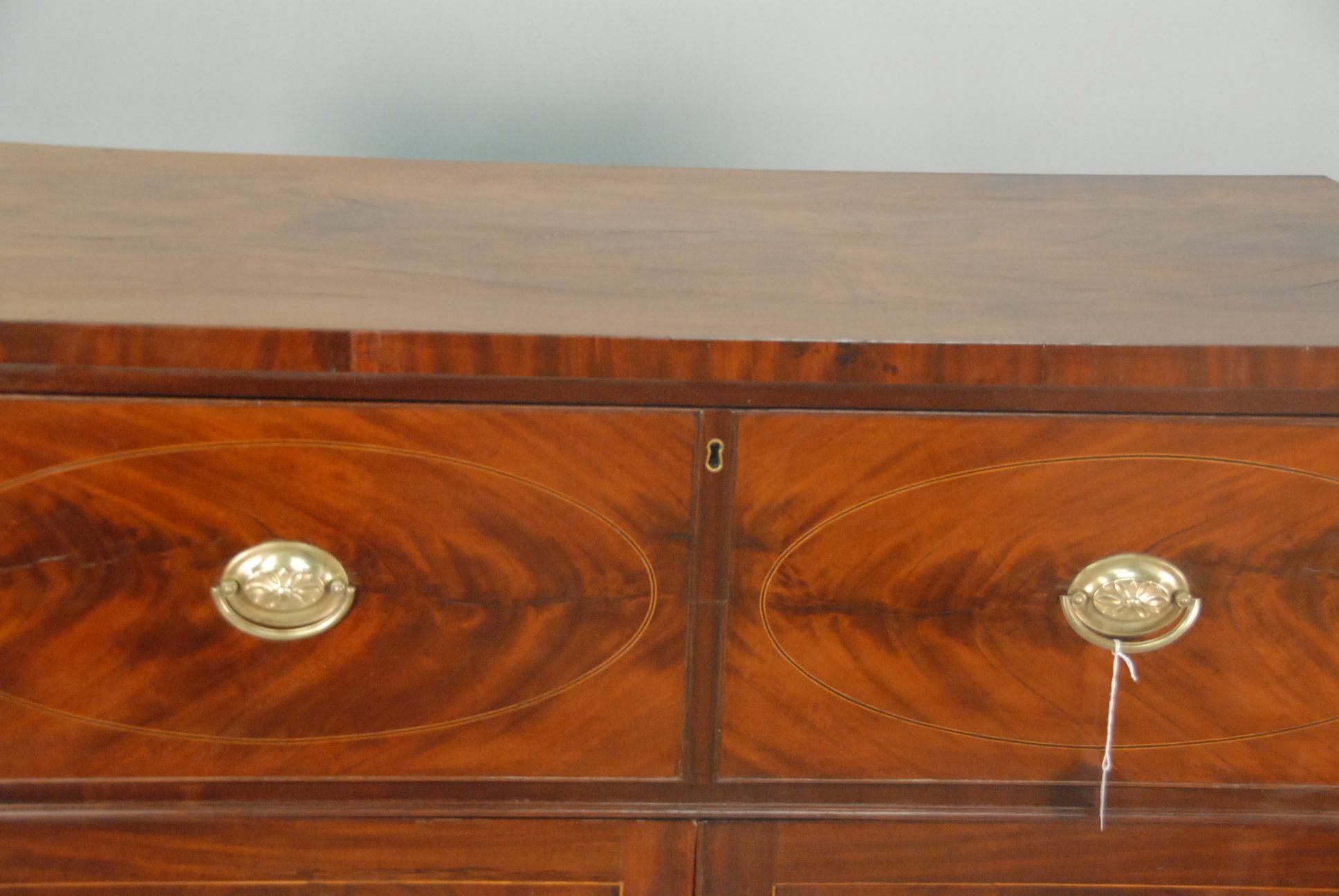 Lot 290: Federal mahogany butlers desk with fold out top drawer opening to reveal drawers and pigeon holes over two doors all set on flared French feet. ht. 45 1/2in., wd. 46in.
