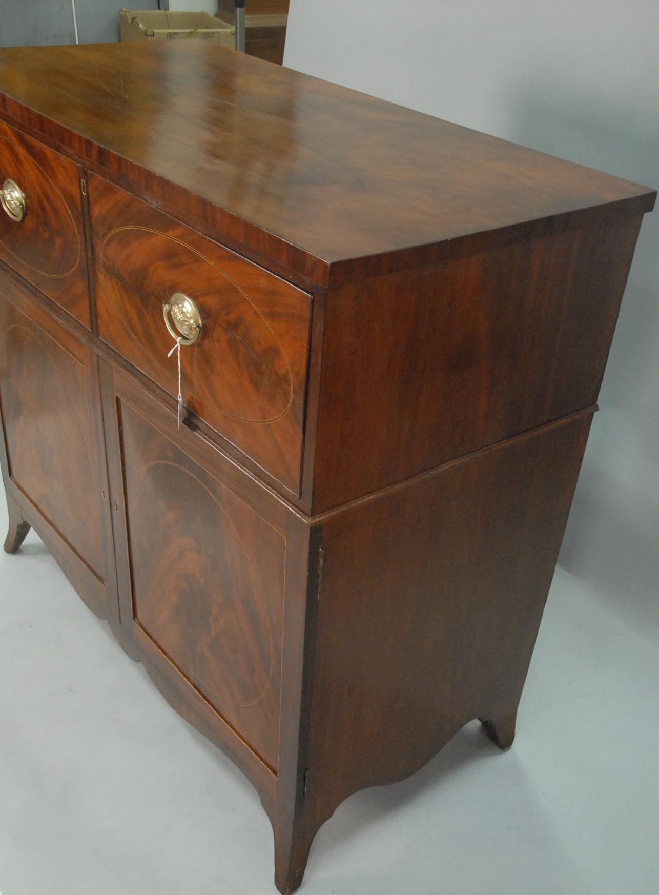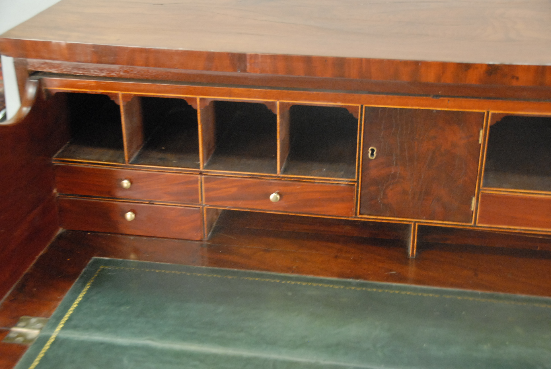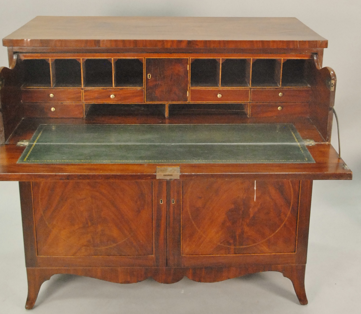 Federal mahogany butlers desk with fold out top drawer opening to reveal drawers and pigeon holes over two doors all set on flared French feet. ht. 45 1/2in., wd. 46in.