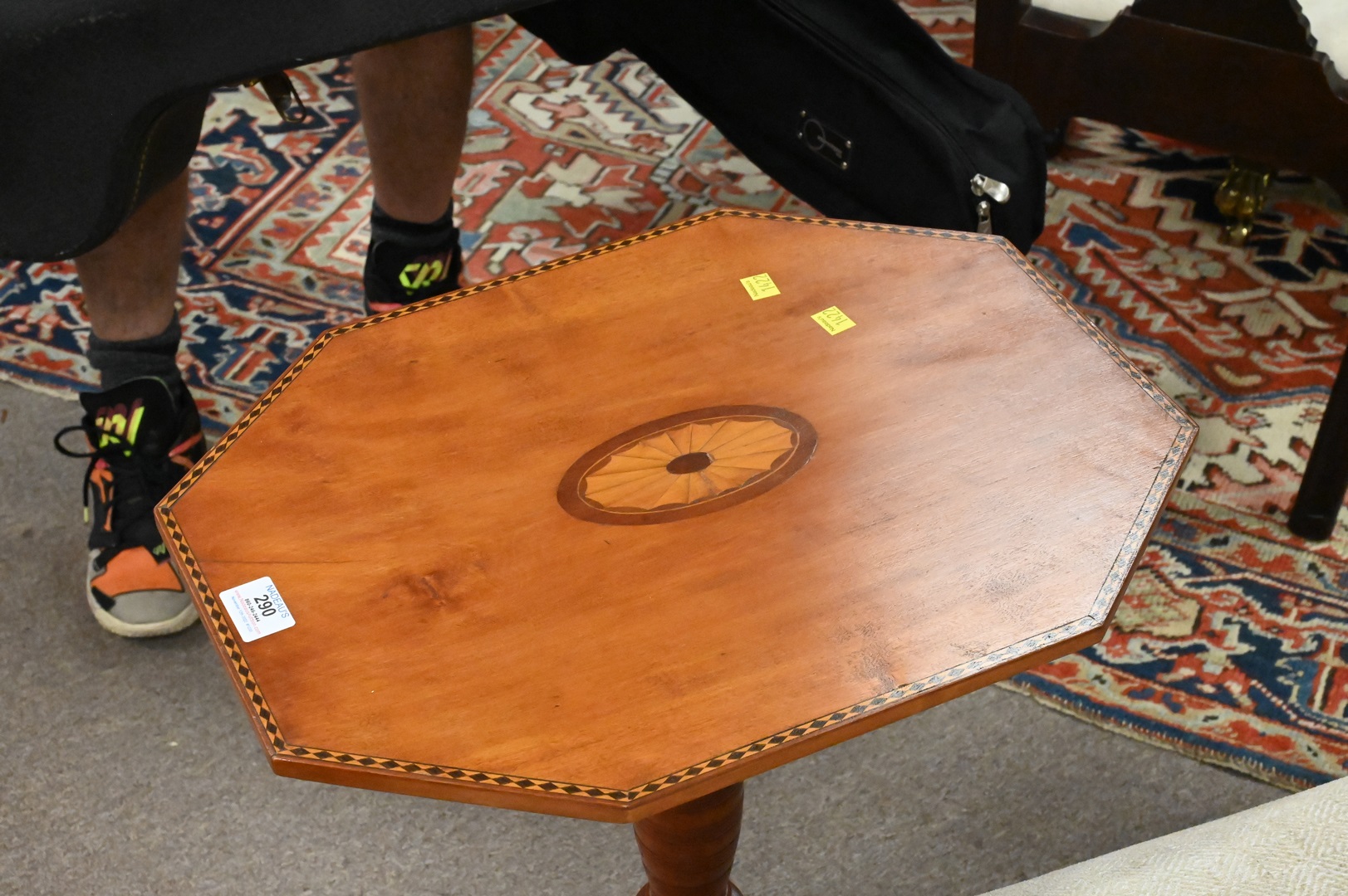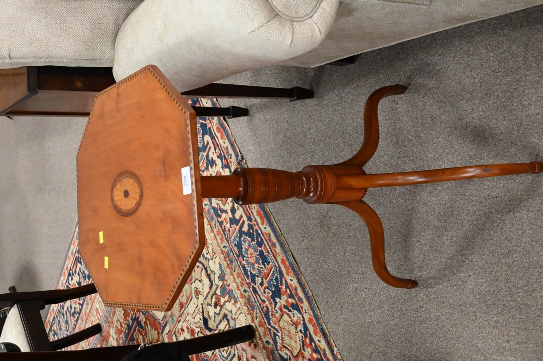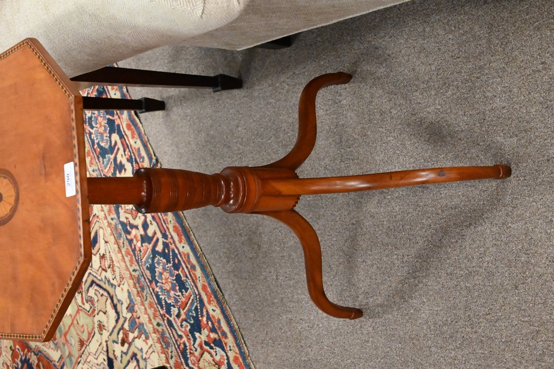 Federal Tip Candle Stand, having oval inlaid panel on urn turned shaft, circa 1800, height 28 inches, top 15″ x 20″.