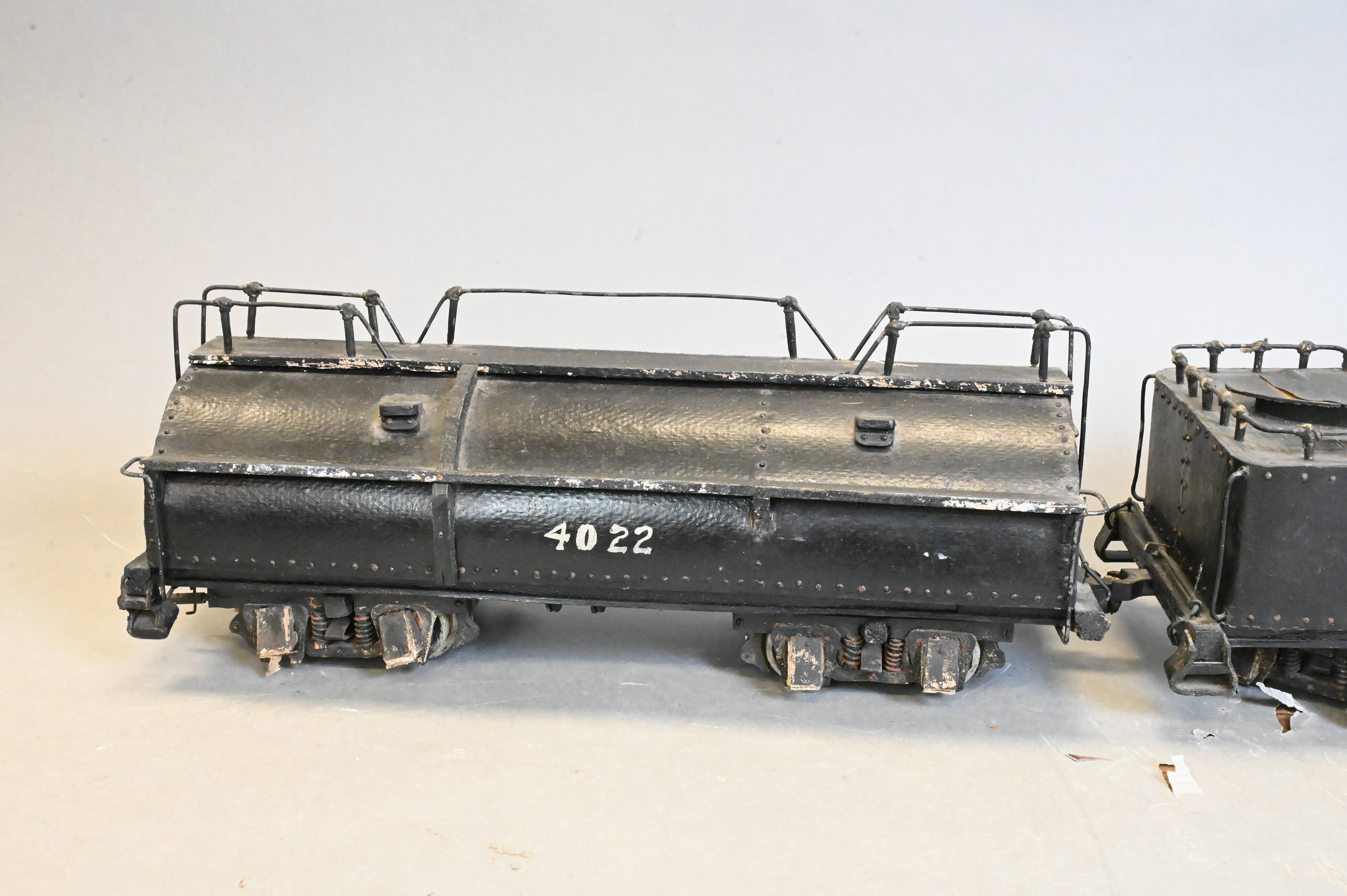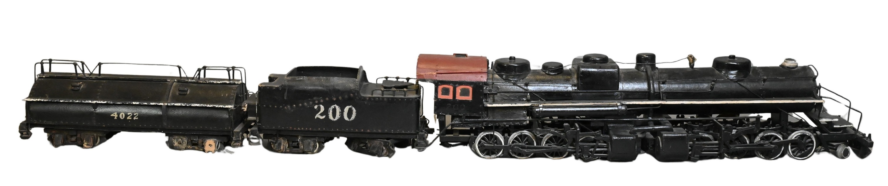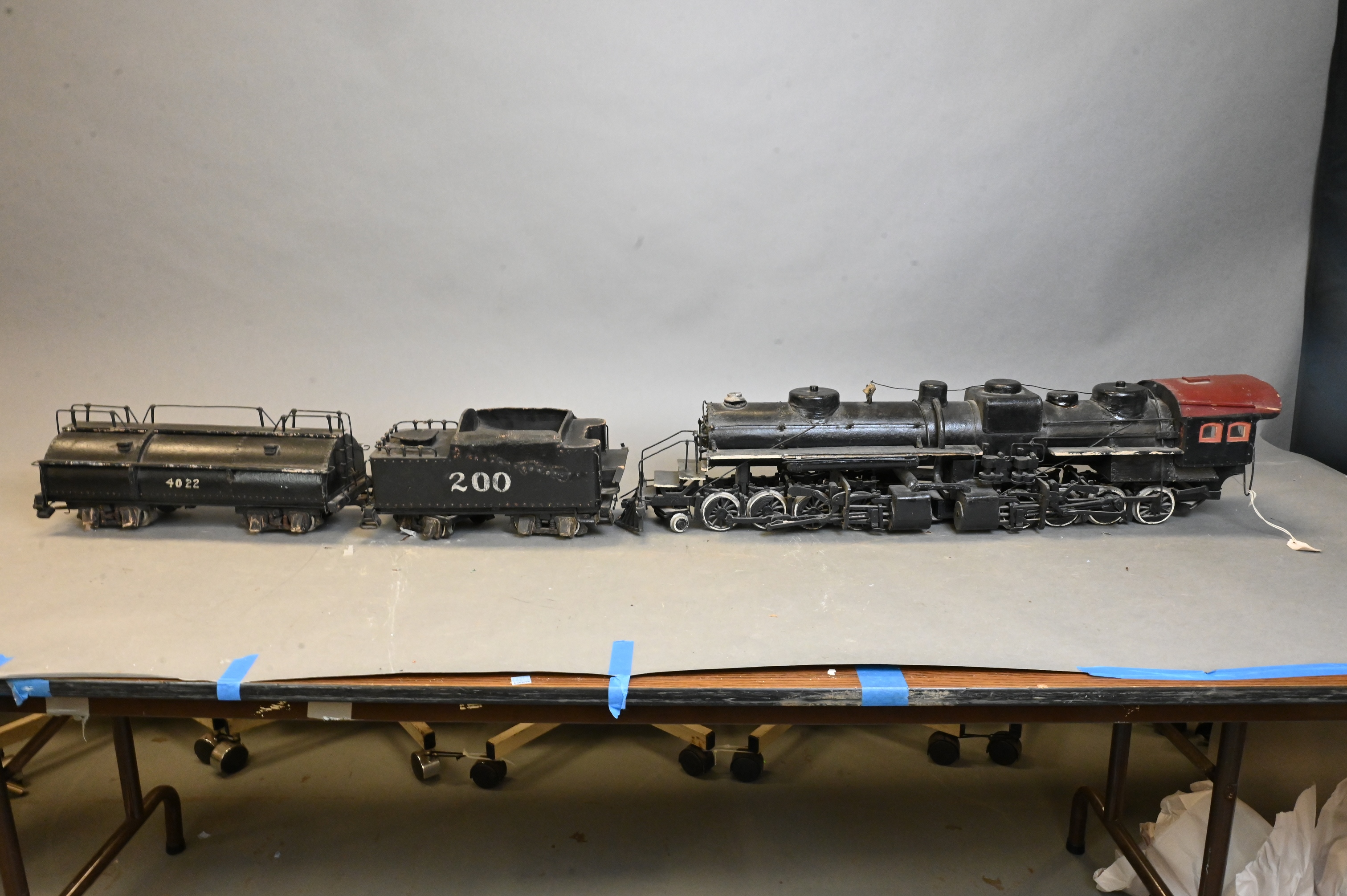 2-8-8-2 steam locomotive engine model in painted papier-mache, including locomotive, tender, and fuel car