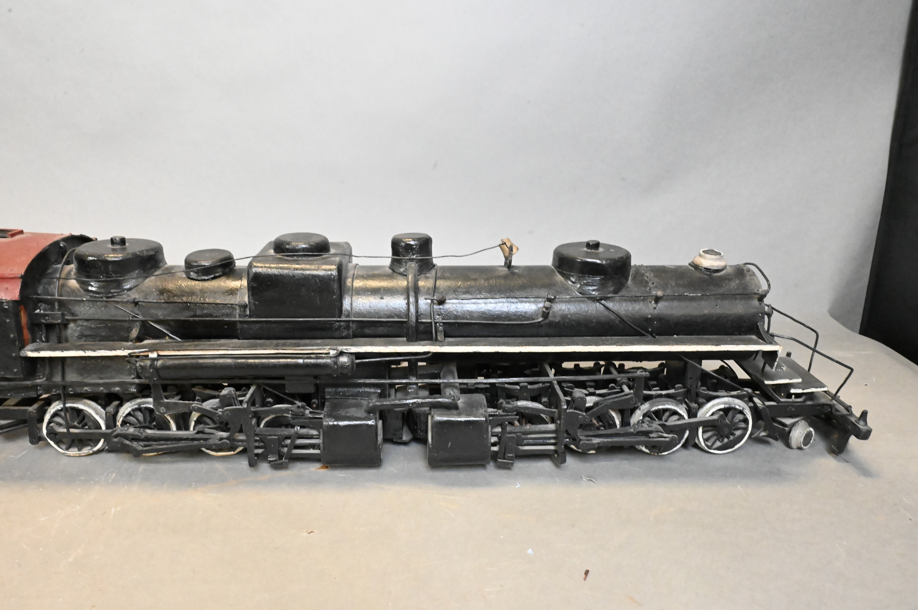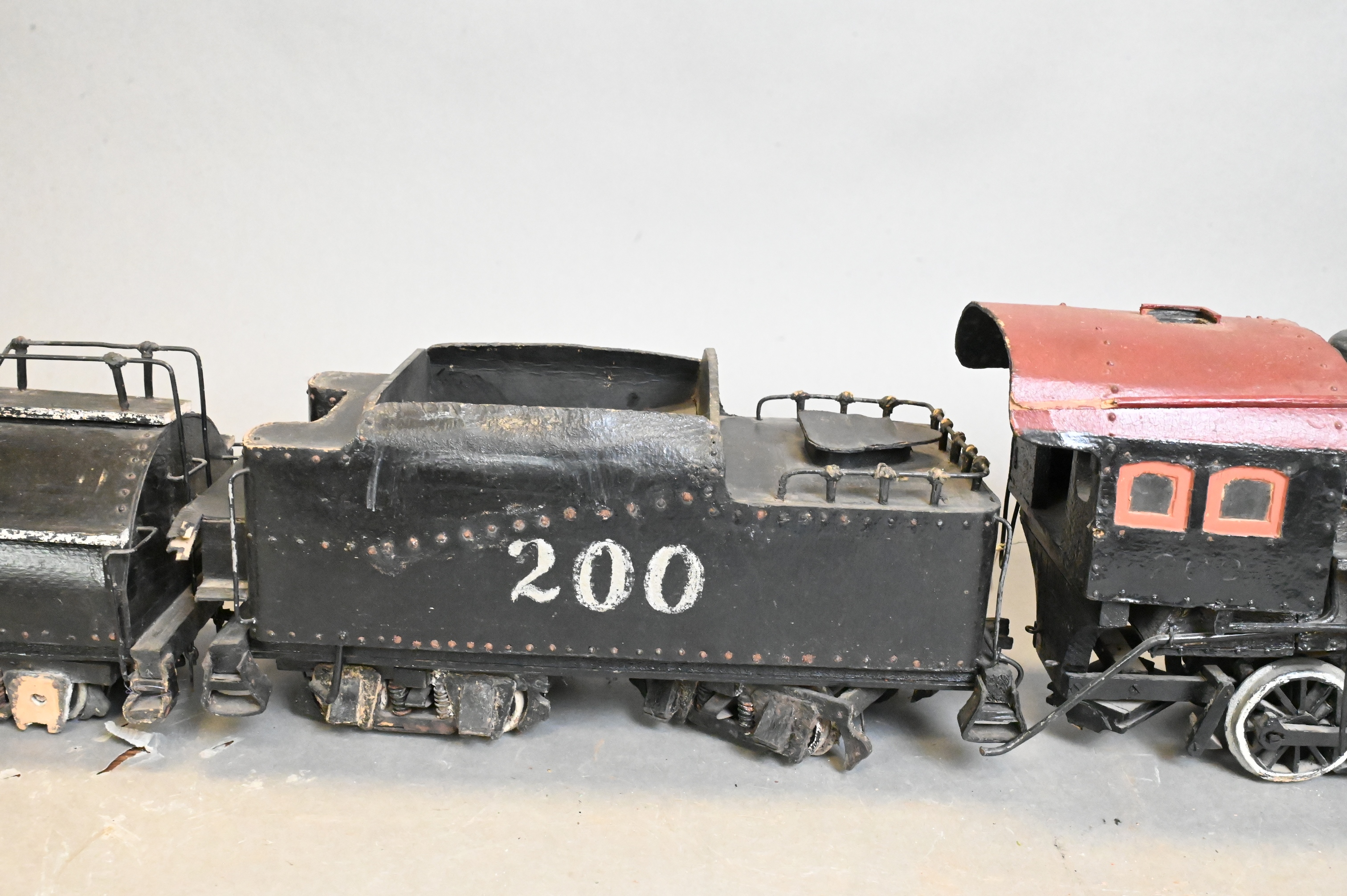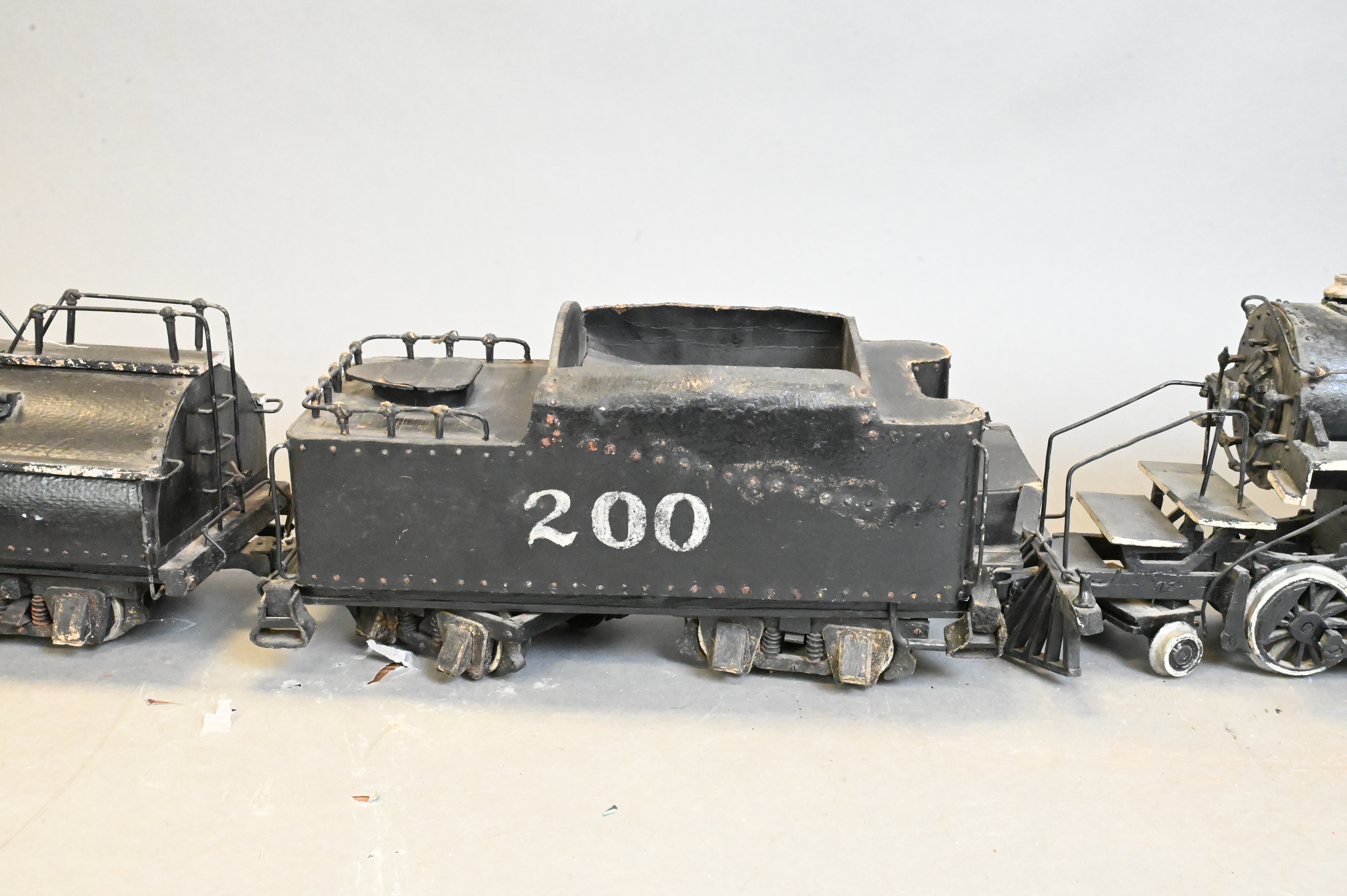 2-8-8-2 steam locomotive engine model in painted papier-mache, including locomotive, tender, and fuel car
