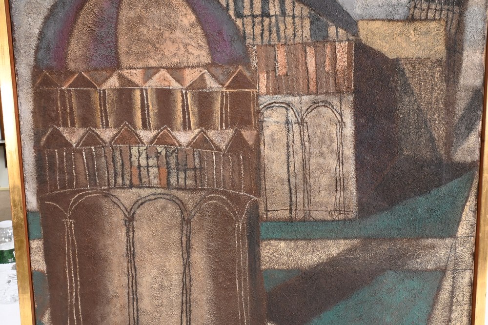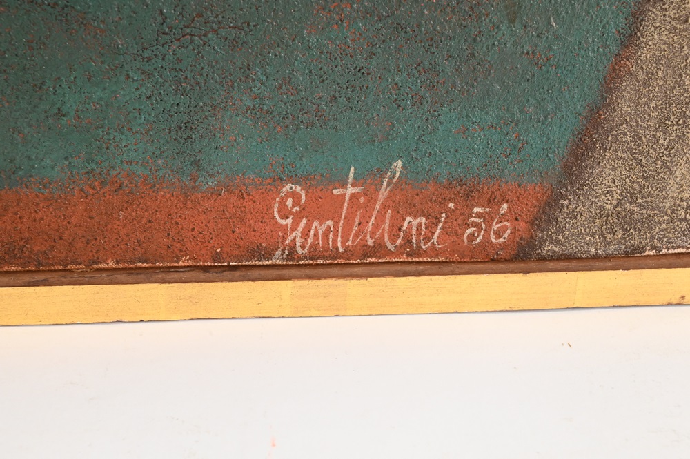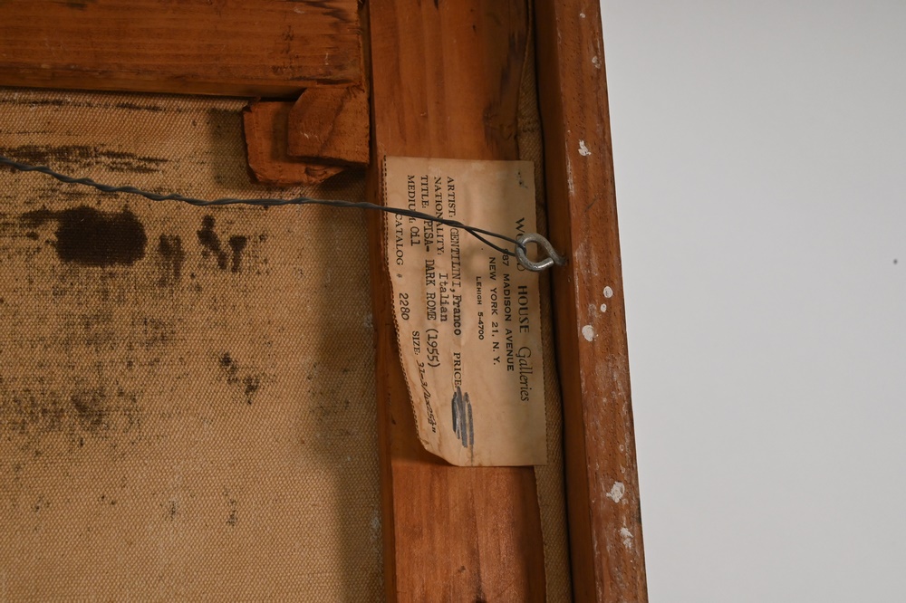 Franco Gentilini (1909 – 1981), Pisa-Dark Rome 1955, oil and sand on canvas, signed and dated lower right Gentilini 56′, 31 3/4″ x 25 1/2″. Provenance: World House Galleries label on back with catalog #2280. Galleria Maria stamp on canvas.