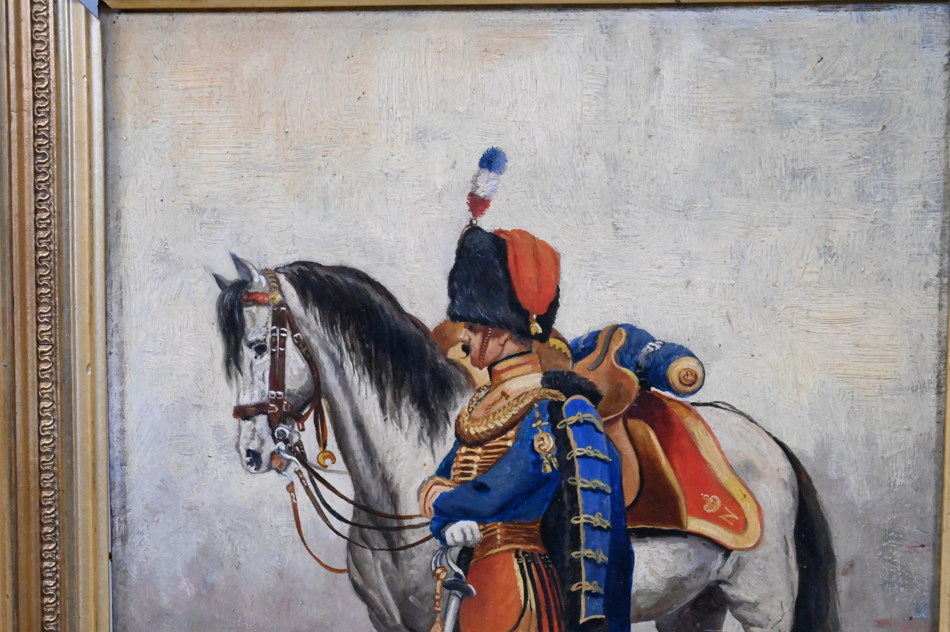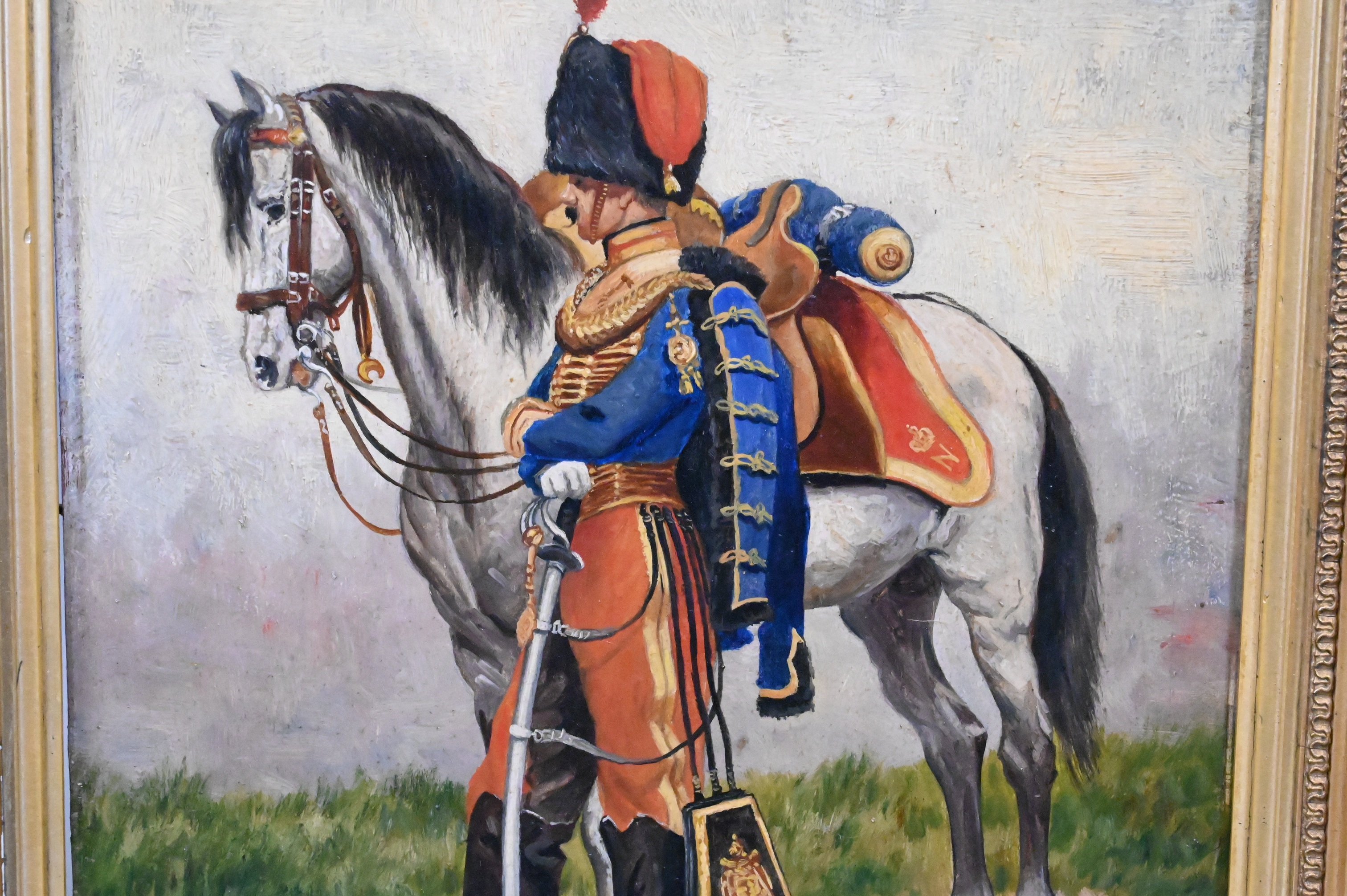 Depicting a French Hussar cavalry officer standing beside his grey charger, wearing a blue dolman with heavy gold frogging, red overalls, tall shako with tricolor plume, and holding a curved sabre—uniform elements associated with the light cavalry regiments of the Napoleonic era; Detaille’s precise rendering of regimental dress and equipment reflects his celebrated mastery of military portraiture and historical accuracy