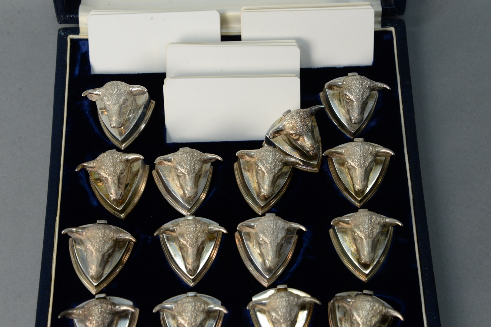 Lot 290: Jocelyn Burton Set of Fourteen Sterling Silver Bull Head Place Card Holders in original Jocelyn Burton fitted box, fitted for 13,…