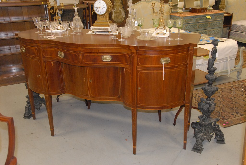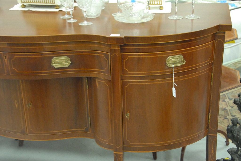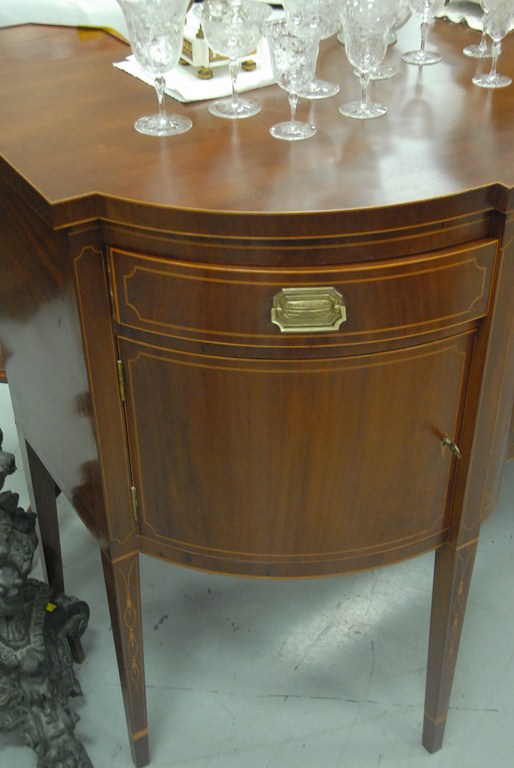Margolis mahogany sideboard having serpentine top over conforming case with one long drawer over four doors and two bottle drawers set on square tapered legs, the whole with double line inlays and bell flower inlays on legs, signed Margolis with brass plaque. ht. 41in. wd. 78in. dp. 23in.