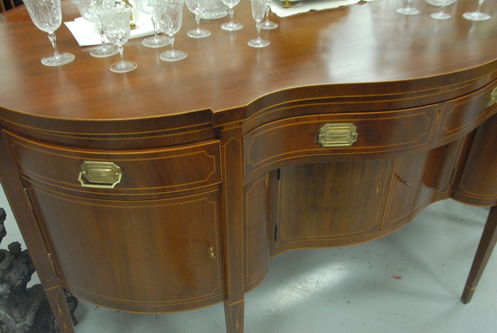 Lot 290: Margolis mahogany sideboard having serpentine top over conforming case with one long drawer over four doors and two bottle drawers s…