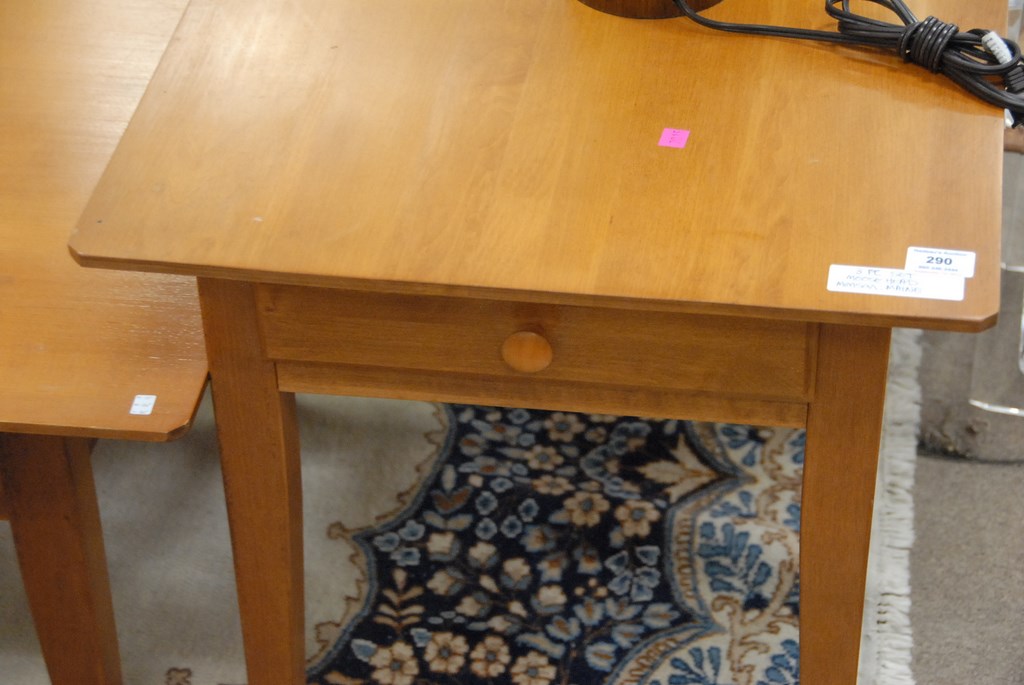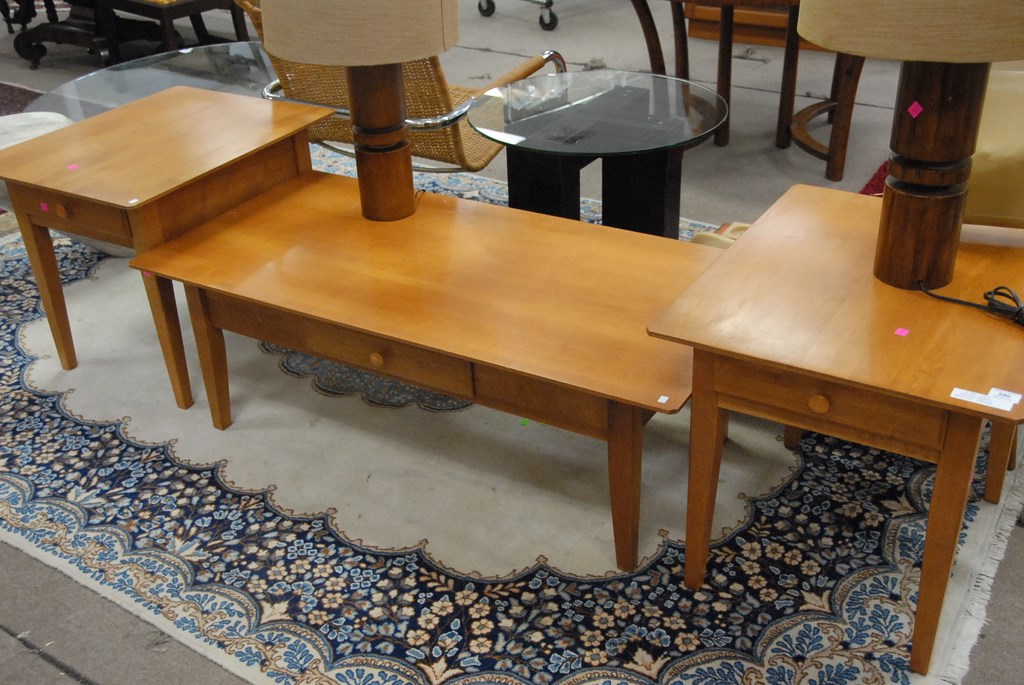 Lot 290: Moosehead three piece set to include coffee table and two end tables along with two lamps and round glass top side table.