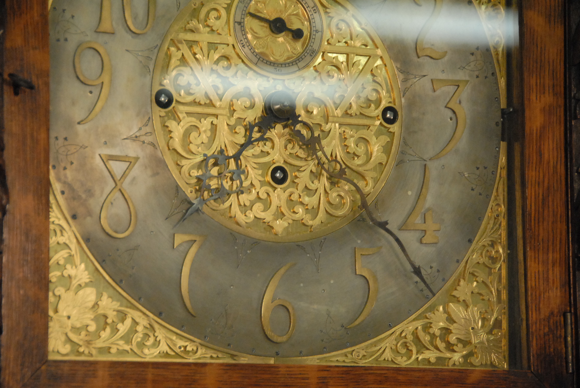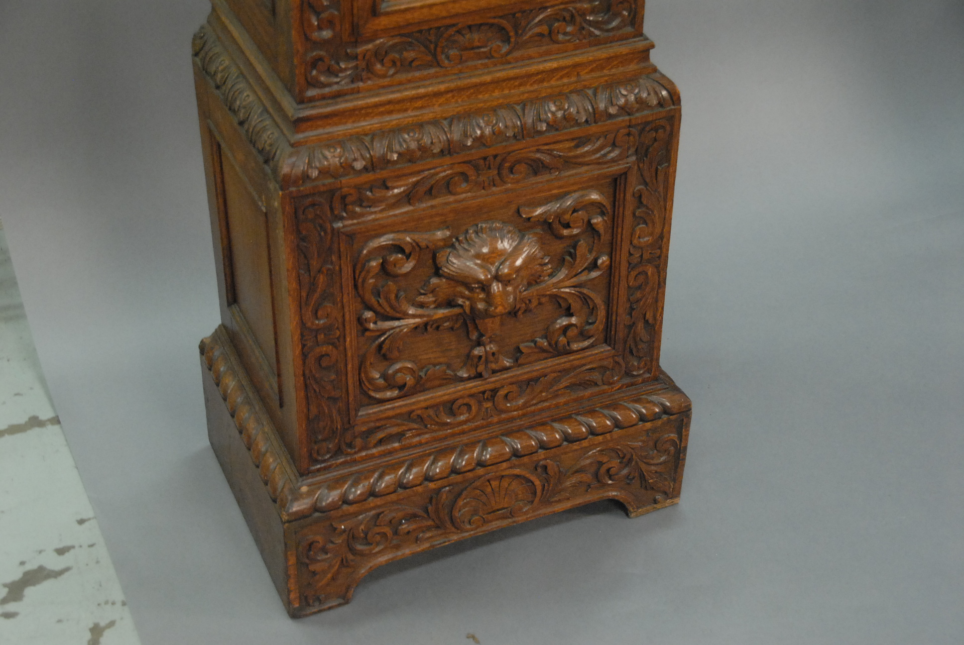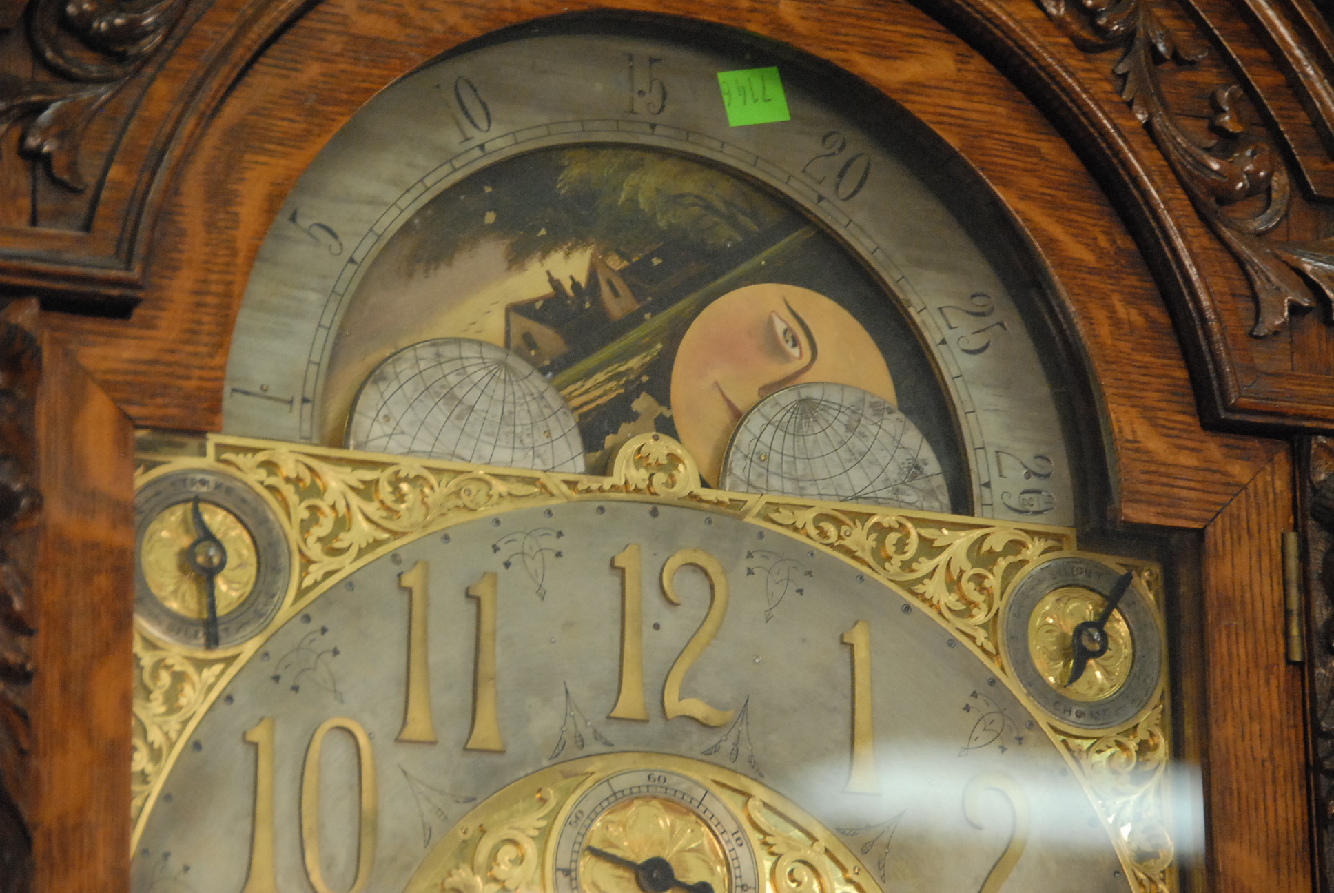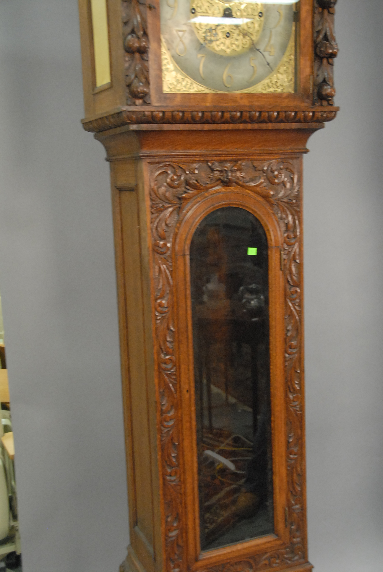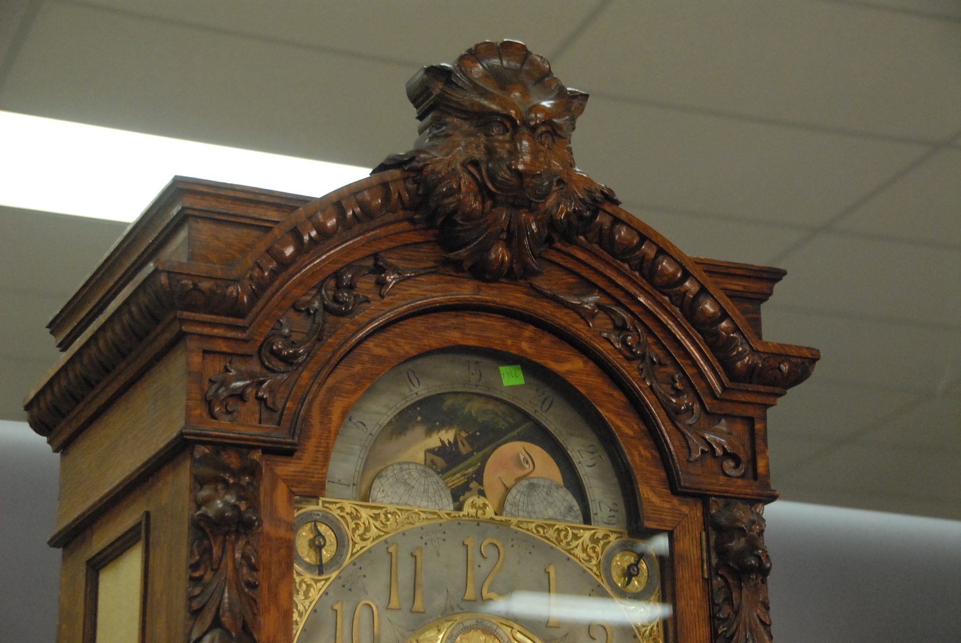 Lot 290: Oak tall clock with lion mask and scroll carving overall, all set on carved base, Elliot brass works with brass dial with moon phases with rare Elliot’s patent piano board chimes. ht. 99in.
