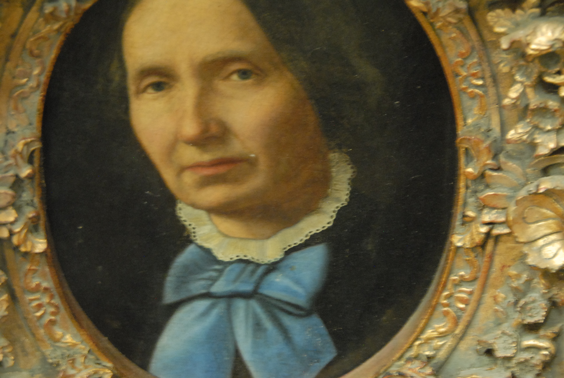 Oil on canvas portrait of woman with blue bow, 10 x 8.