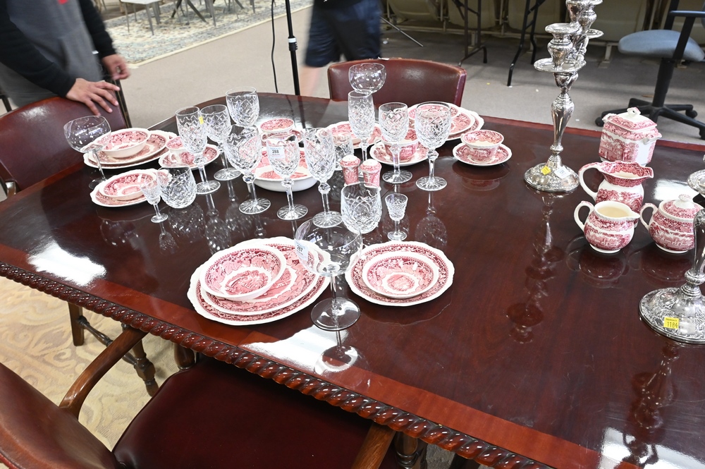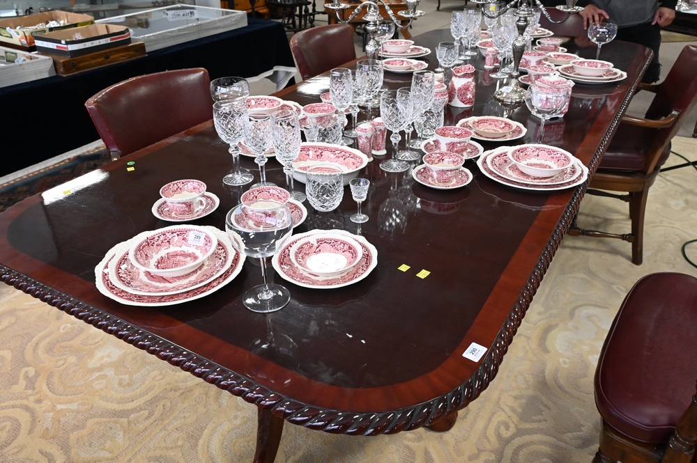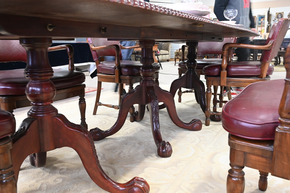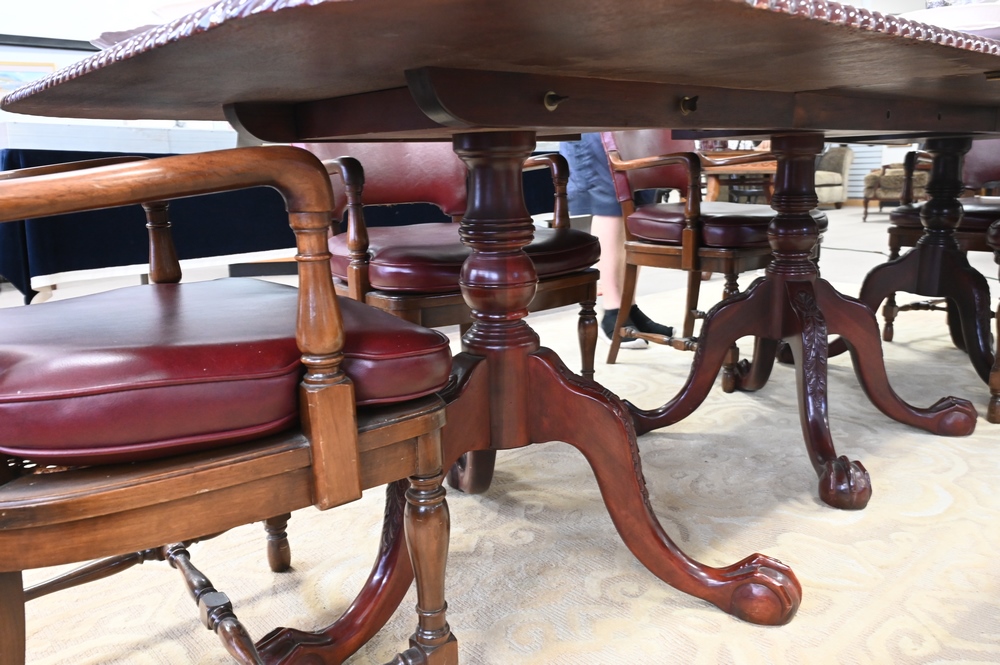 Lot 290: Reproduction Mahogany Triple Pedestal Dining Table, having rope edge and carved pedestals with ball and claw feet, along with two 20…