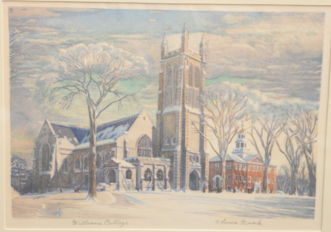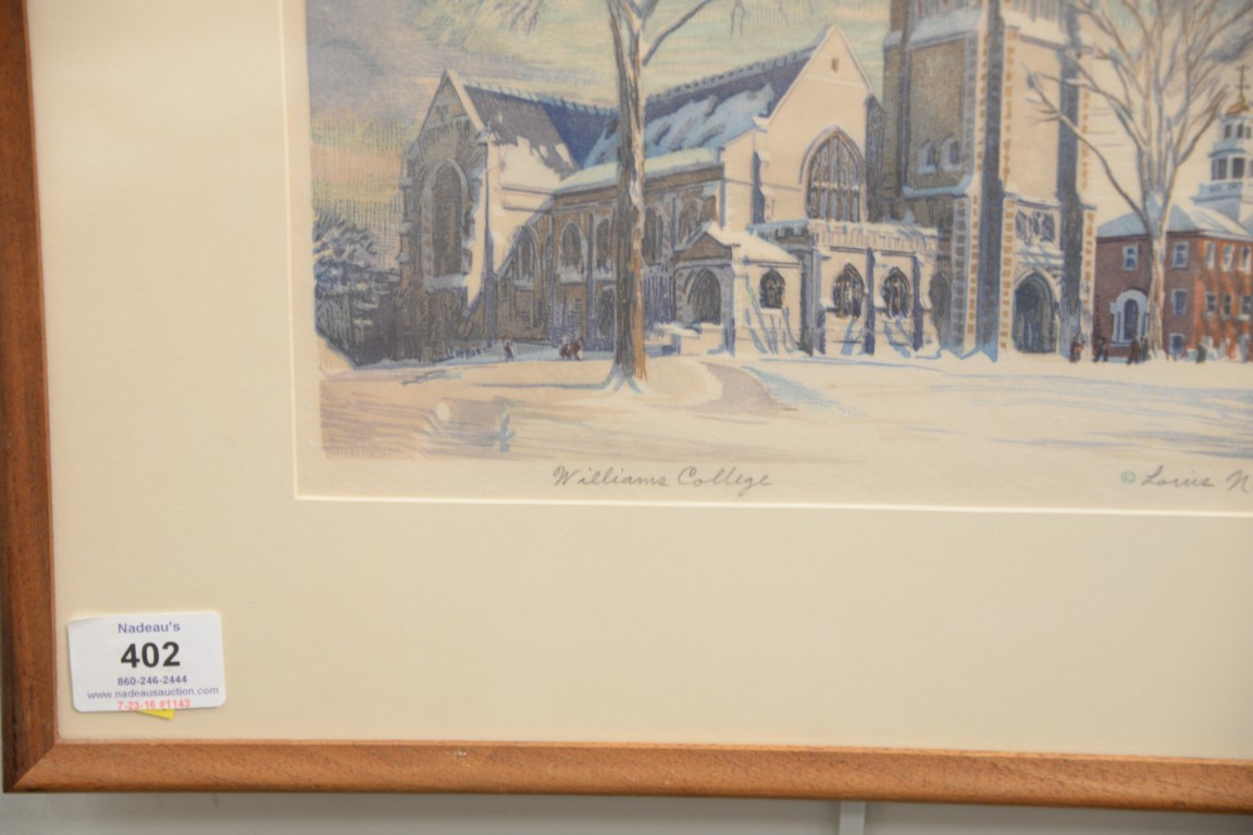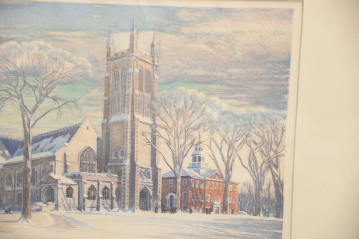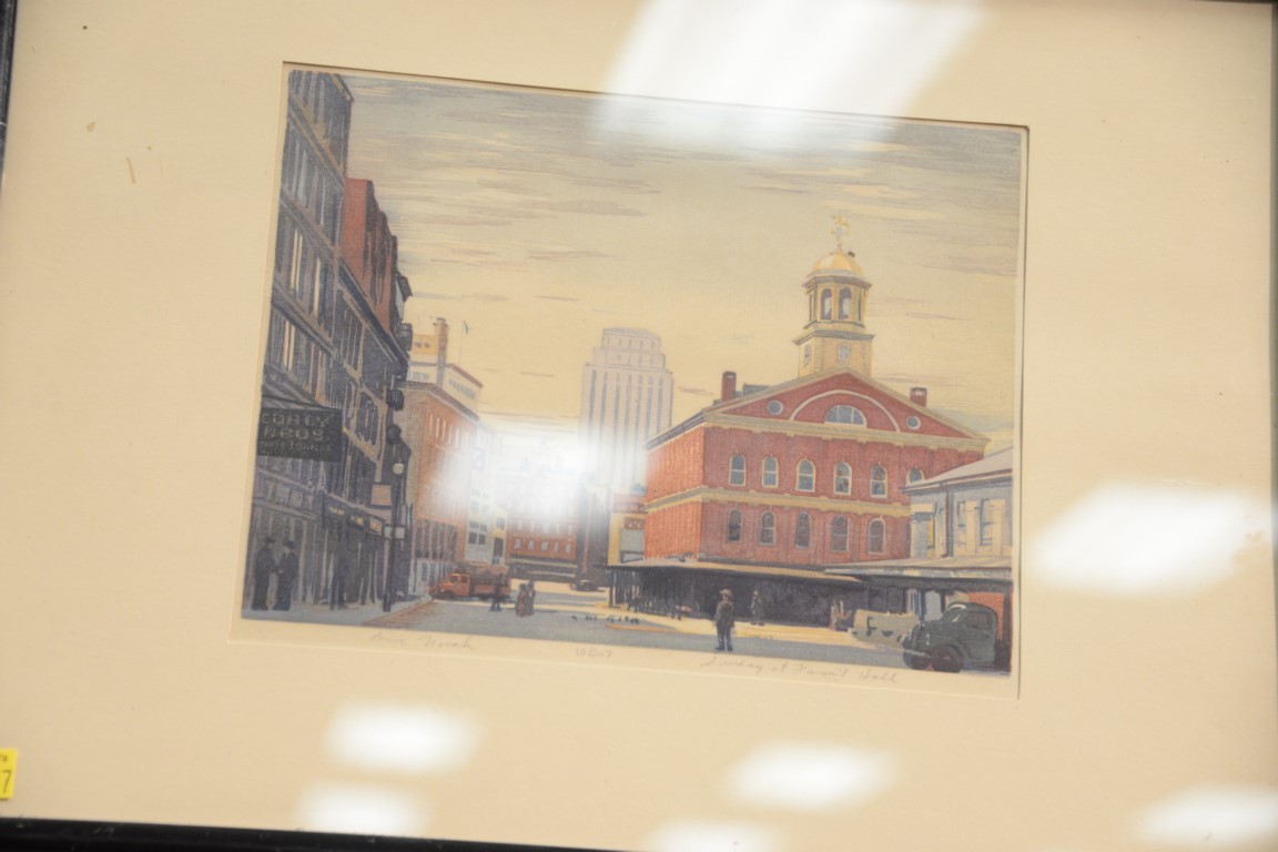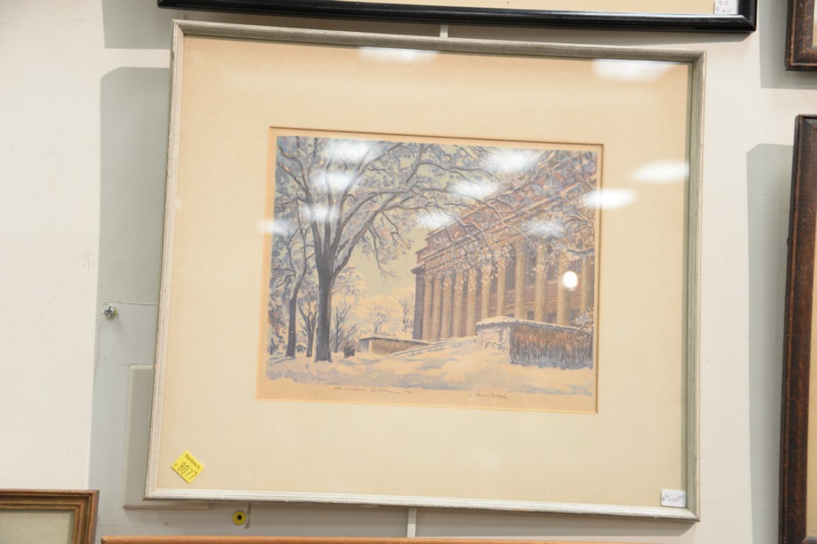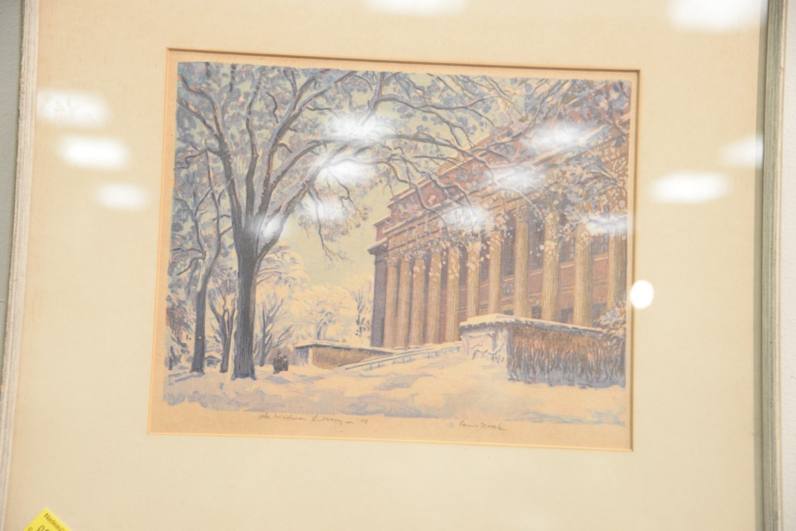 Six framed pieces including Ernest George 1839-1922 Westminster 1884 signed in pencil and plate, Staples Inn Holborn London, Graveyard, and three Louis Novak 1903-1983 woodblock prints. plate size 7 1/2 x 10 1/2 to 9 x 12 1/2.