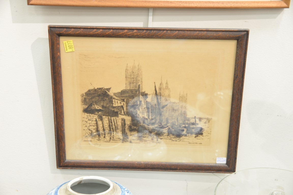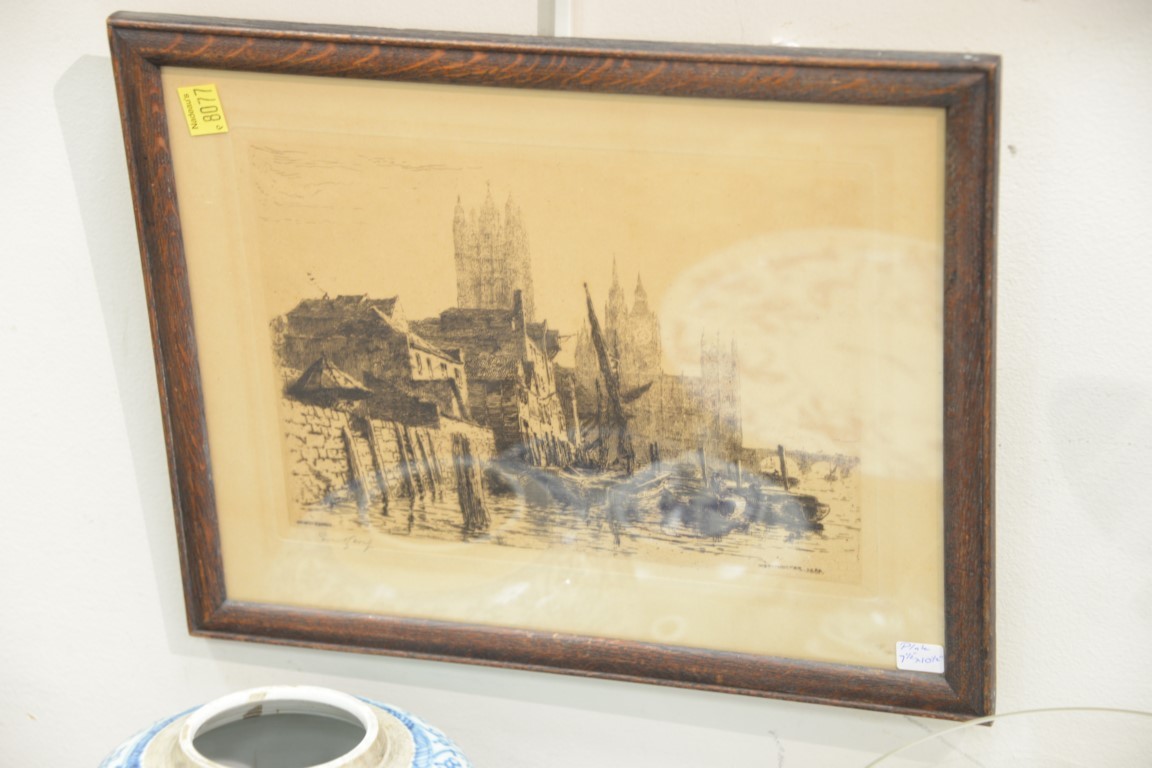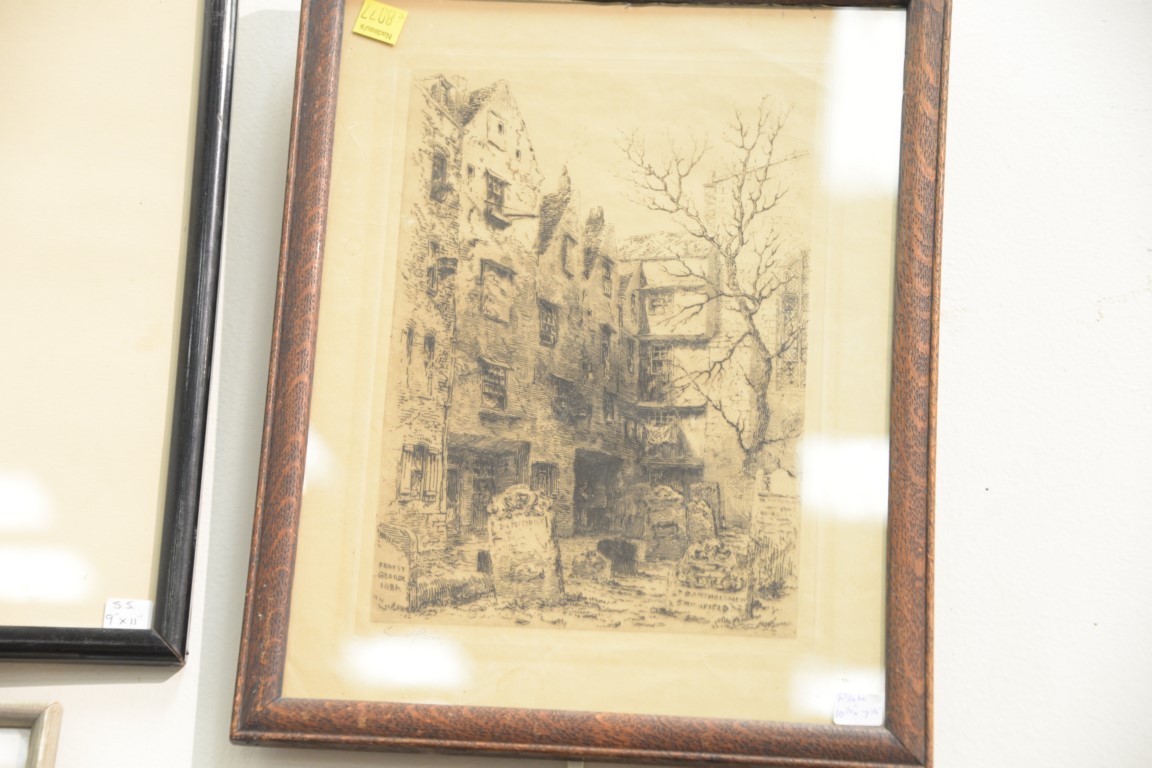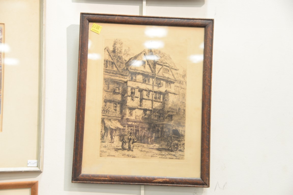 Lot 290: Six framed pieces including Ernest George 1839-1922 Westminster 1884 signed in pencil and plate, Staples Inn Holborn London, Grave…