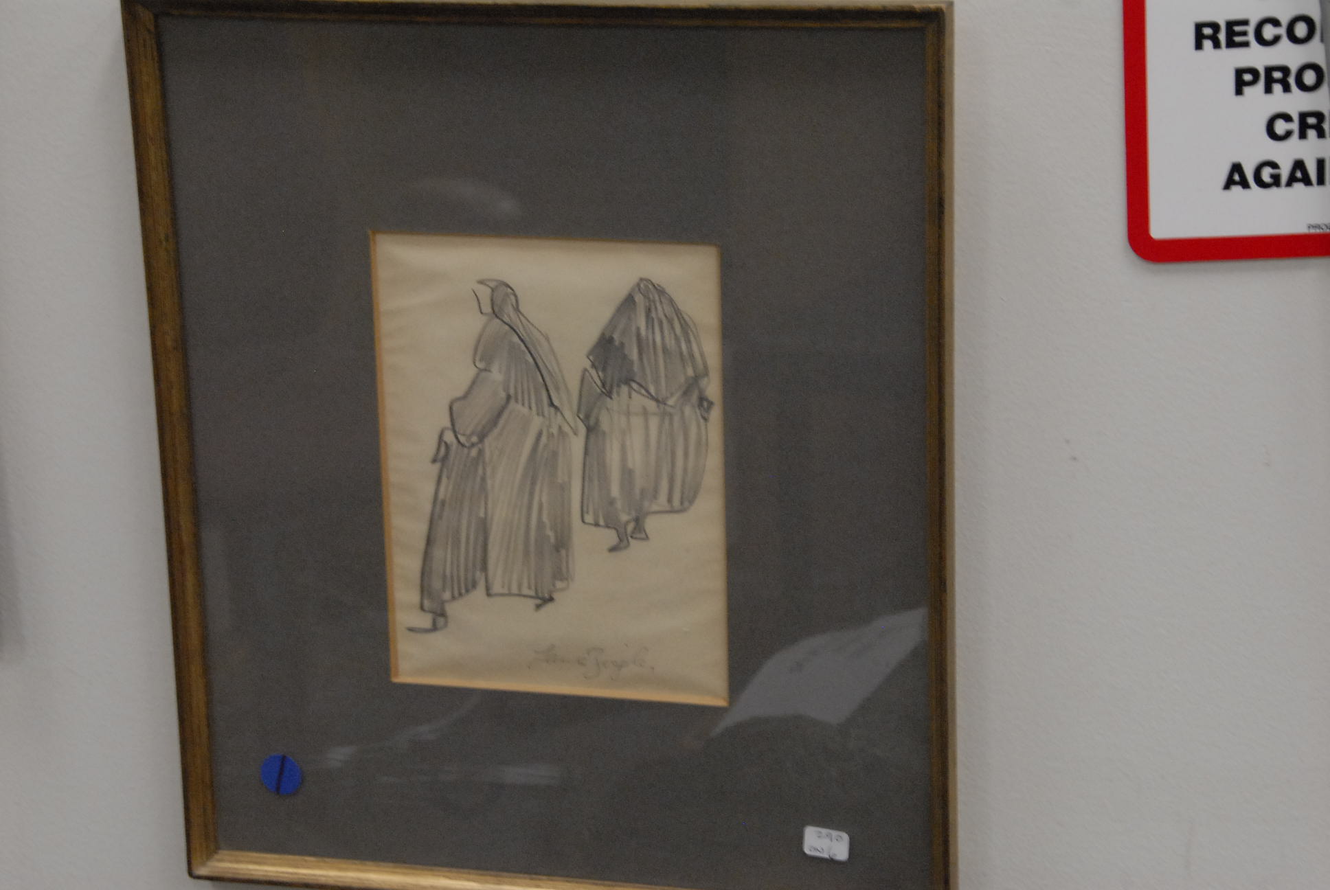 Six framed pieces, one pencil sketch signed, prints, shadow box frame, gouda print of a woman fashion print