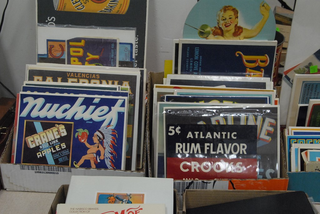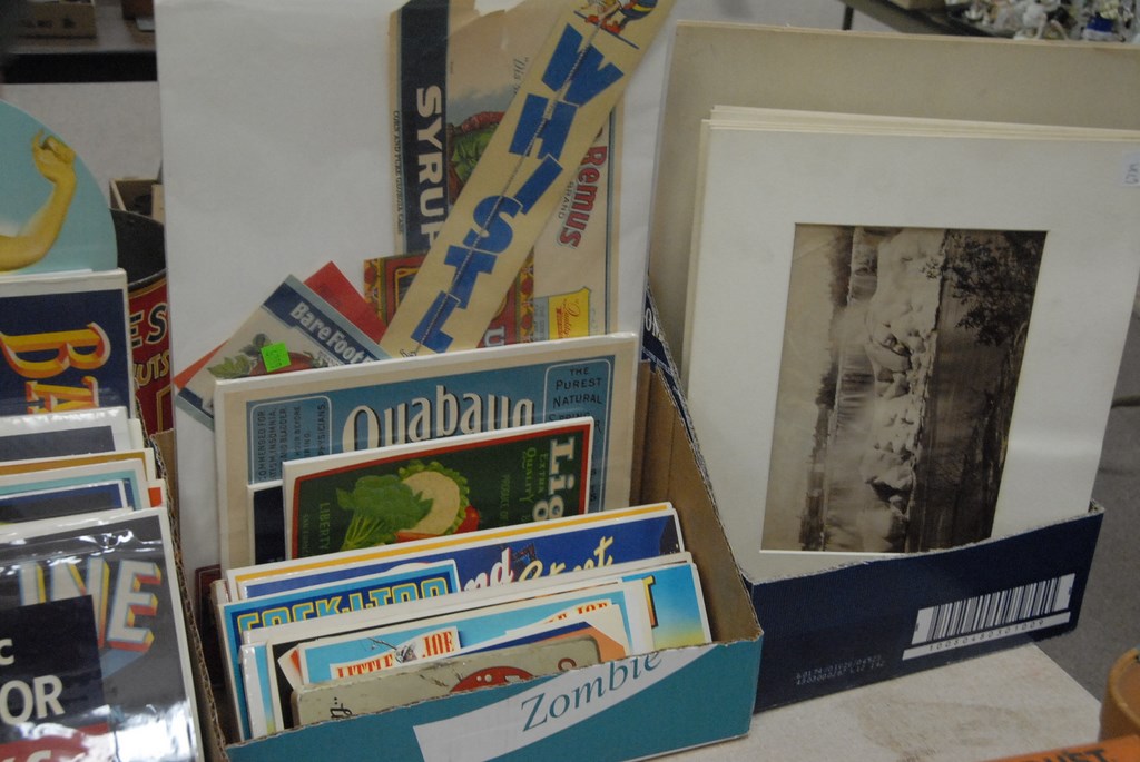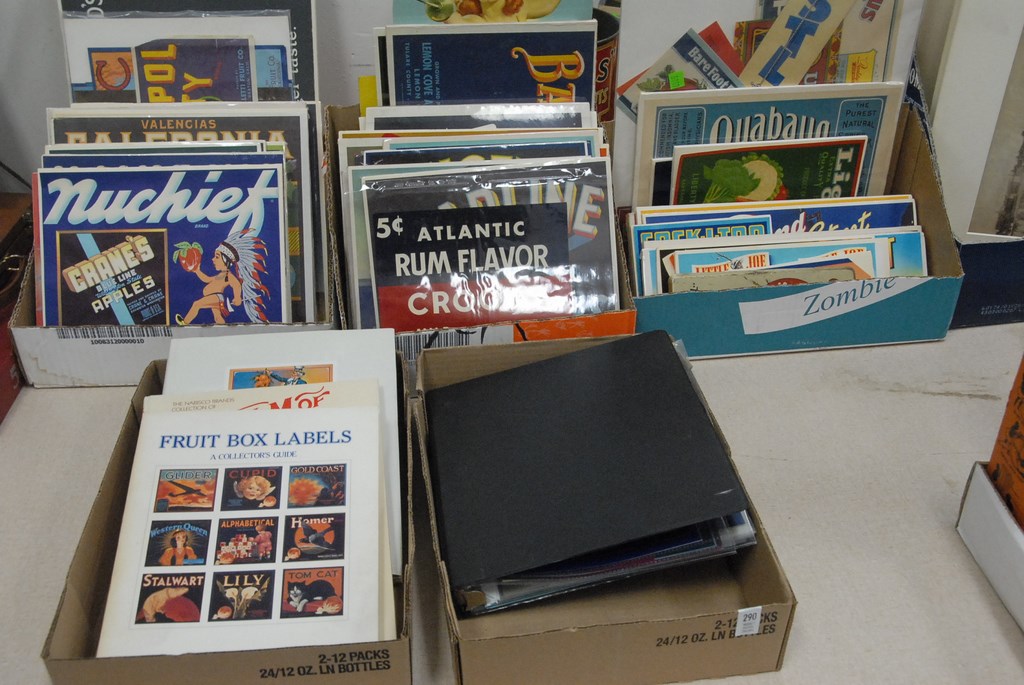 Lot 290: Six tray lots: fruit box labels, notebook: advertising papers in folder and mounted on foam board and box of photographs.