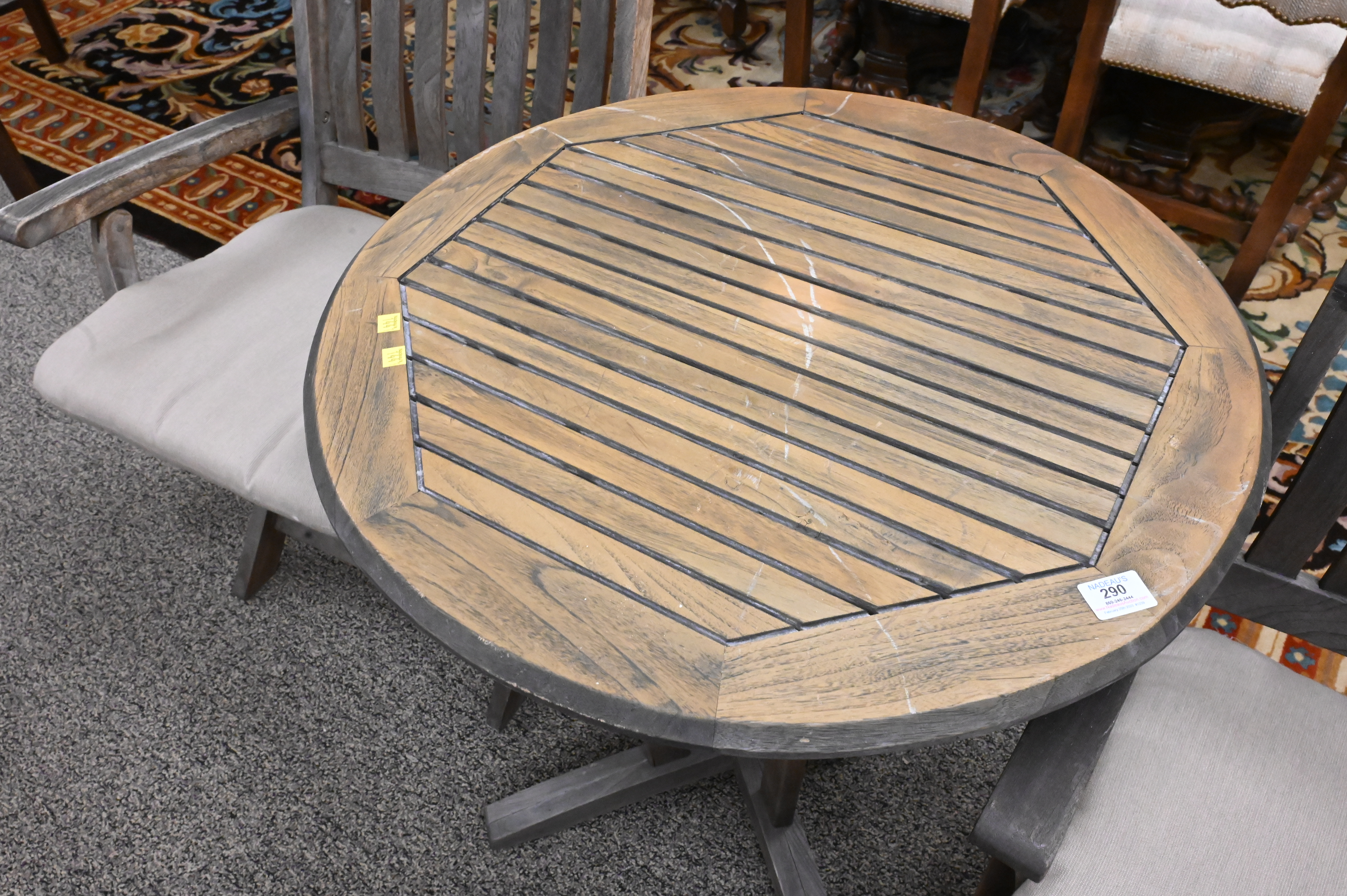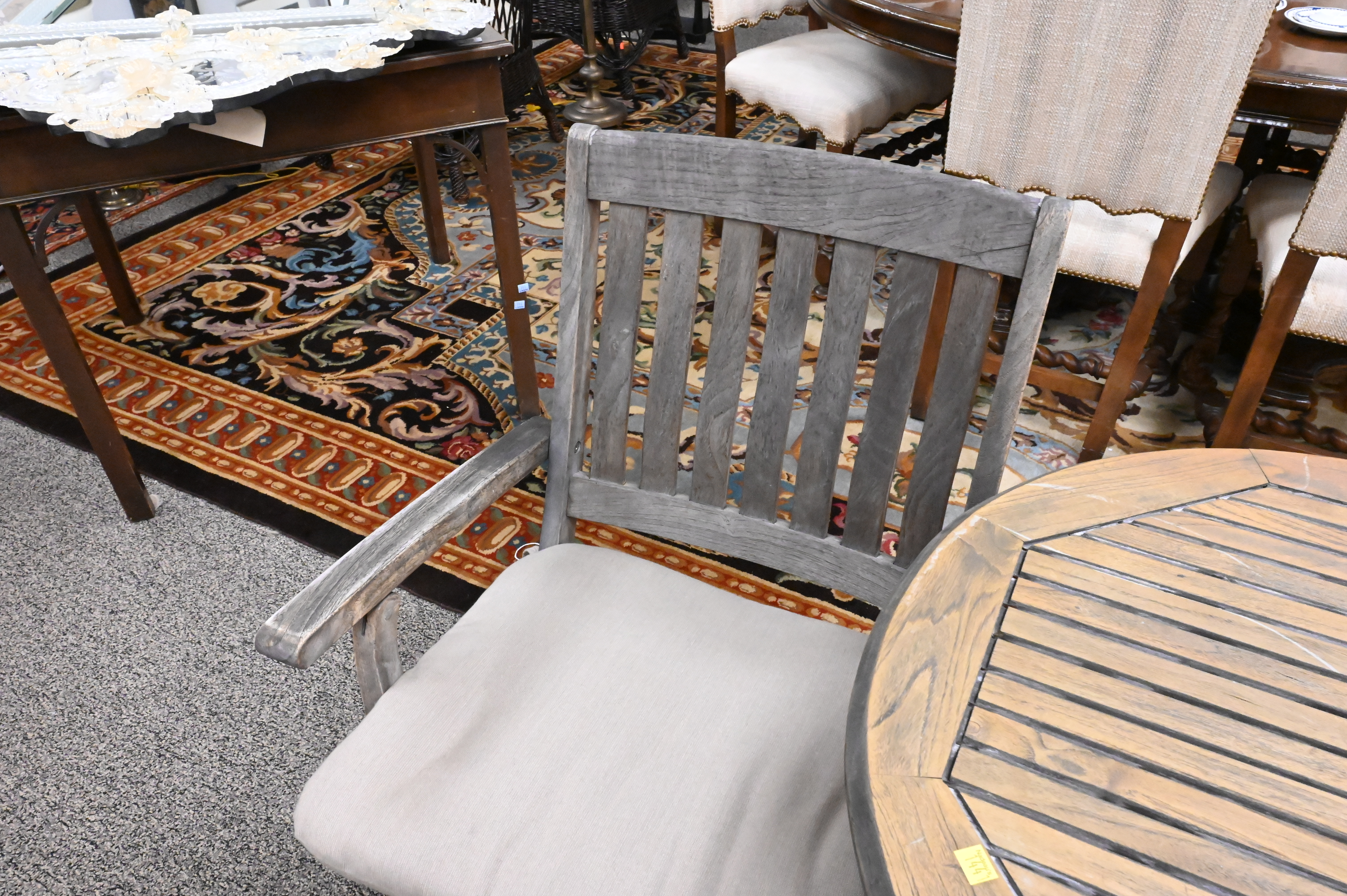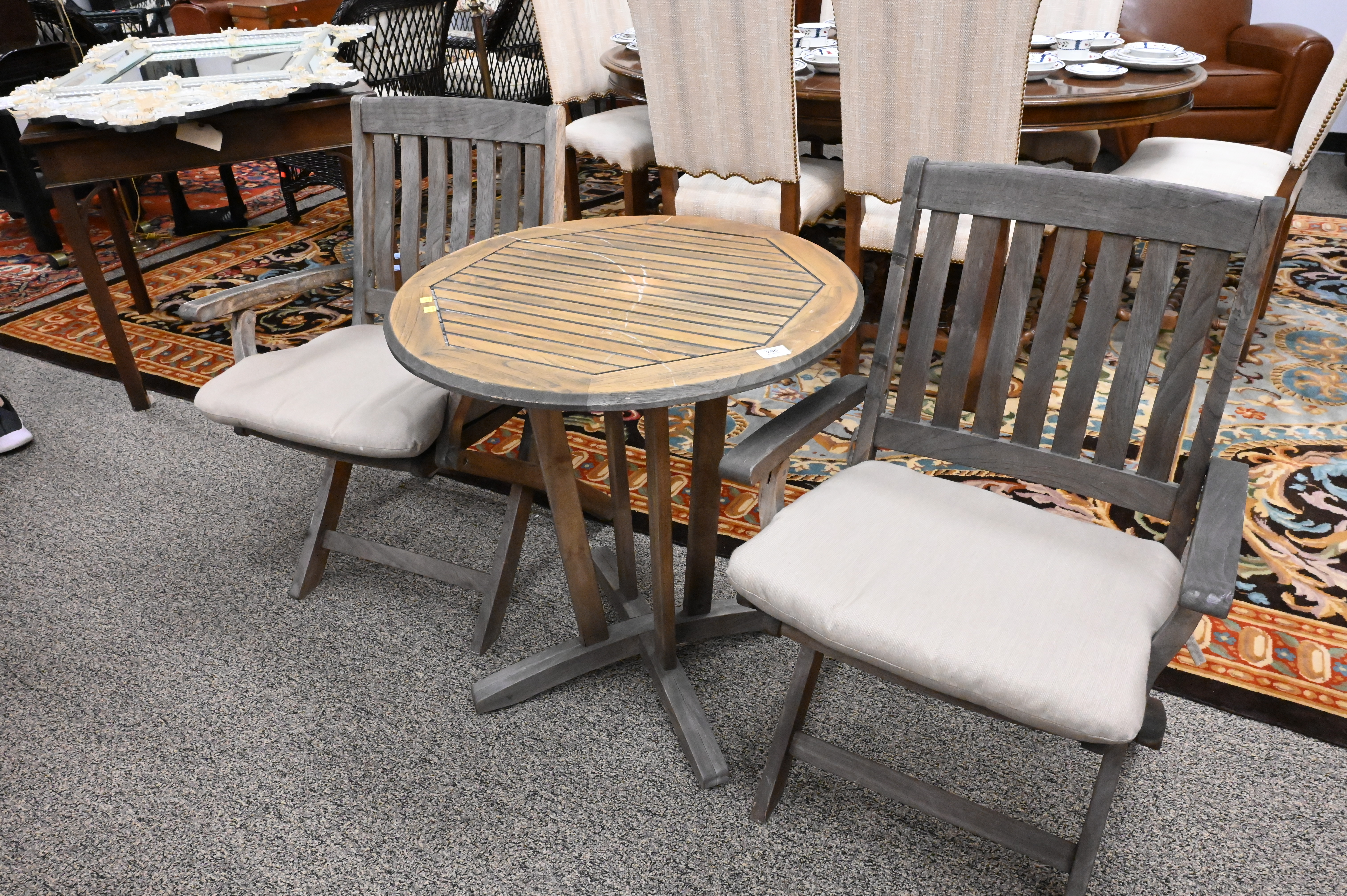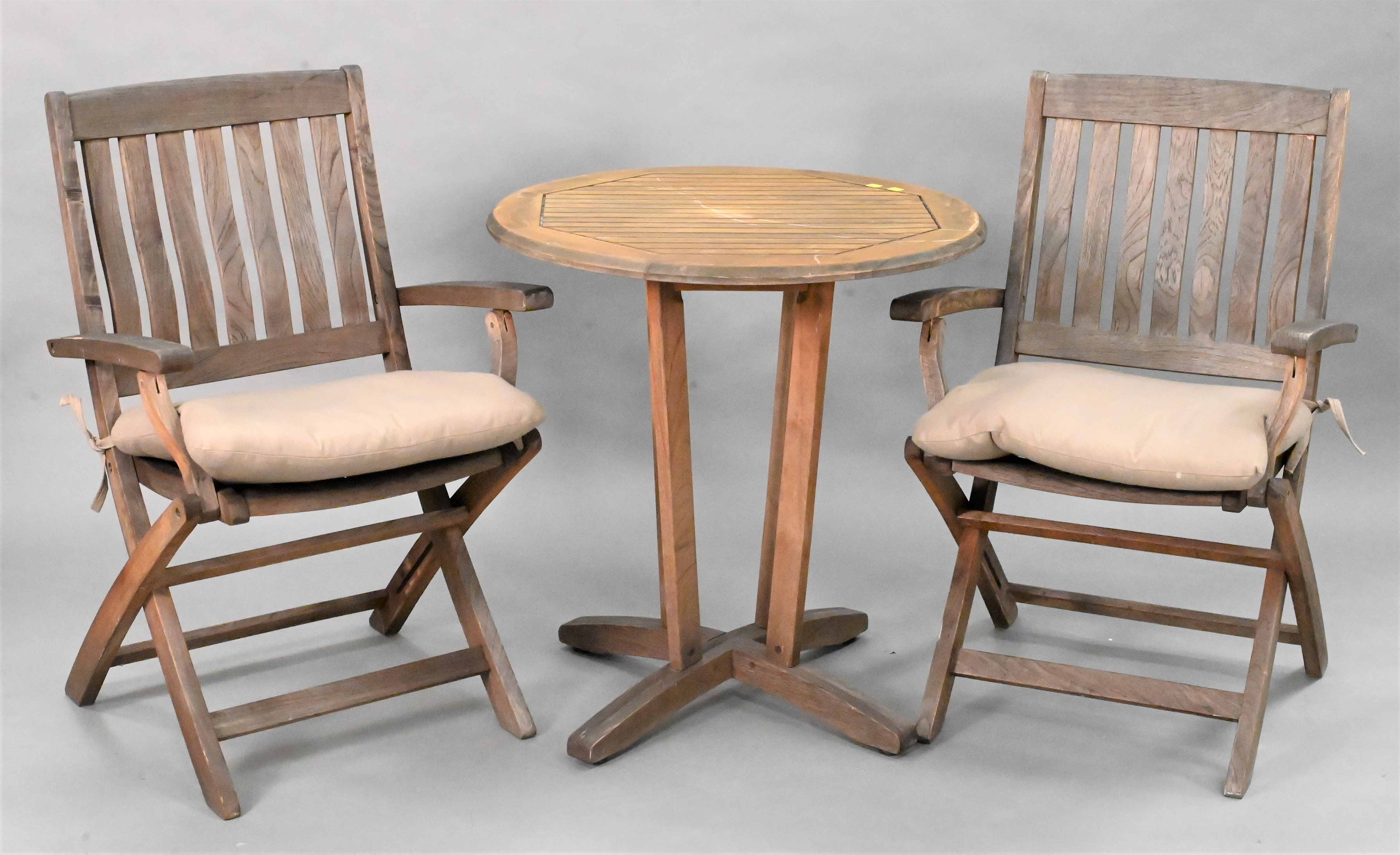 Teak Three Piece Set, to include two arm chairs along with a small round table, height 29 inches, diameter 28 inches