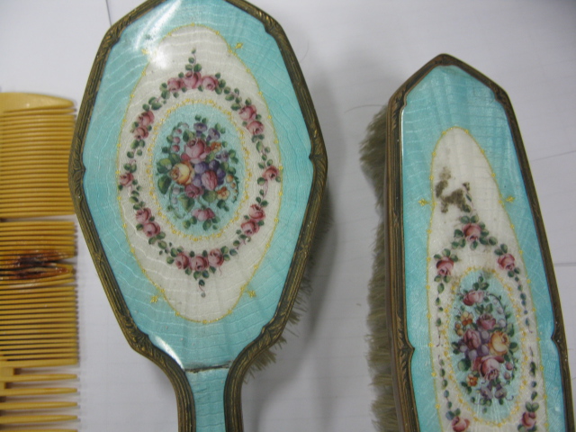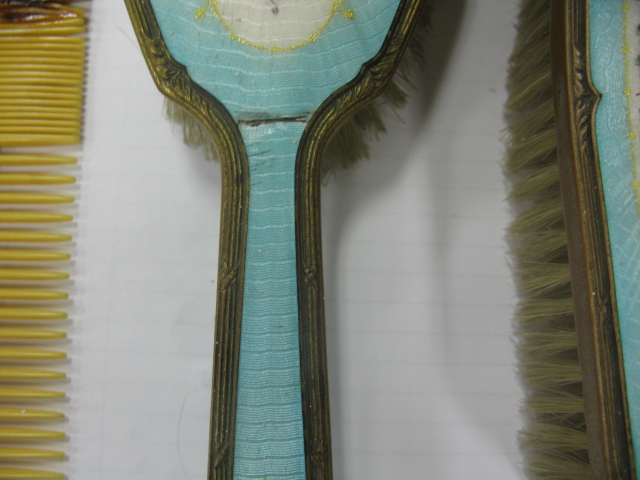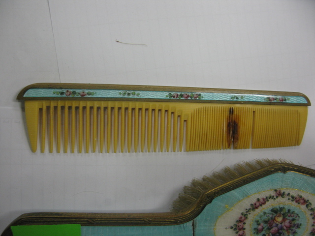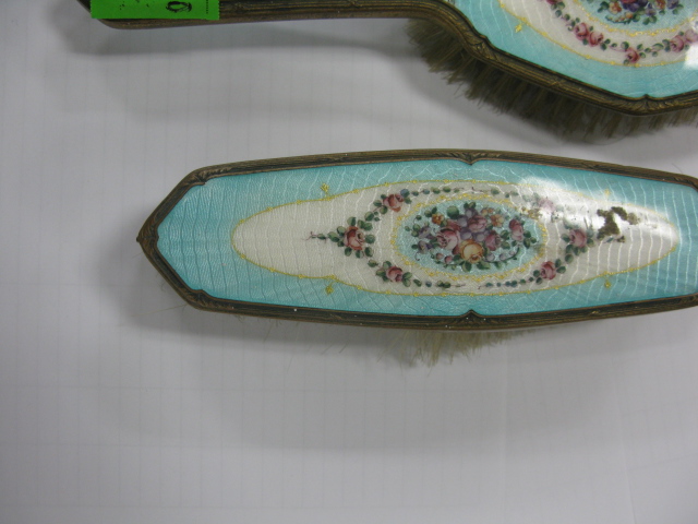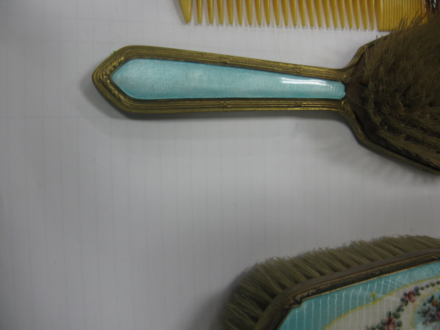 Three piece enameled dresser set, two brushes and comb, one brush has damage on the handle.