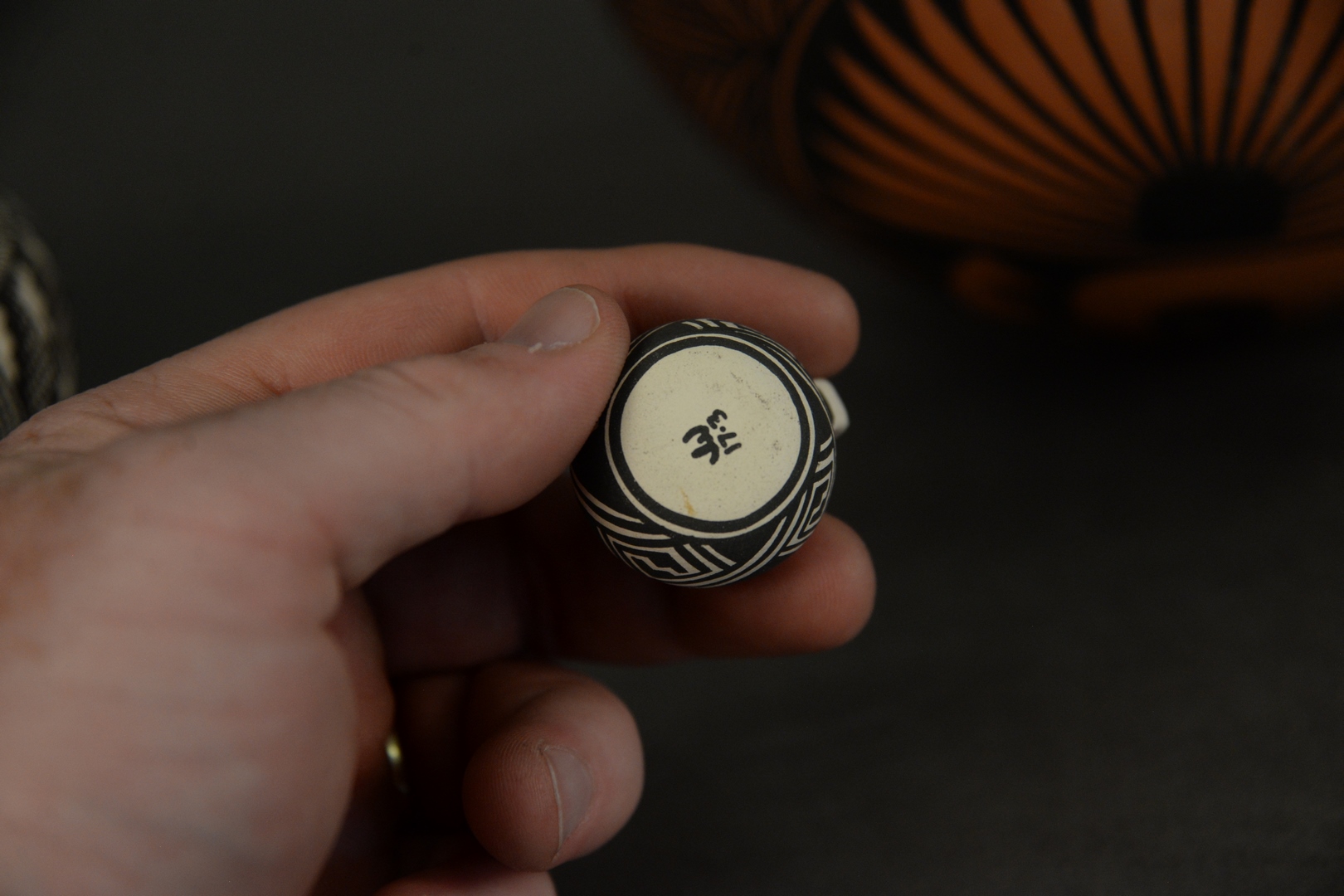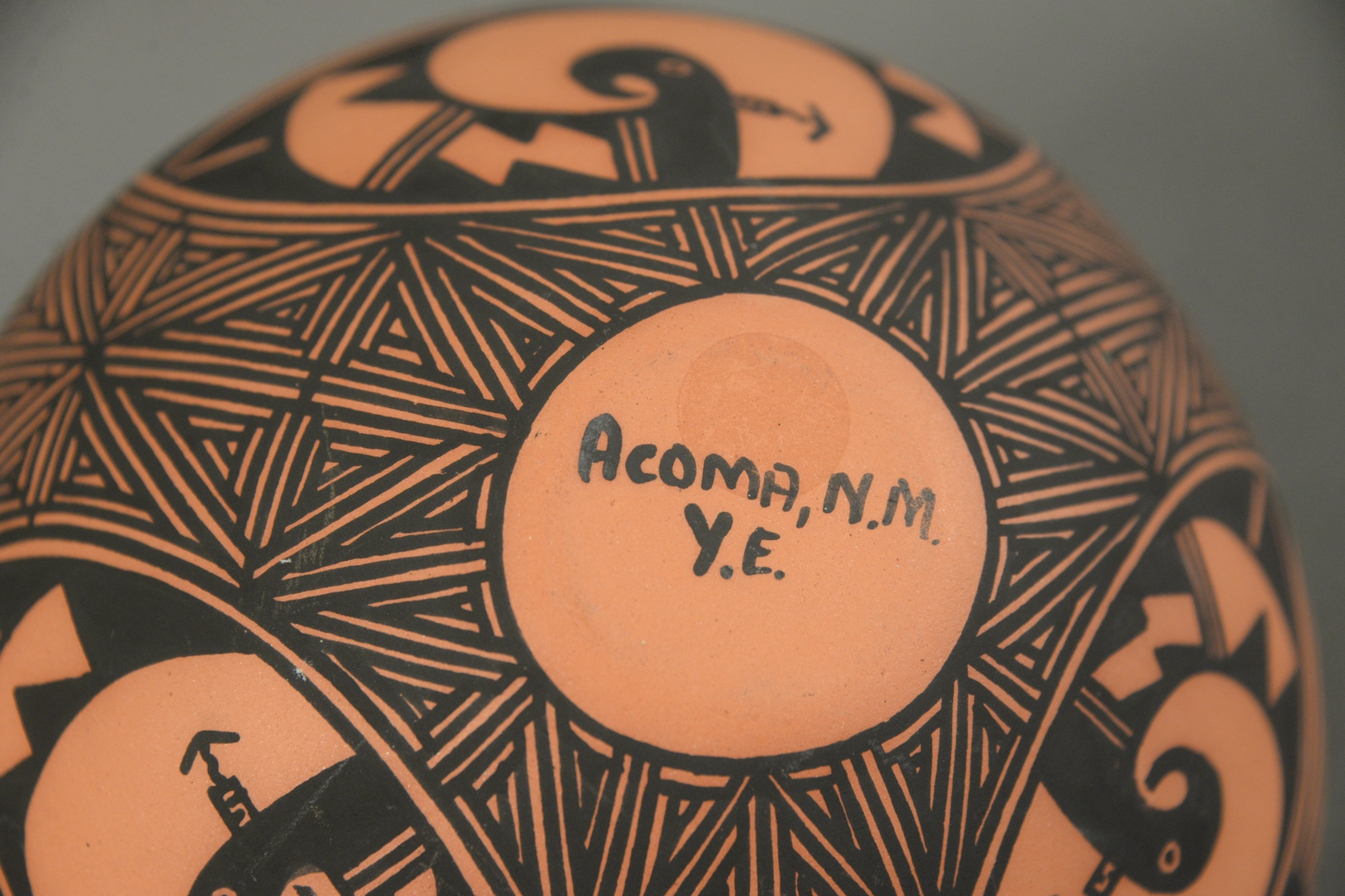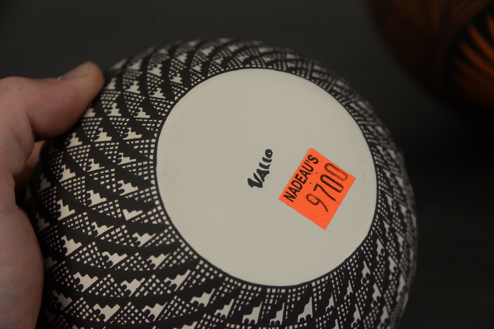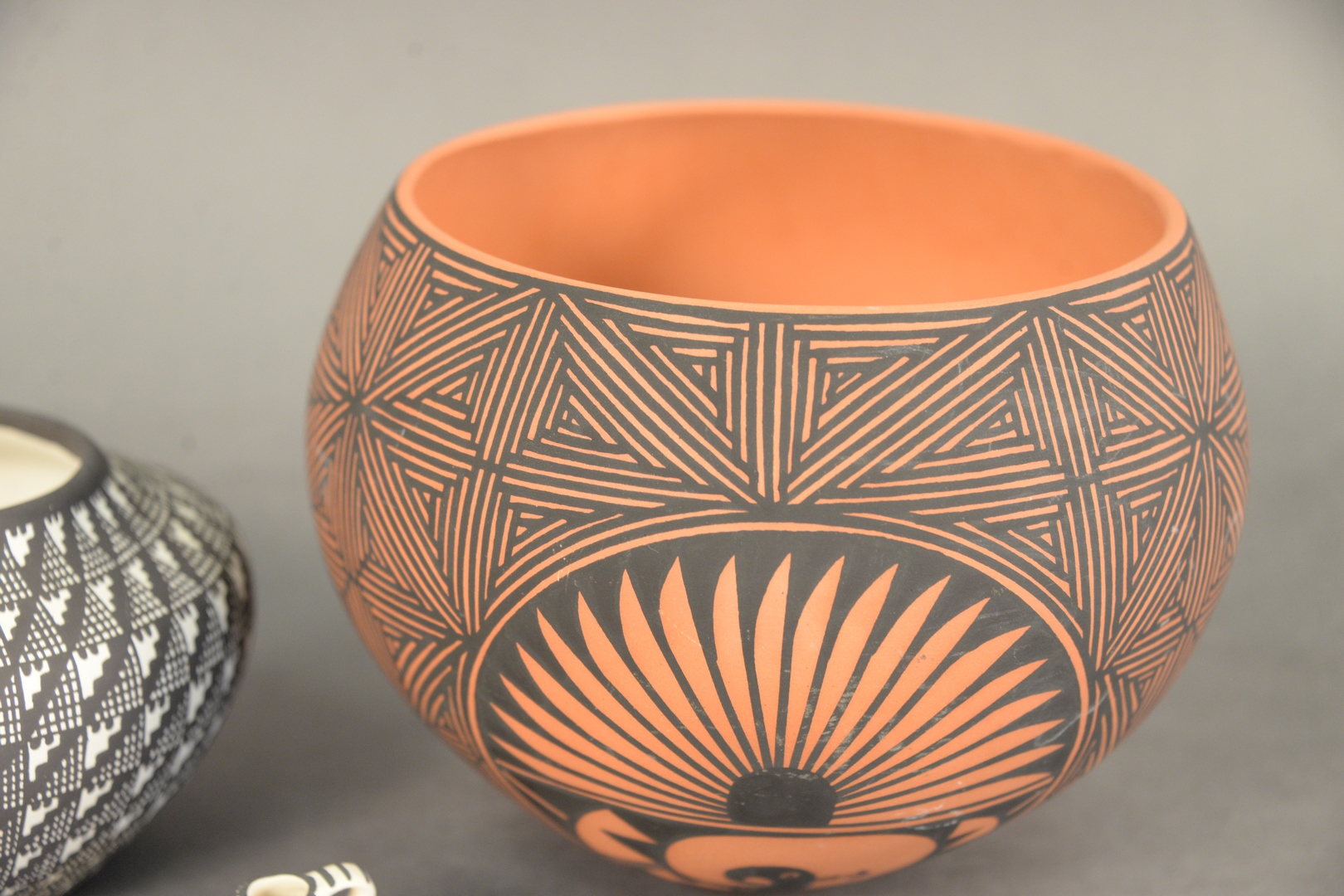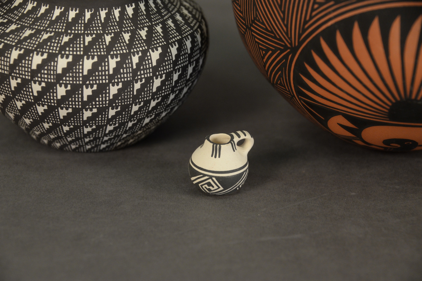 Lot 290: Three Piece Lot of Acoma Pottery, to include a red and black vessel, inscribed “Acoma, N.M. Y.E.”, to the underside; a black and white vessel signed “Vallo” to the underside; along with a miniature black and white pitcher inscribed “JW 17.3” to the underside, largest: height 5 1/2 inches, diameter 5 3/4 inches. Provenance: Estate of James Wadhams