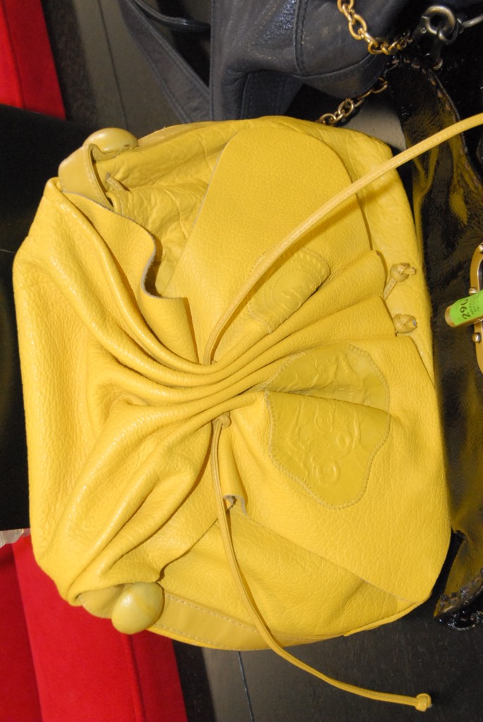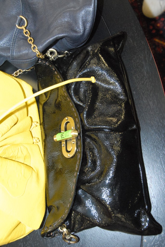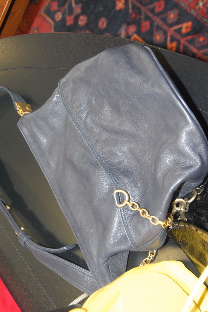Three purses handbags Donna Karan navy blue leather, Carla Mancini black, and Carlos Falchi yellow purse.