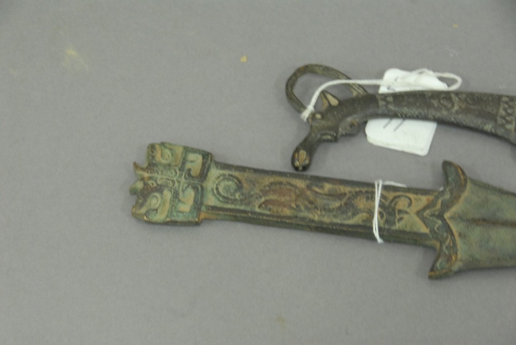 Two bronze archaic daggers, one with dragon handle, lg. 11in. & 15 1/2in.