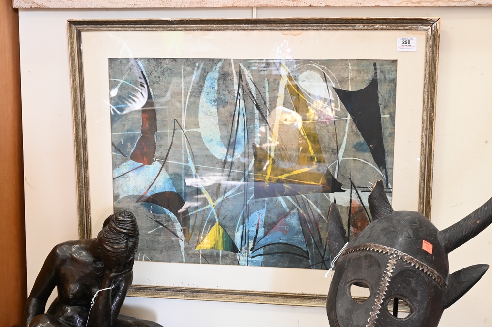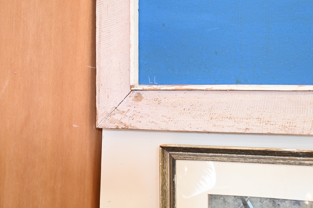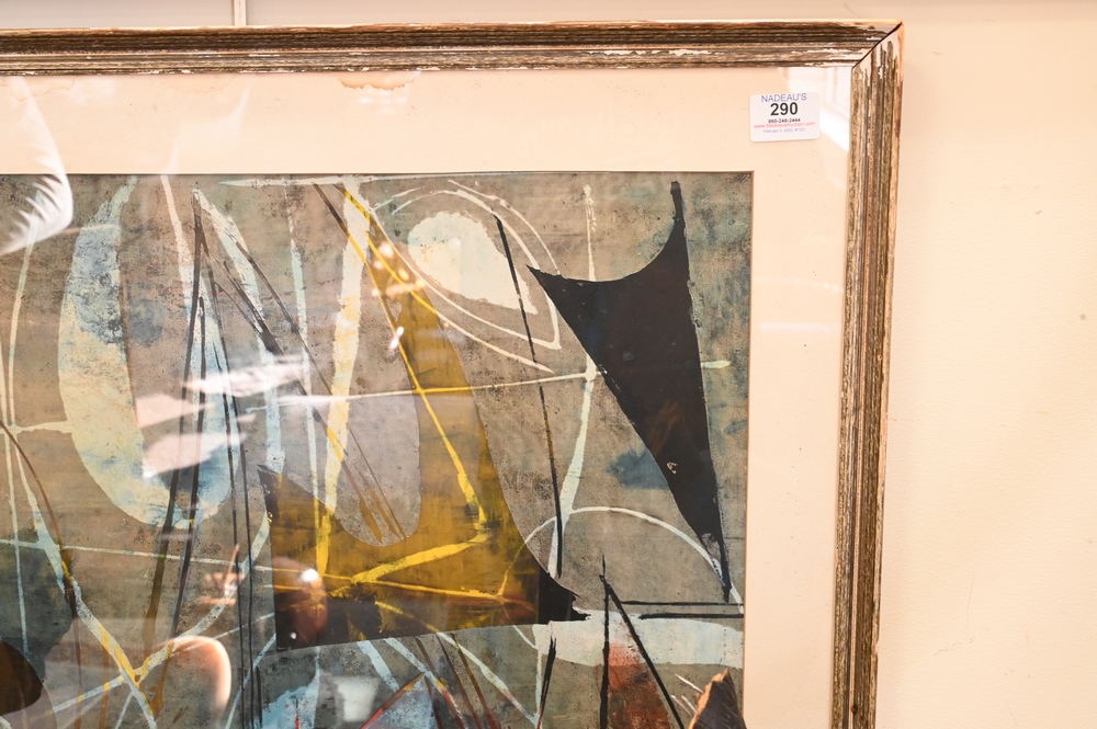 Lot 290: Two Framed Abstract Paintings, to include oil on silk, unsigned, 17.25″ x 23.5″; and an oil on board, initialed lower left, 24″ x 36″.