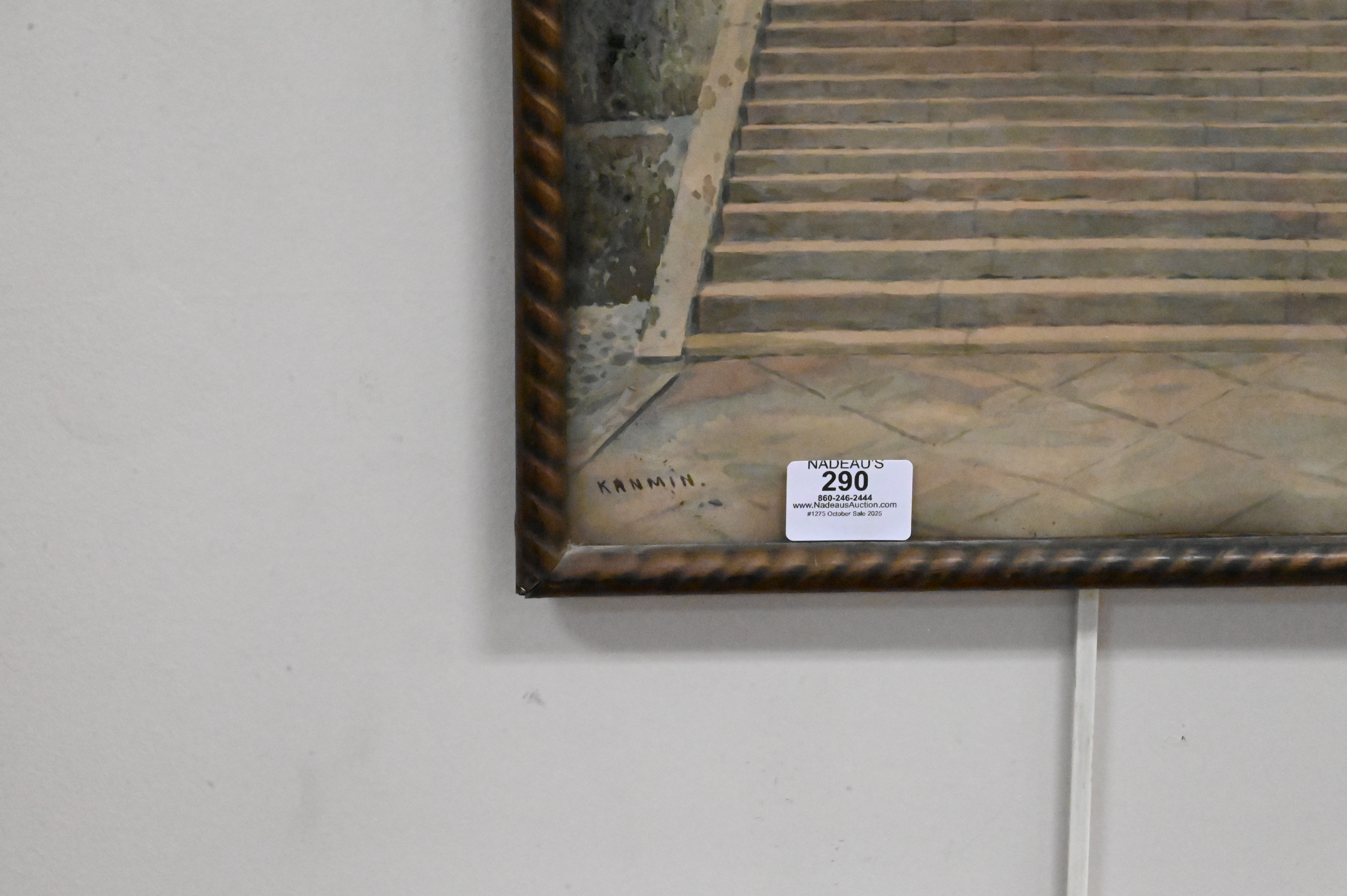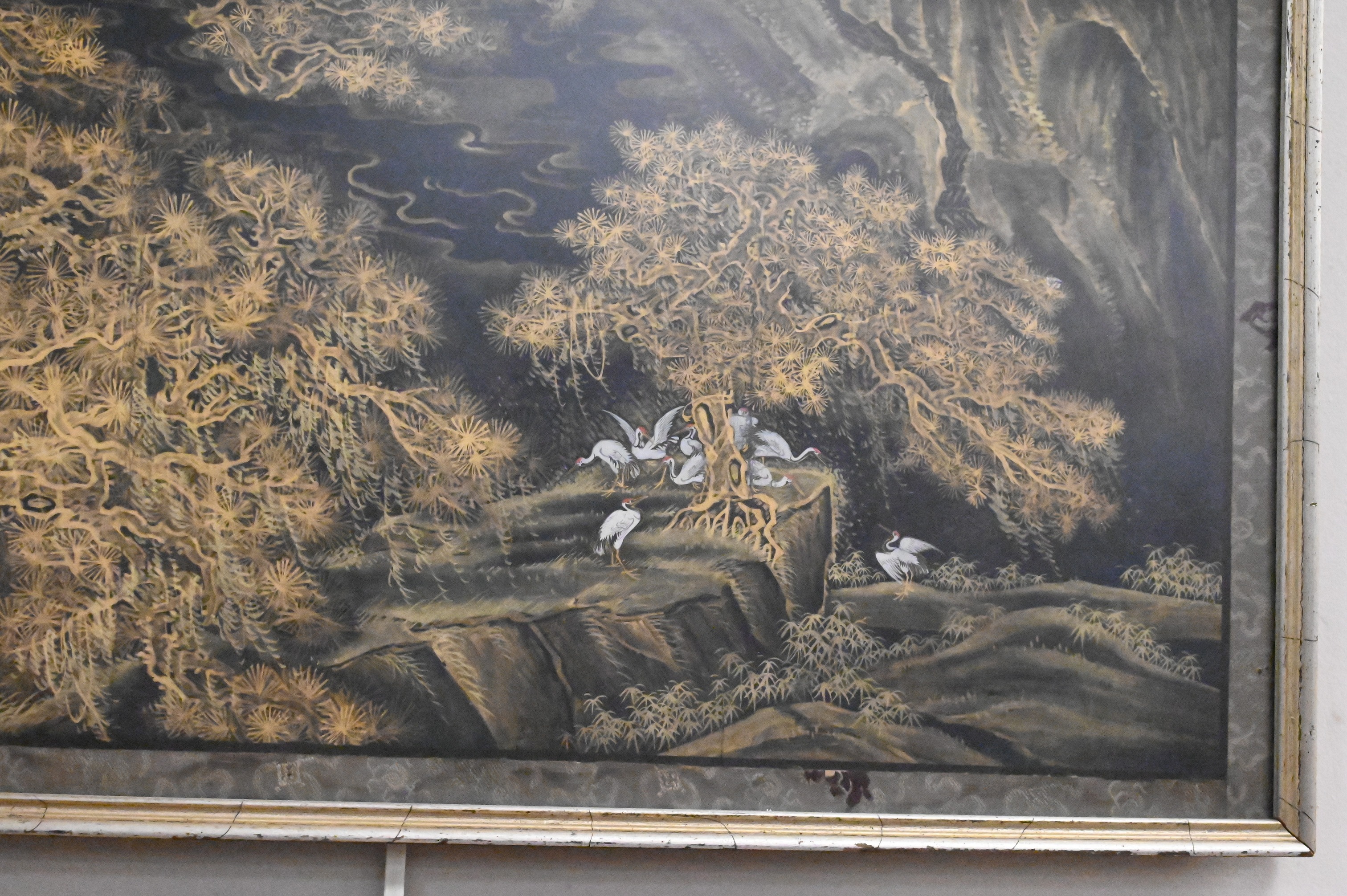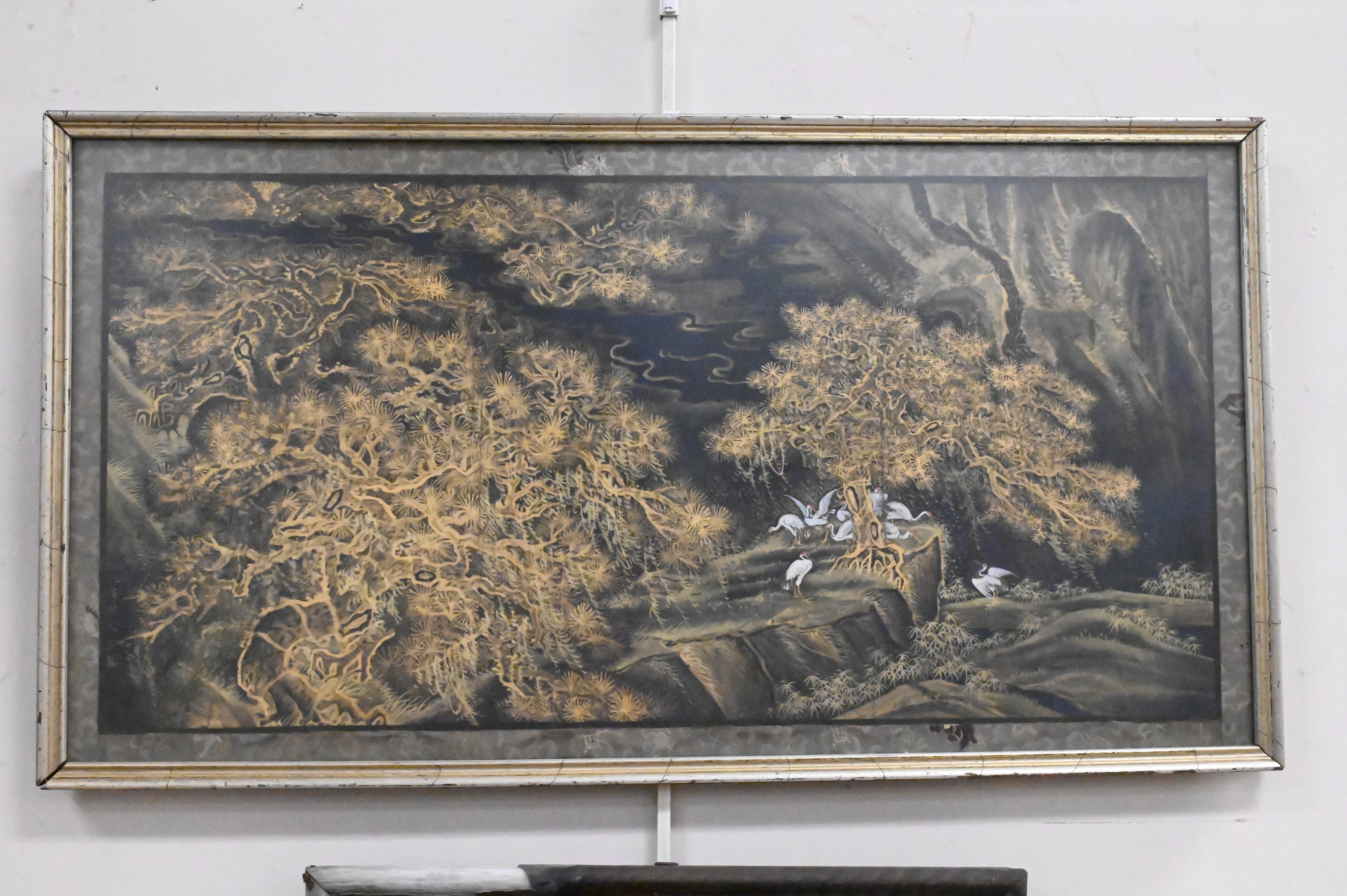 along with gilt watercolor on silk landscape with cranes or herons, character marks lower left