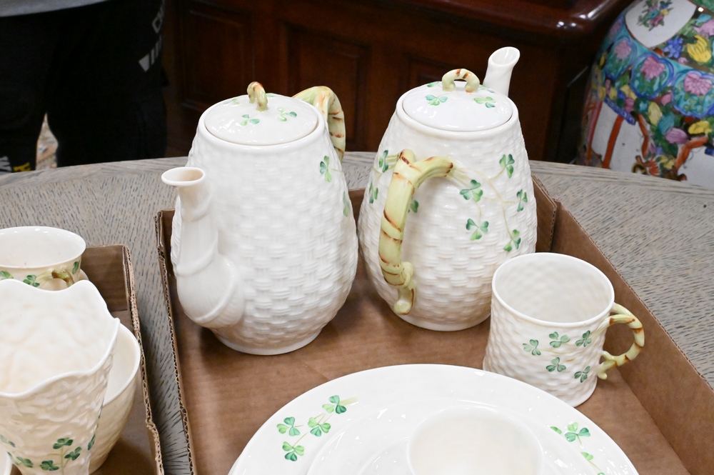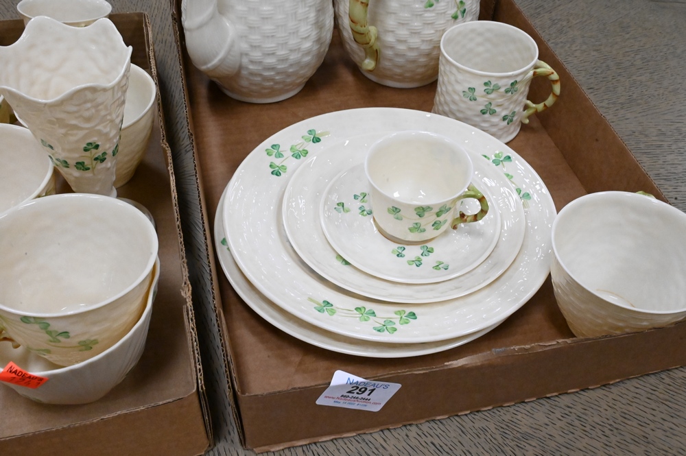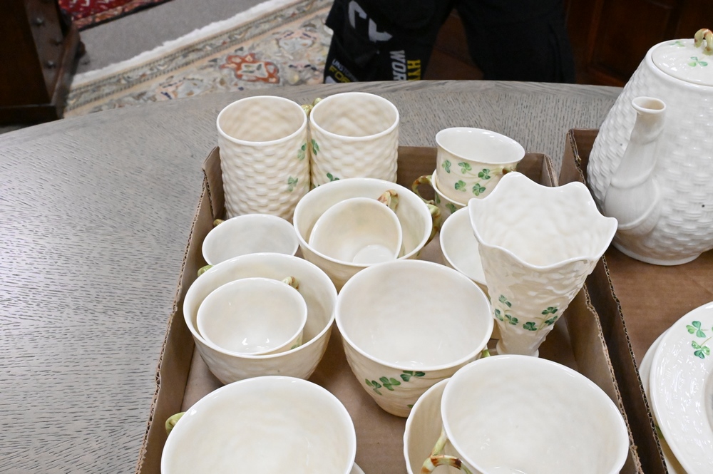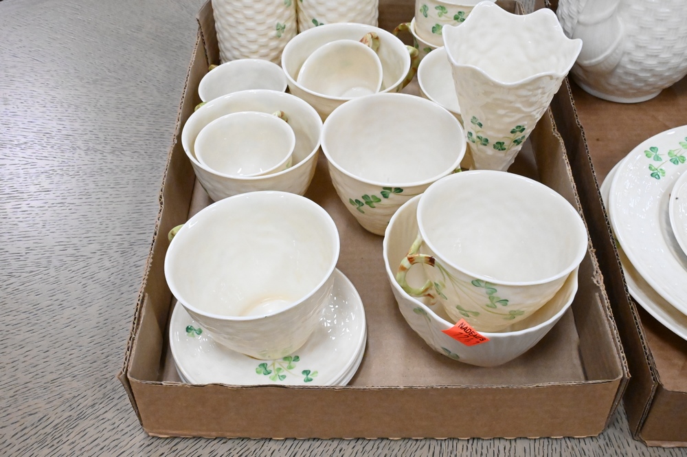Lot 291: 29 Piece Set of Belleek Shamrock, to include cups, saucers, plates, teapots, vases, etc., all with brown mark. Provenance: Collections of Norma Reilly, New Jersey.