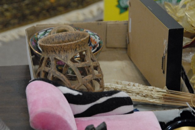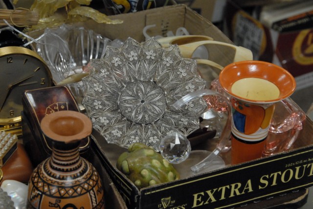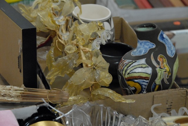5 box lots to include pottery fish set, filigree possibly silver dish, porcelain pieces, Indian pottery piece signed Martha Appleleaf, clock, vases and various others.