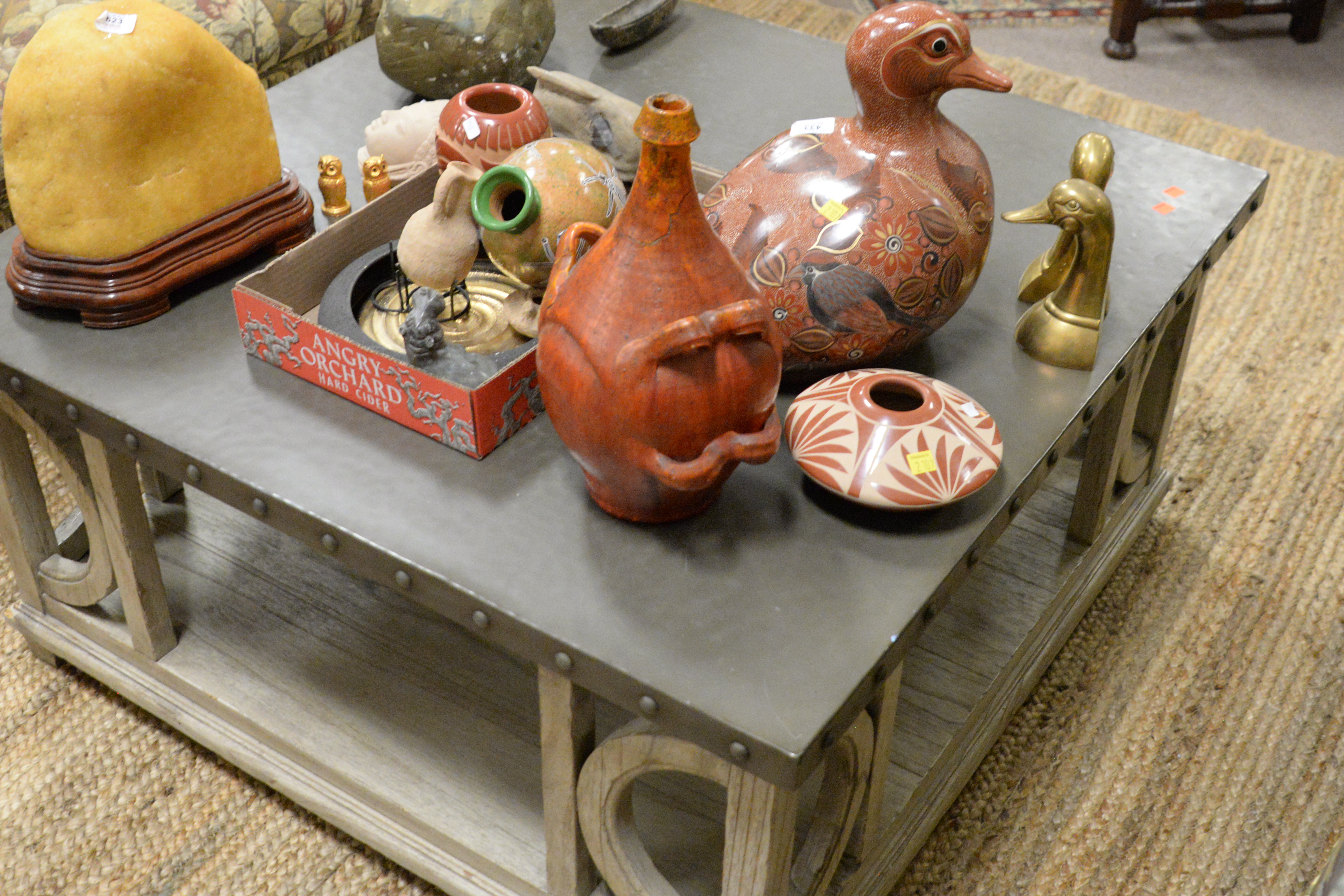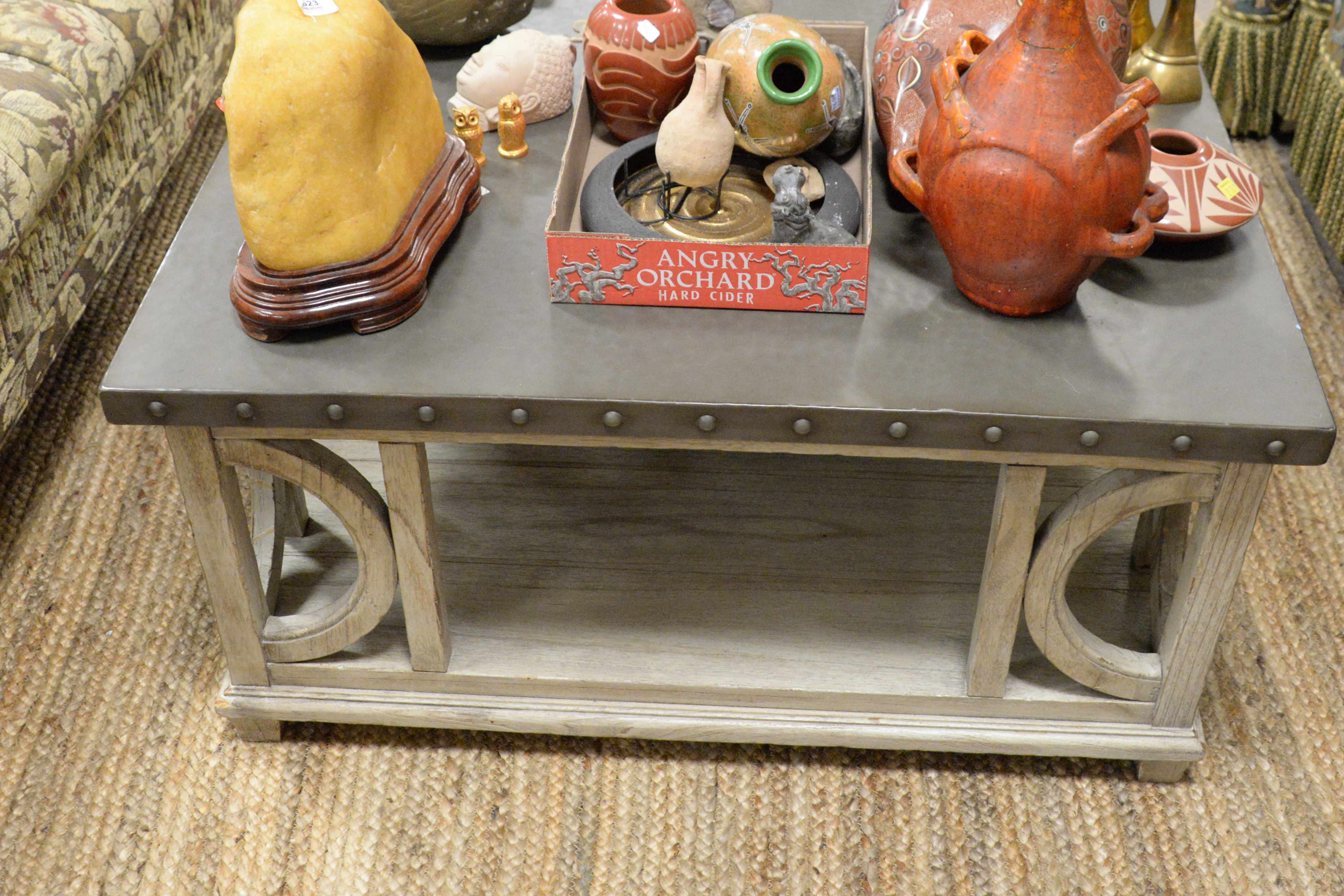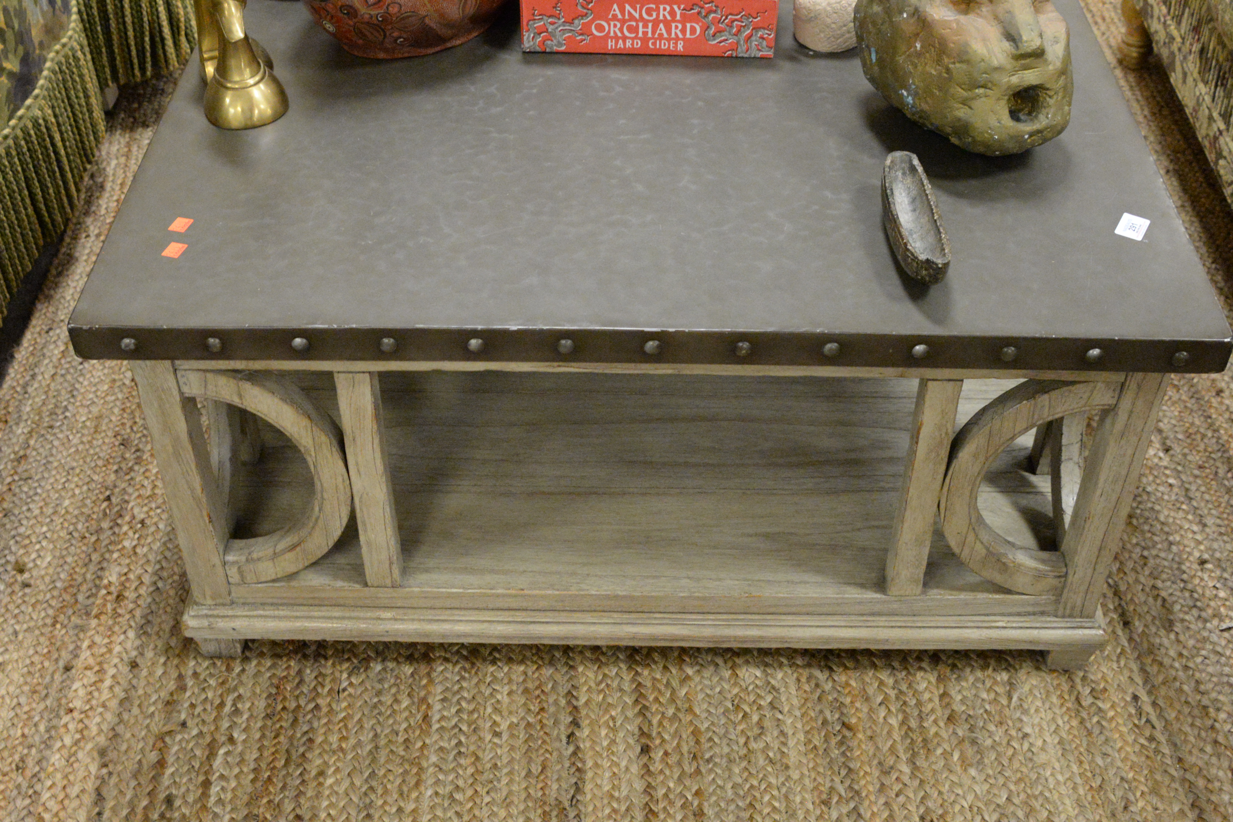 Contemporary Coffee Table, having hand hammered metal top over carved wood base, height 19 1/2 inches, top 40″ x 40″
