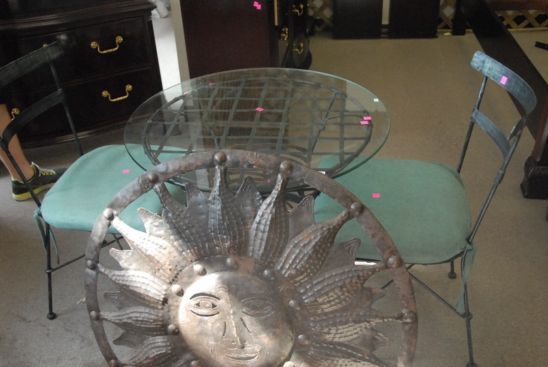 Five piece lot to include glass top table, two chairs, and two metal wall hangings.
