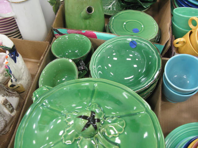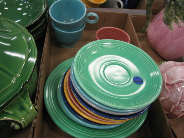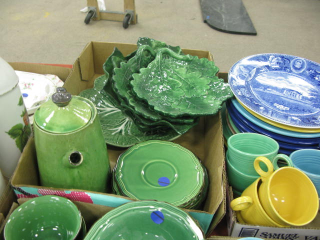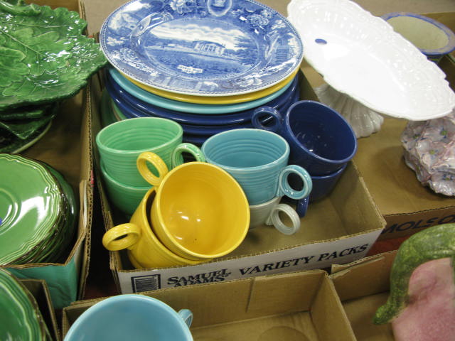 Four box lots of Fiestaware, glazed pottery, leaf dishes, cups, saucers, etc