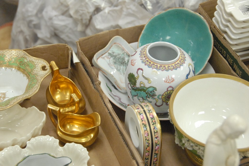 Four boxes of china, hand painted Nippon, Oriental porcelain, Lenox, blue and white pitcher, Hummels, etc. Provenance: Estate of Judy Gengras McDonough of West Hartford, CT.