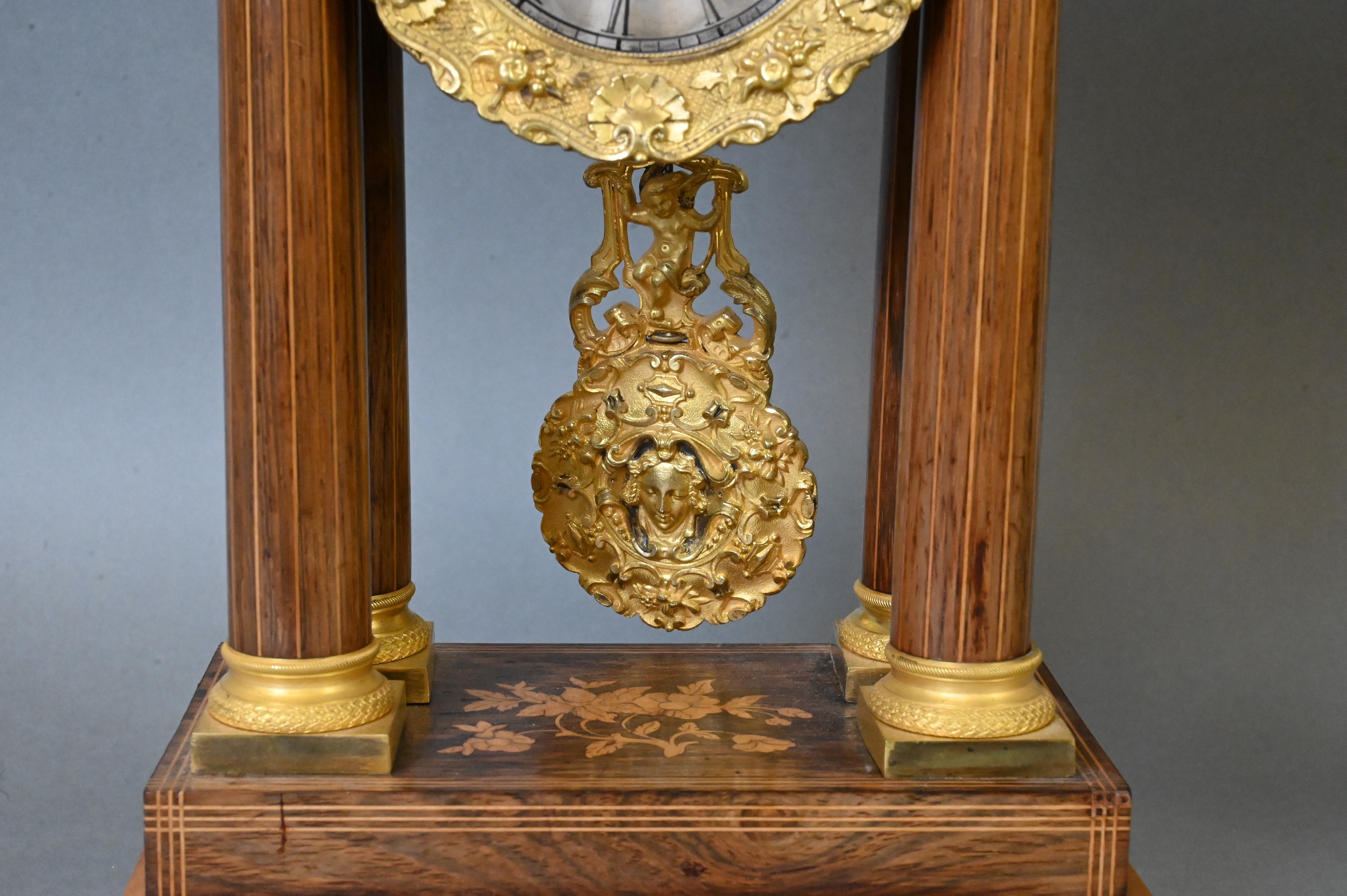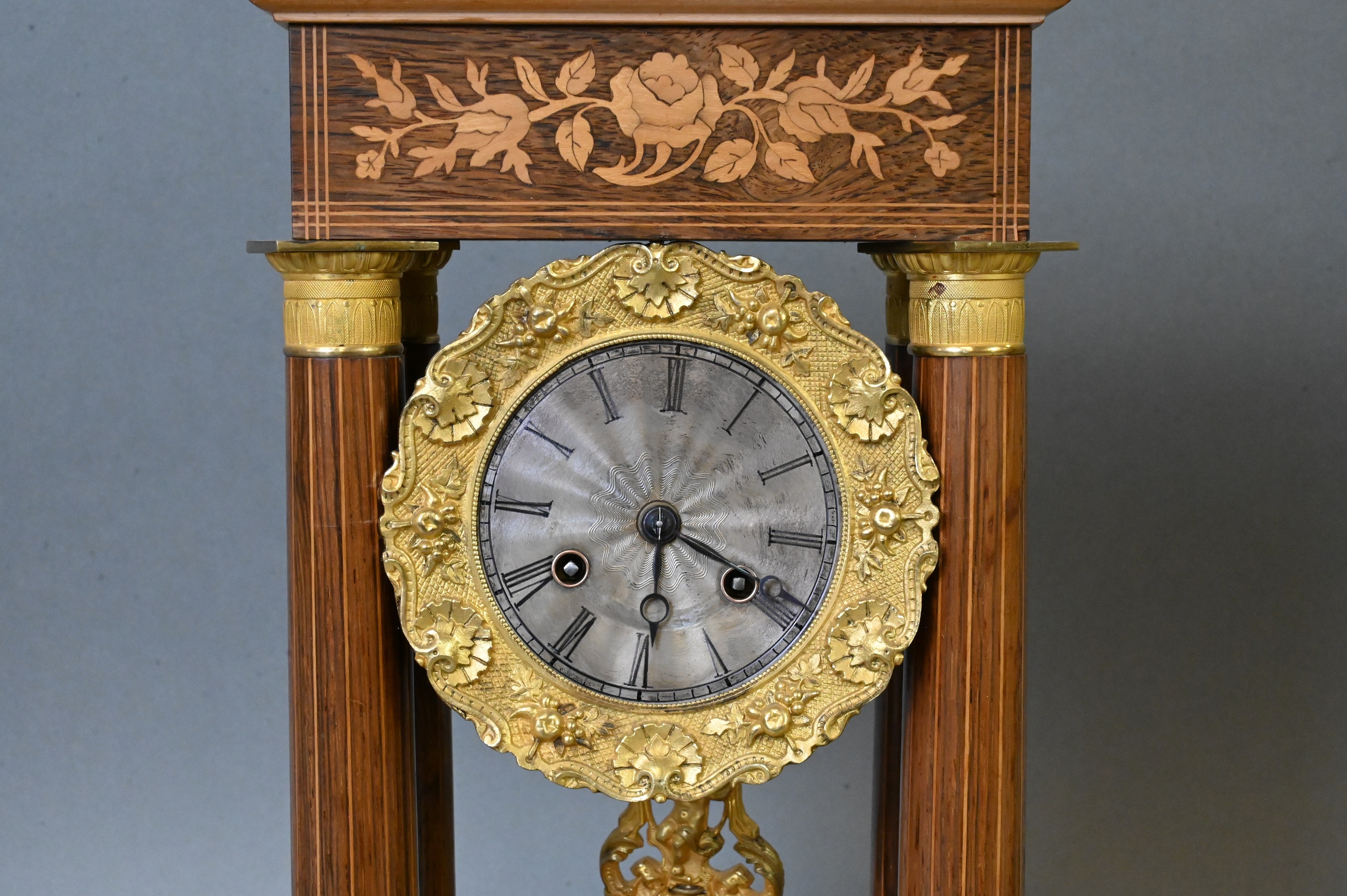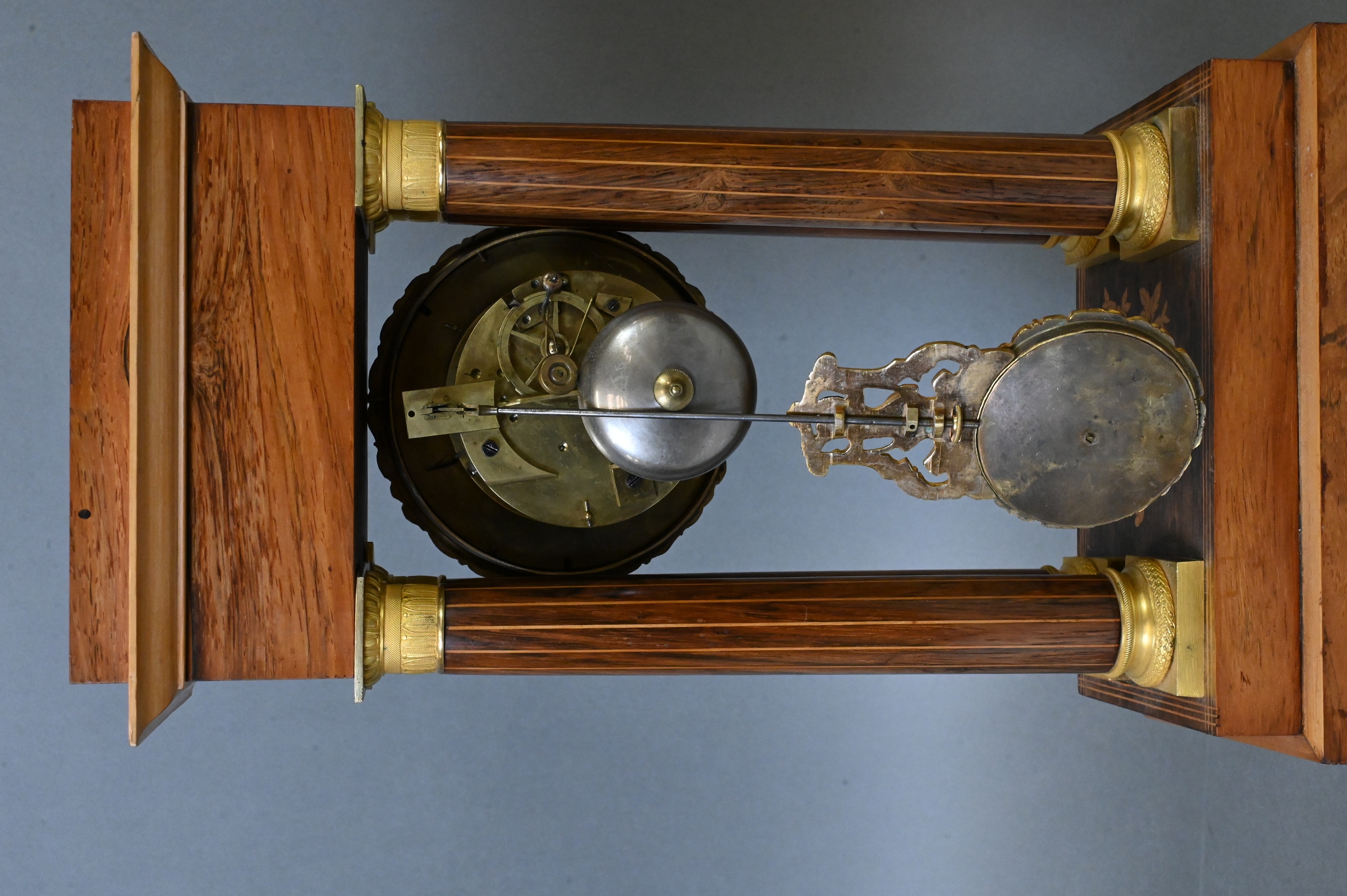 French Empire Inlaid and Gilt Mounted Portico Clock