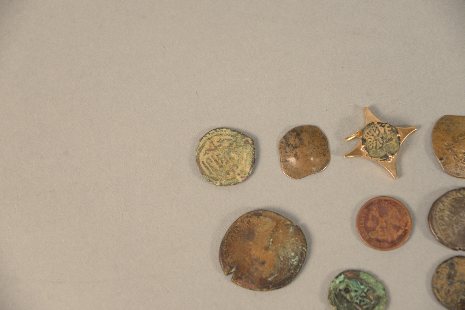 Lot 291: Group of eleven early copper coins, Roman or Greek, 117 – 138, AD and Emperor H. Adrien, one in gold holder.