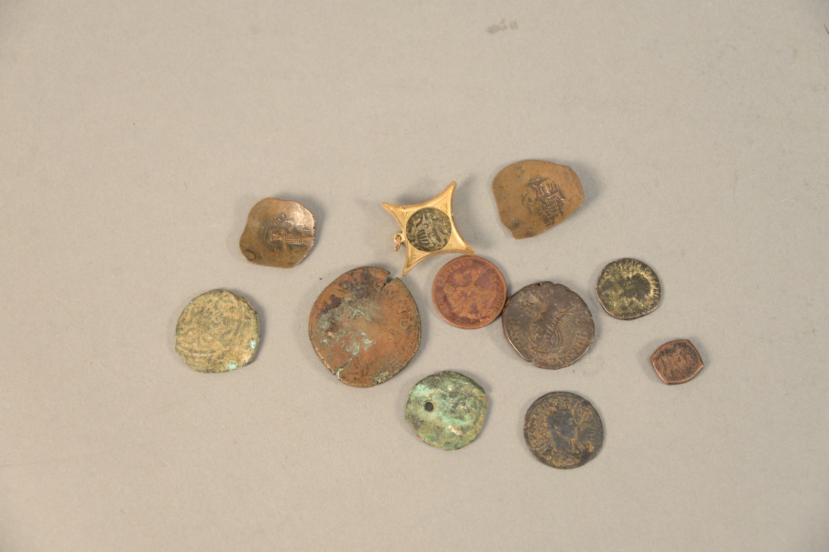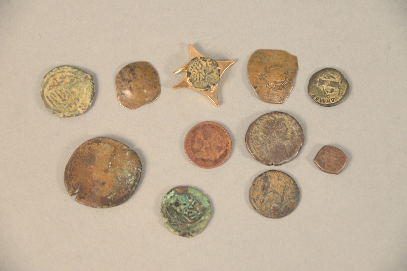 Group of eleven early copper coins, Roman or Greek, 117 – 138, AD and Emperor H. Adrien, one in gold holder.