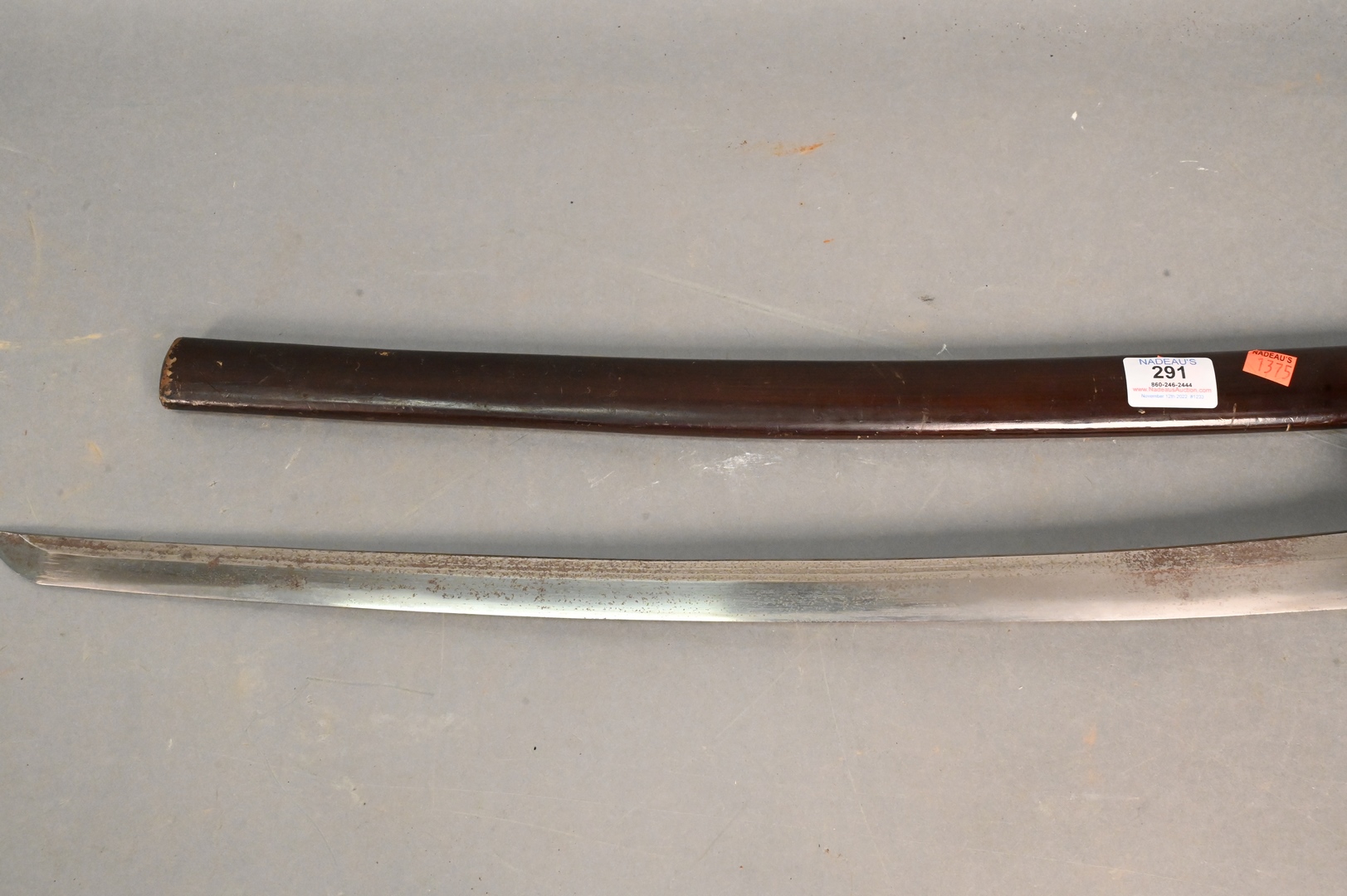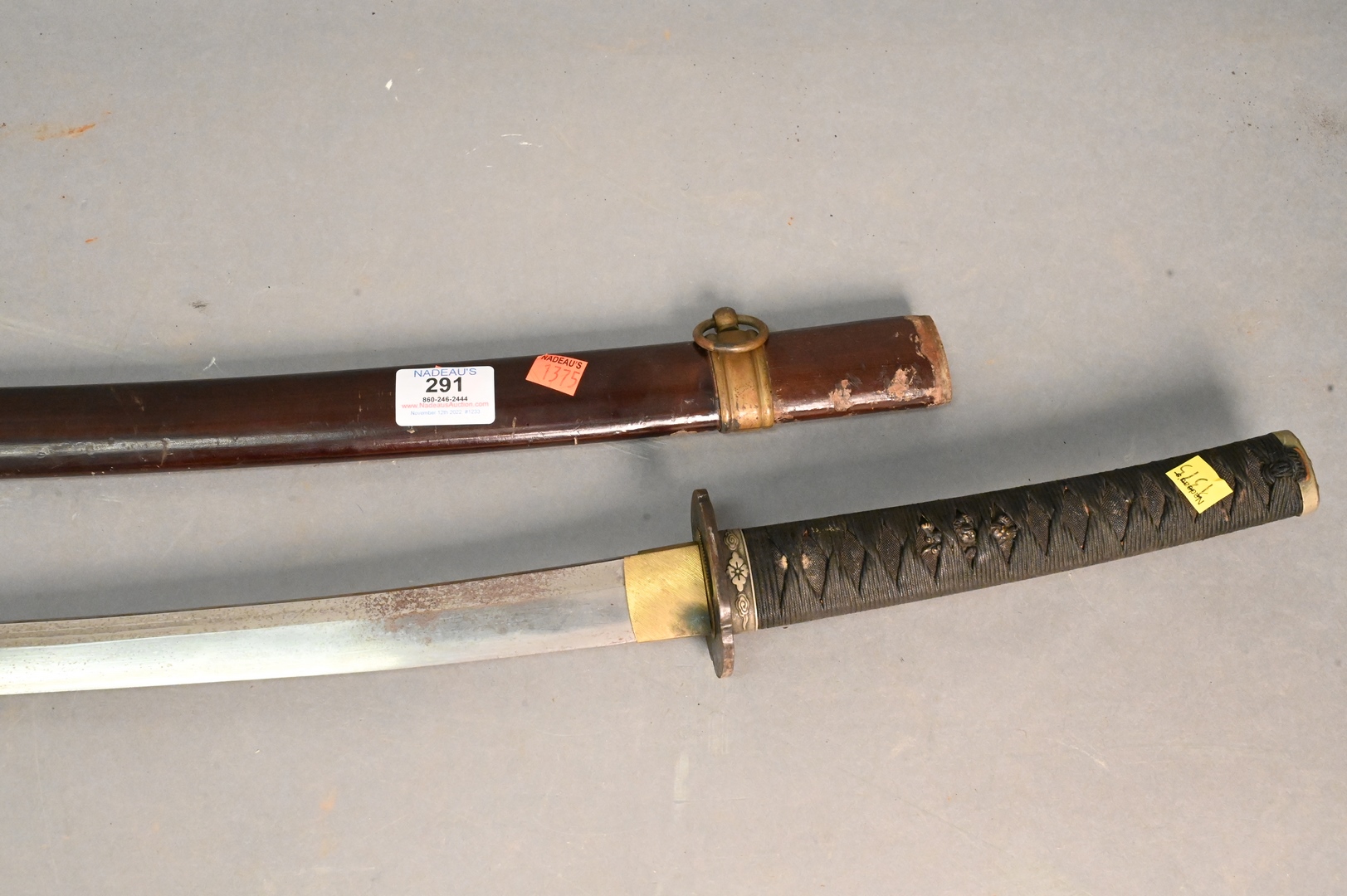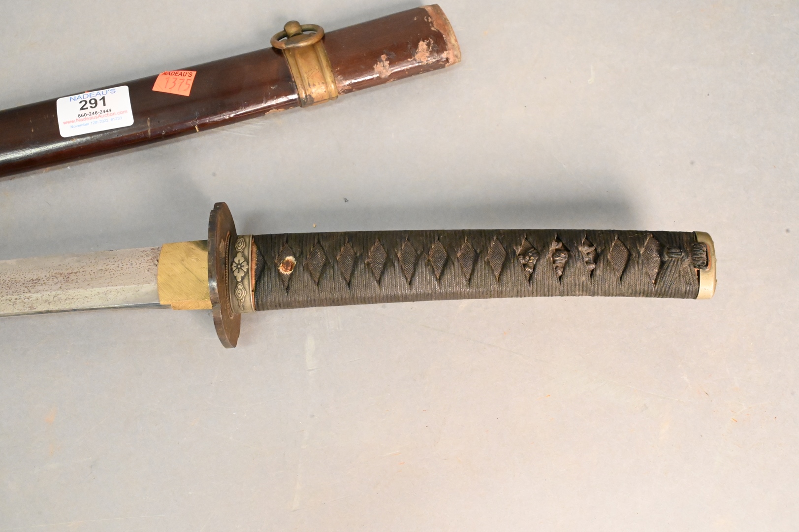 Japanese Samurai Sword, after Wakizashi, having woven Tsuka and wood saya sheath, total length 33 inches, Provenance: Estate of Cyril H. Moore Jr, Kent, Connecticut.