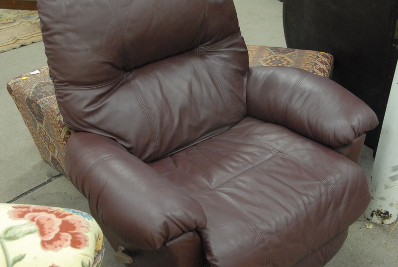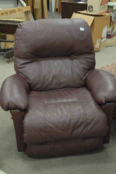 Leather upholstered recliner, burgundy.