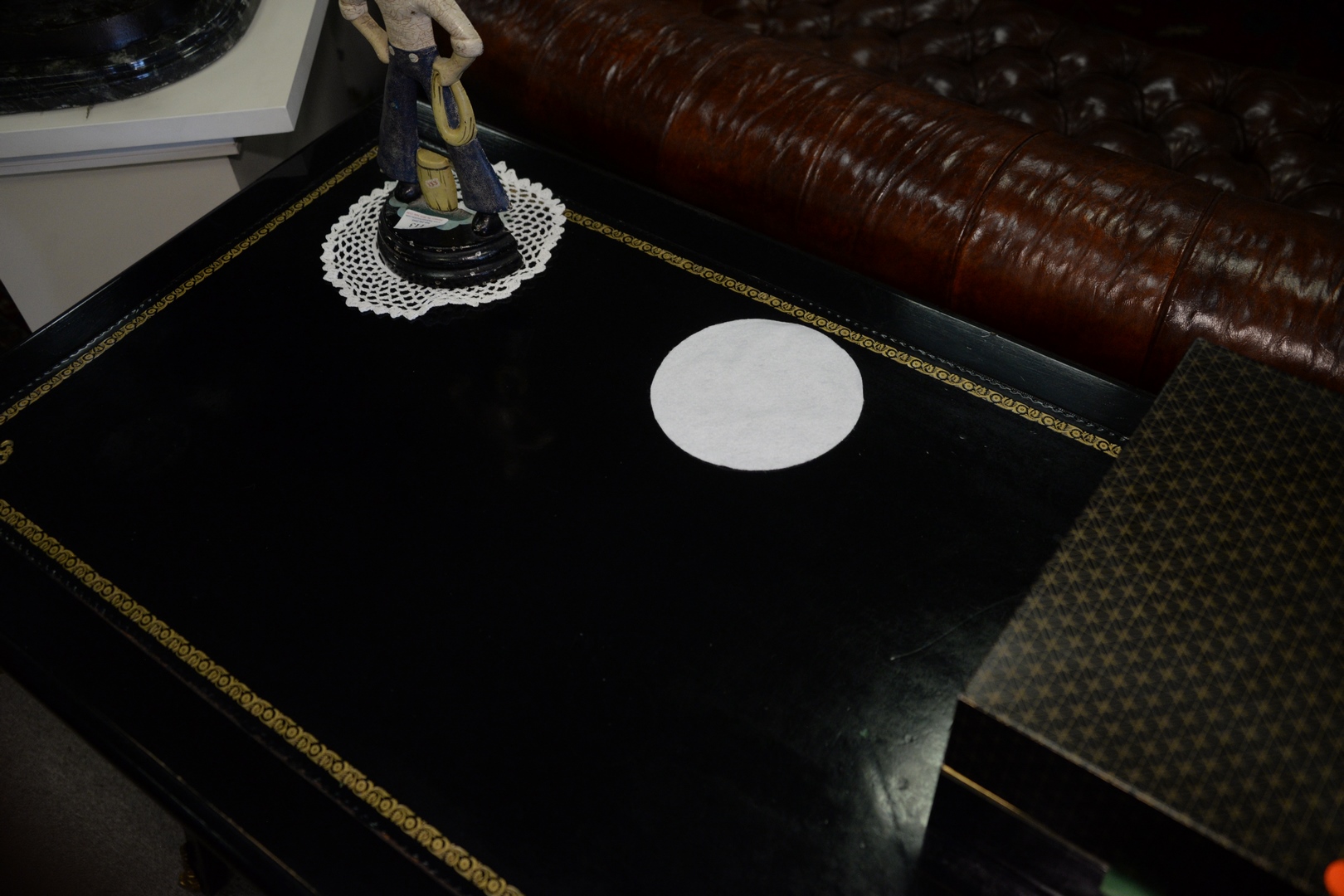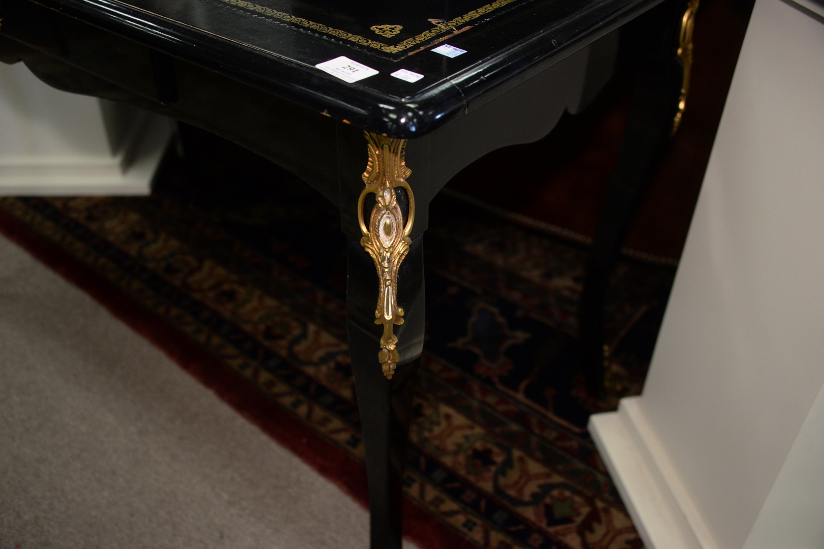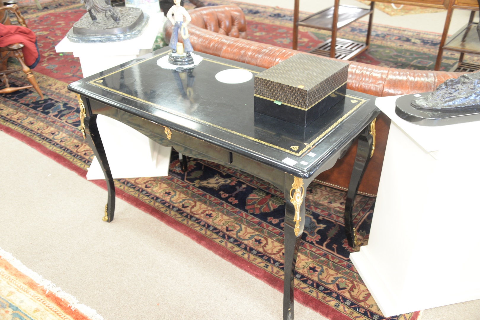 Lot 291: Louis XV Style Gilt Bronze Mounted Black Lacquered Bureau Plat having leather inset top above a frieze drawer, raised on cabriole le…