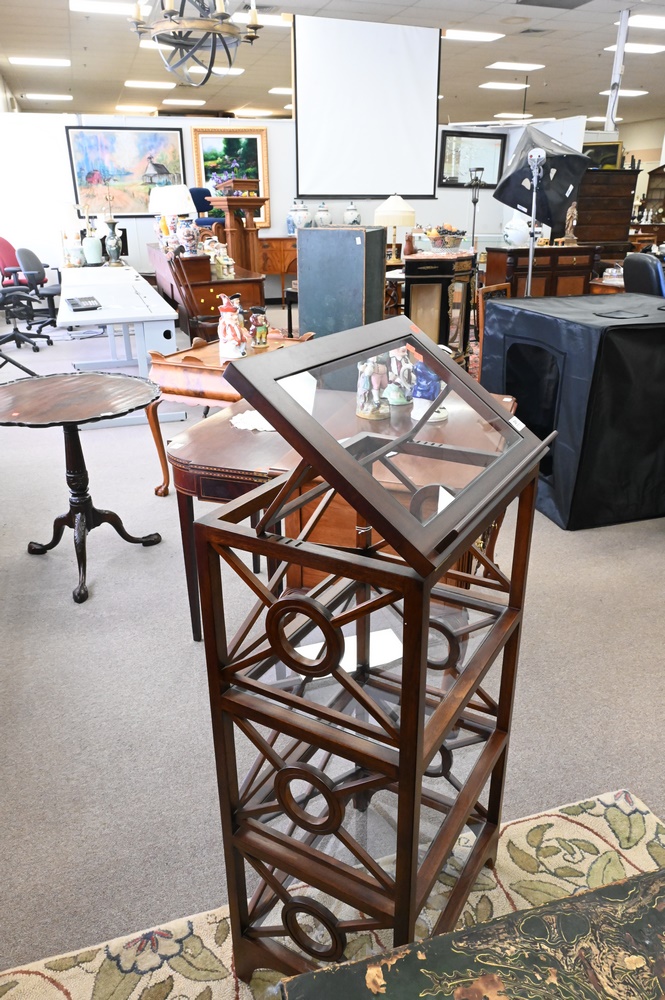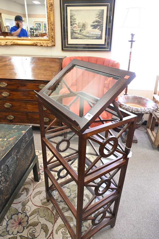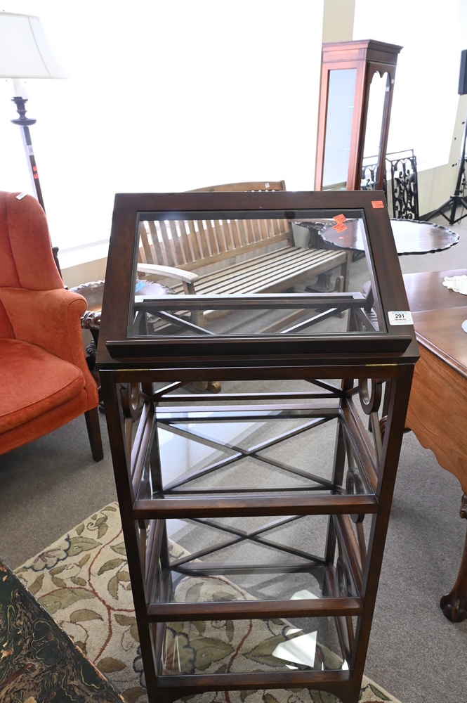 Mahogany Etagere/Music Stand, having four tiers with glass shelves, height 41 inches, width 20 inches.