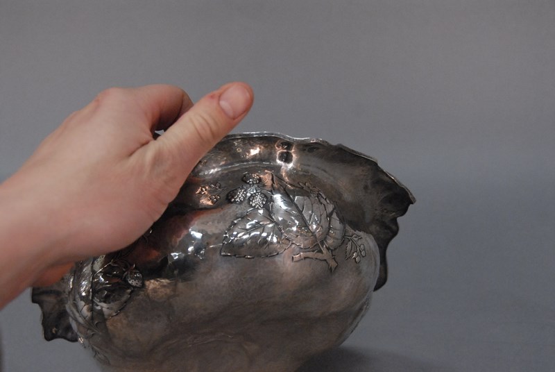 Lot 291: Martele sterling silver bowl having rolled top rim decorated with flowers and raspberries, sides repousse with strawberries and raspberries, marked Martele and anchor mark, monogrammed. dia. 10 3/4in. 29.8 t oz.