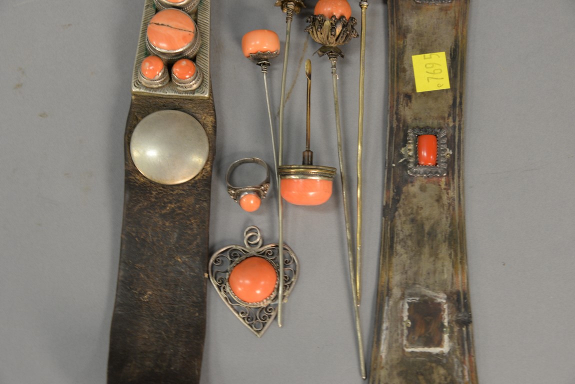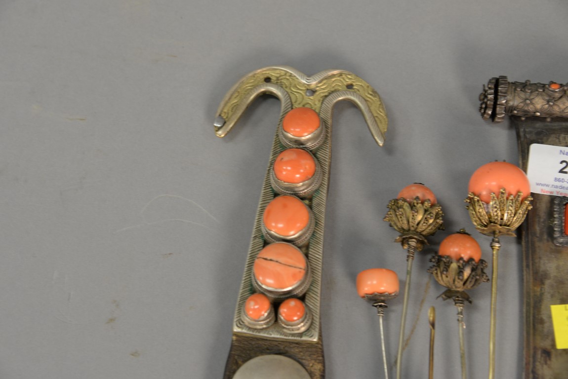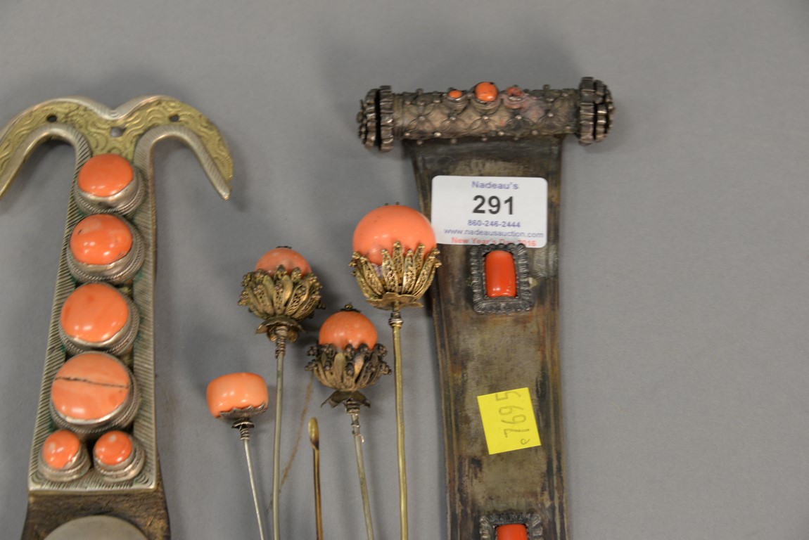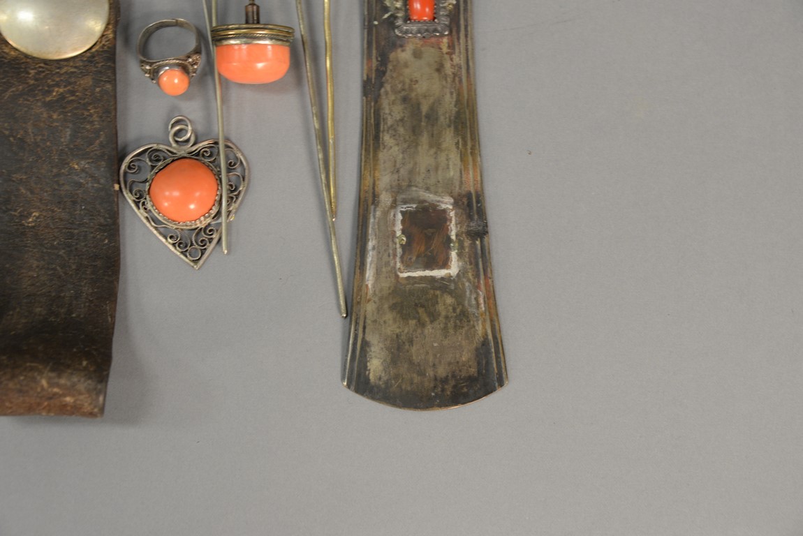 Nine piece Chinese lot of silver and coral including pins, medallion, and ring.