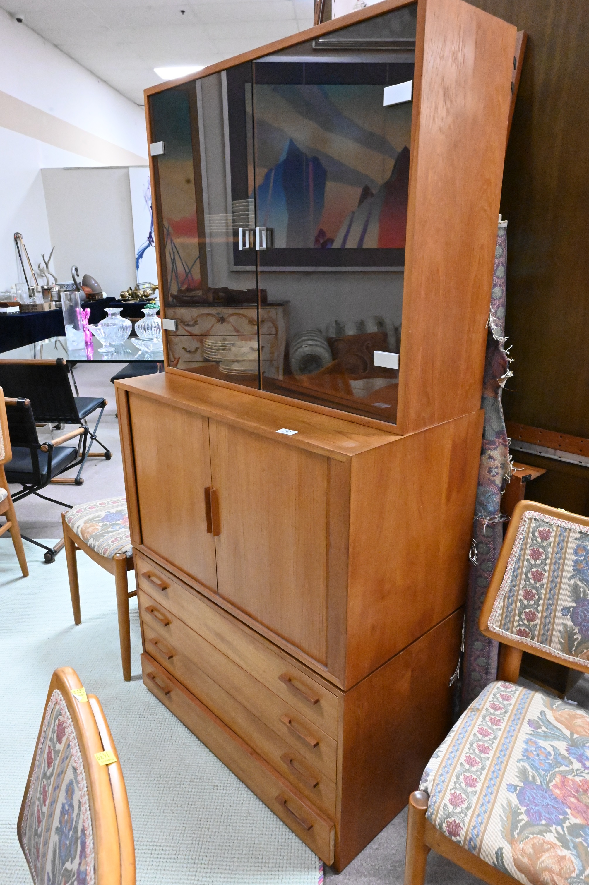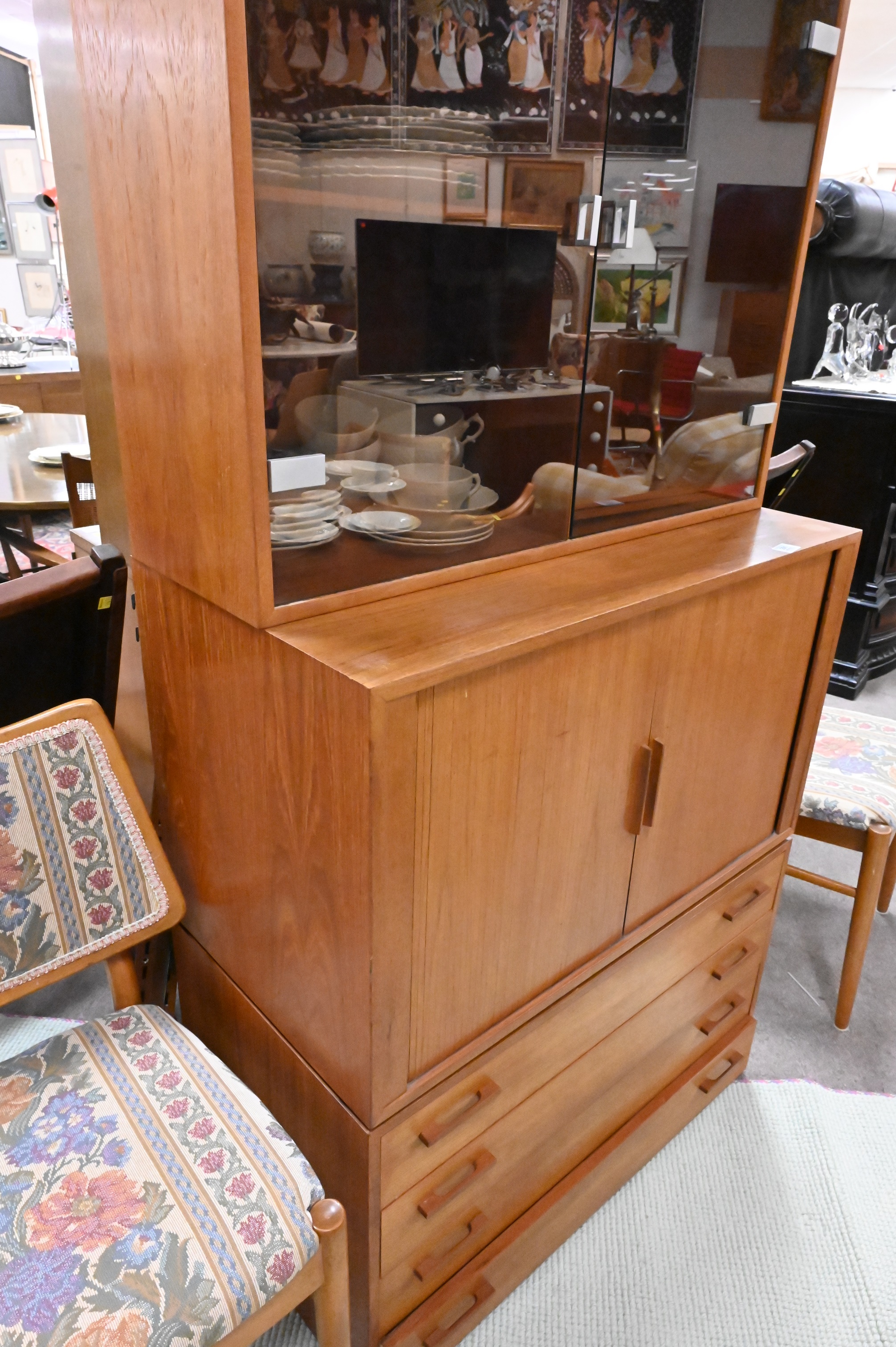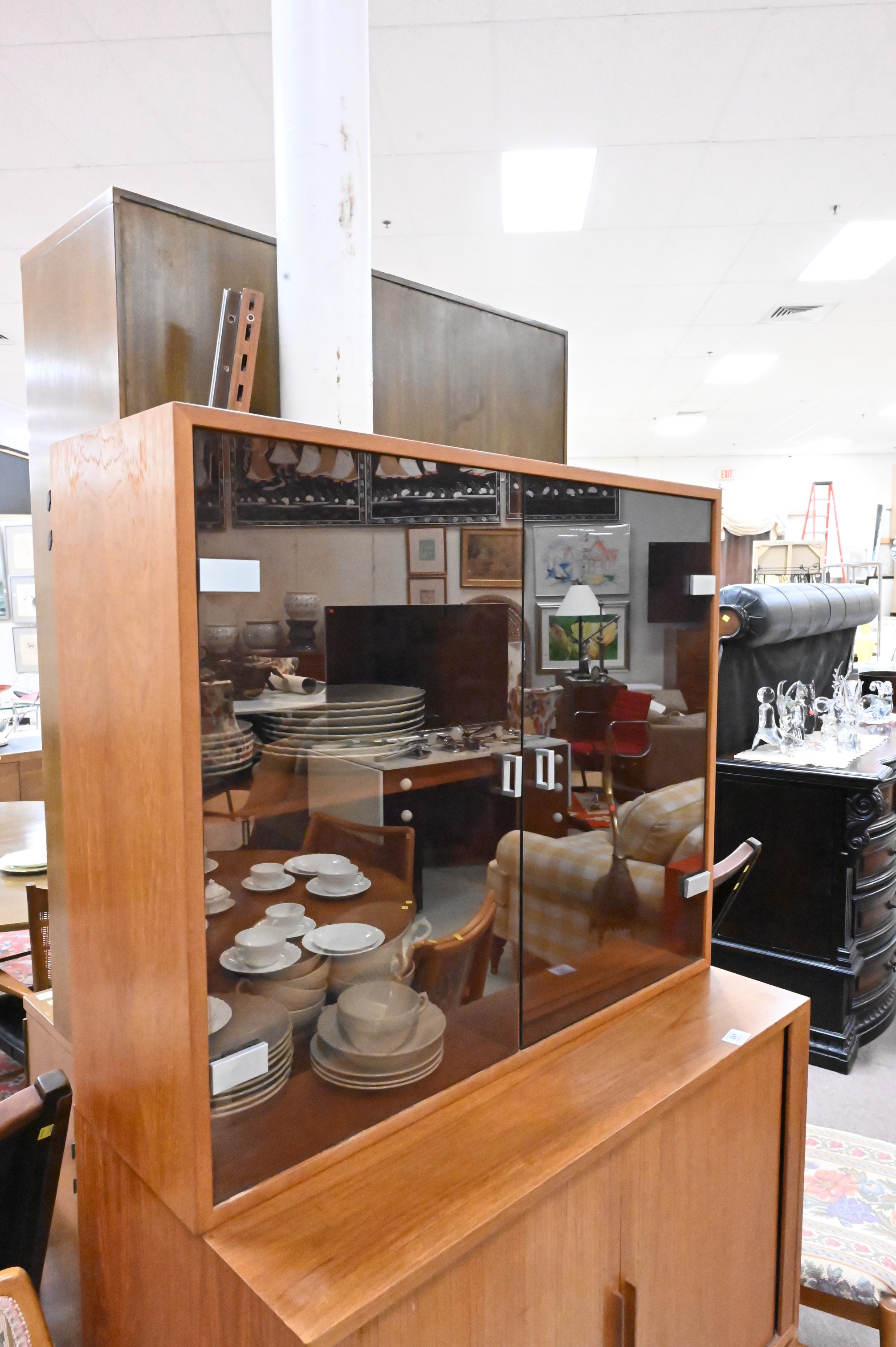 Nine Shelf Teak Danish Furniture System by F.M. Denmark, having chest with drawers, glass showcase, tambour chest, etc., designed by Kai Kristiansen.