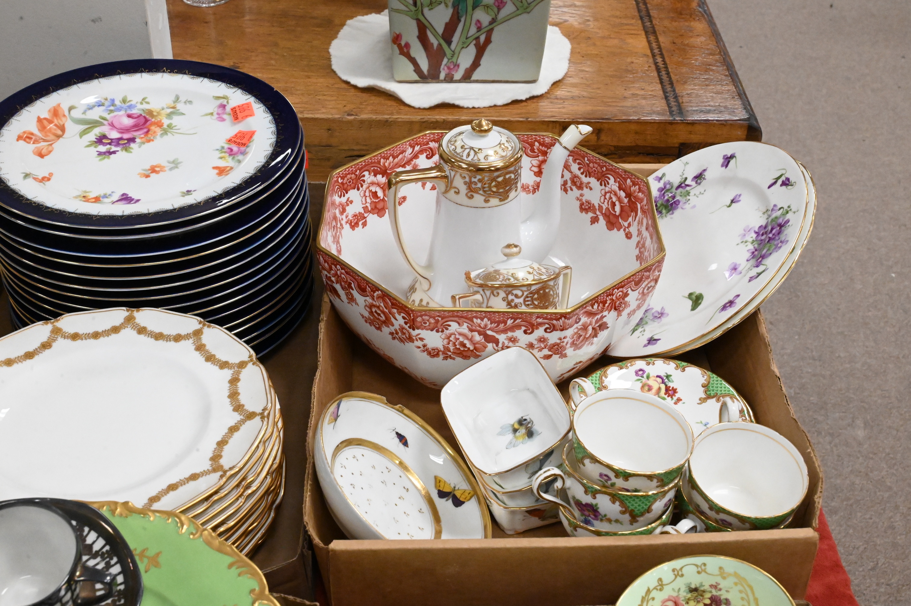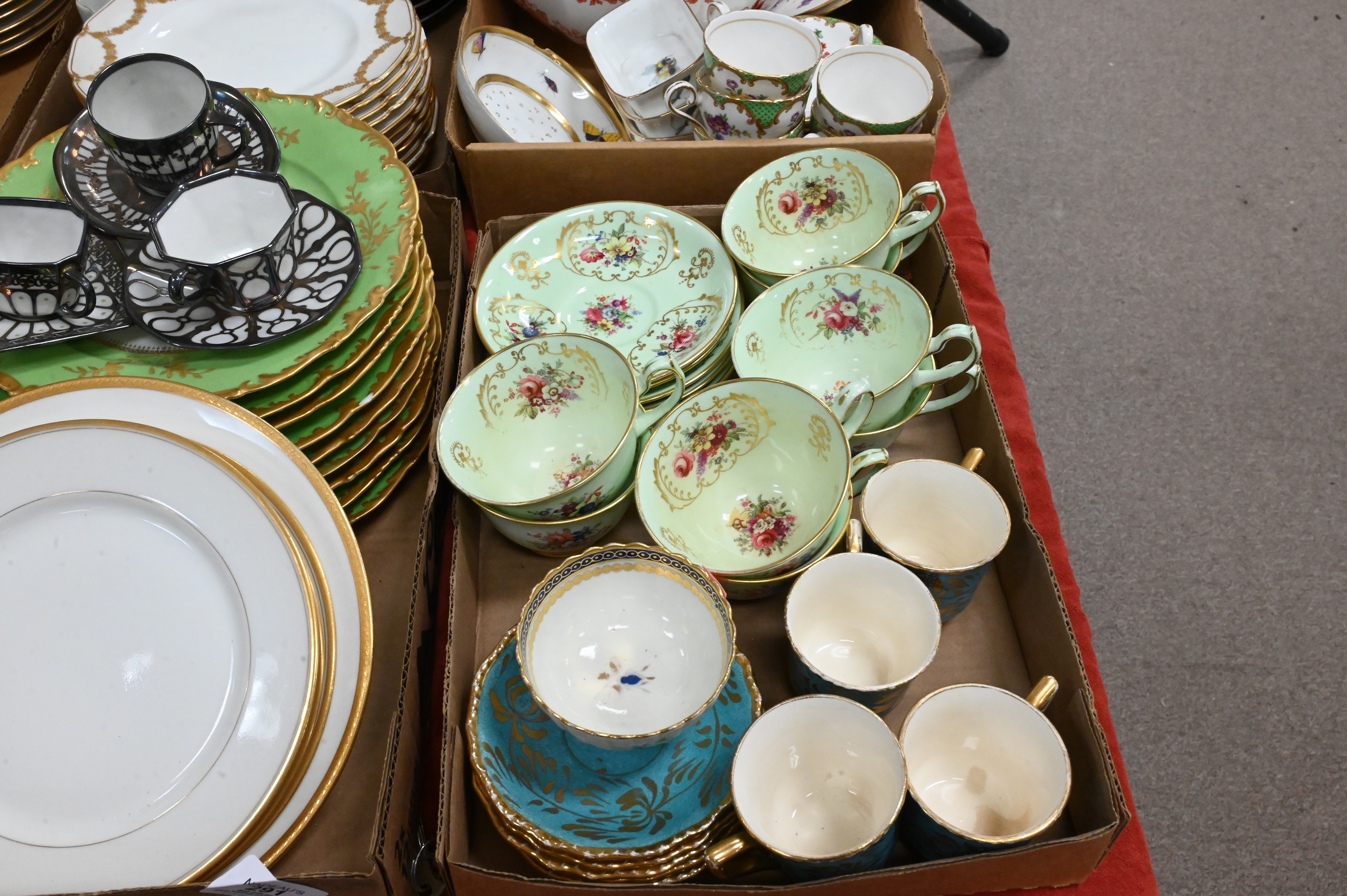 Aynsley teacups and saucers, Coalport turquoise and gilt teacups, Rosenthal, Minton, Limoges, luncheon plates, saucers along with floral cache pot