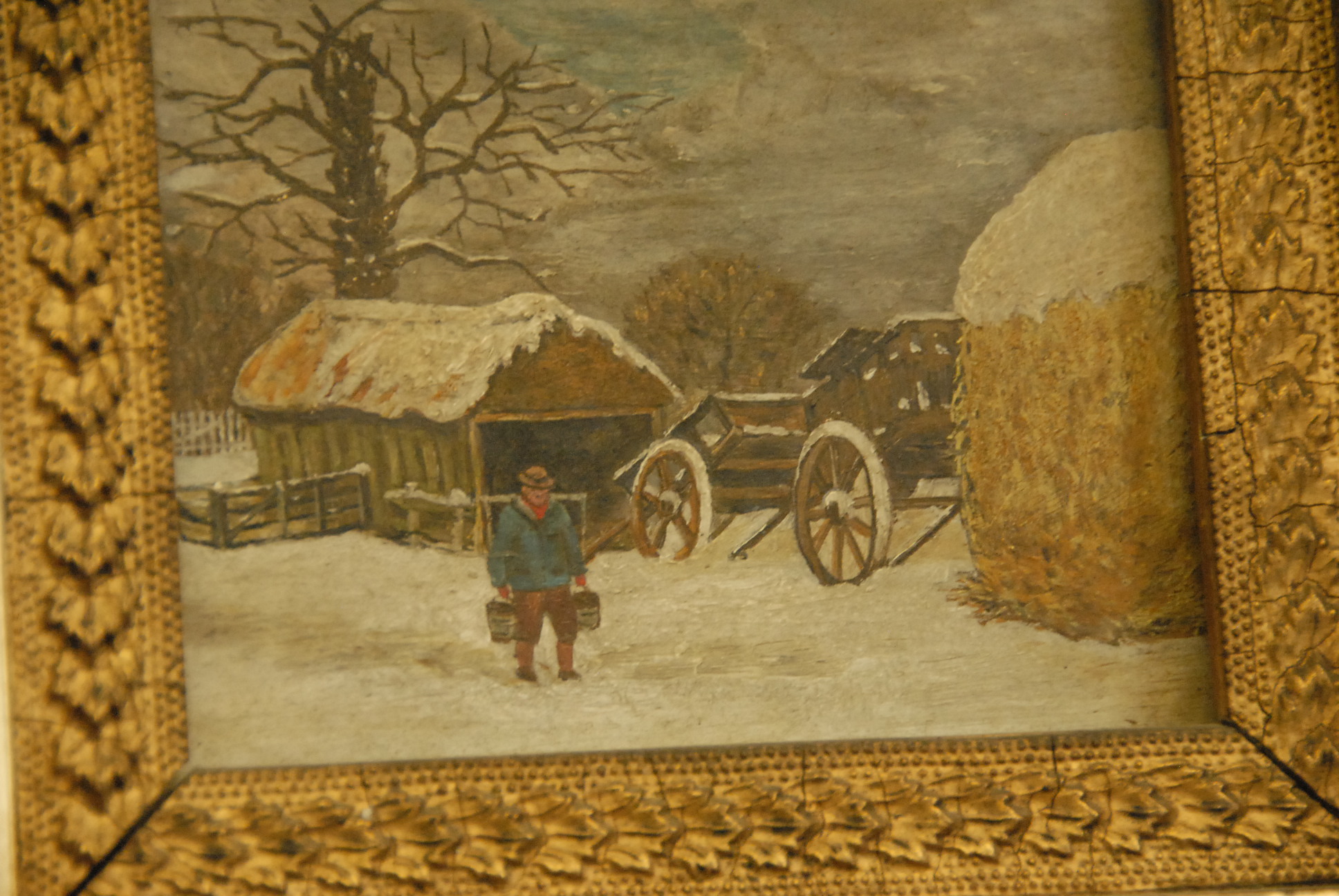 Lot 291: Small oil on board winter landscape in thick gold frame, 4 1/2 x 5 1/2.