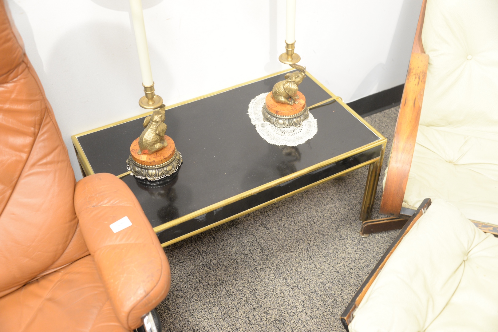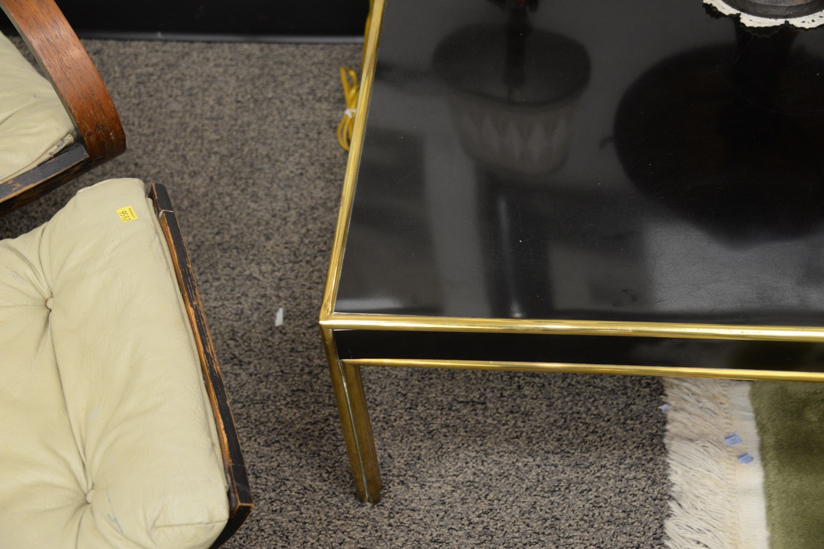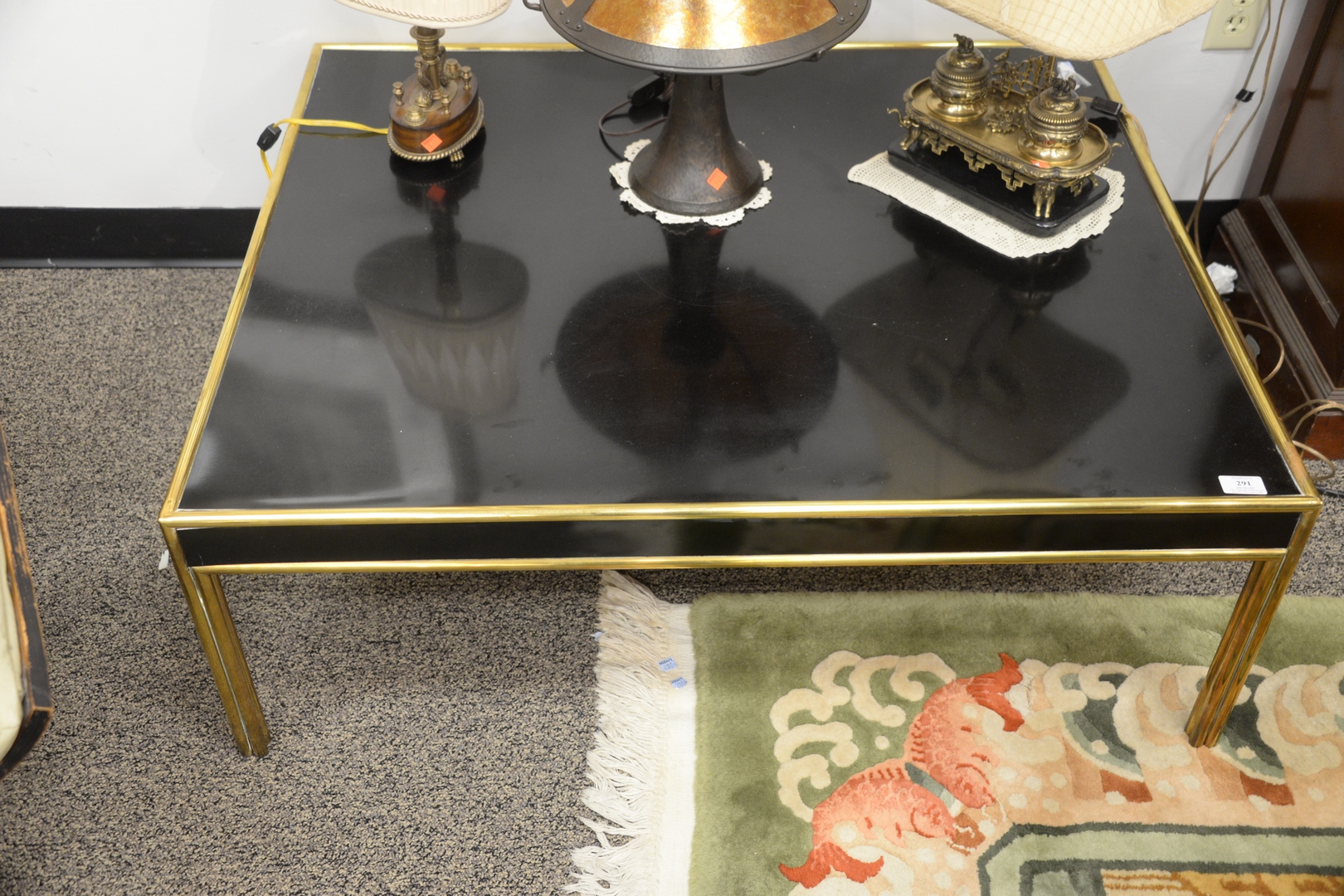 Lot 291: Two Maison Jansen Tables, black lacquered with brass trim, large coffee table, height 15 inches, top 42″ x 42″; along with a small table, height 15 inches, top 19″ x 32″. Provenance: The Estate of Gloria Schiff, 630 Park Avenue, New York.