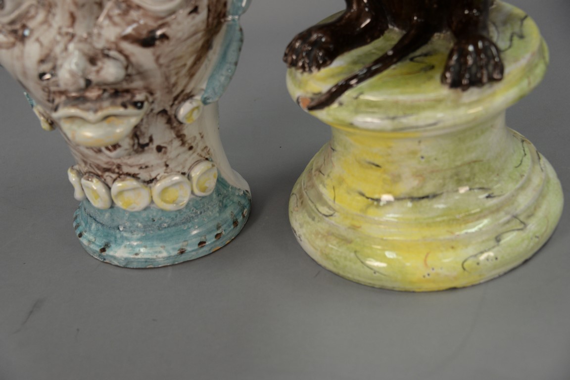 Two piece lot to include large ceramic face vase white glaze with molded painted face unsigned ht. 17in. and large ceramic Majolica dog holding card holder dish ht. 27 1/2in..