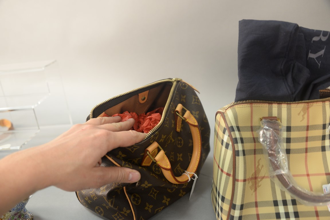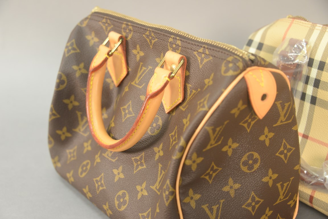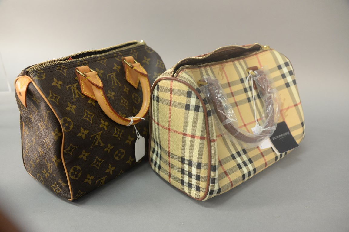 Lot 291: Two purses to include Louis Vuitton Speedy 25 monogram handbag and new Burberry London handbag with tag and plastic. Louis Vuitton:…