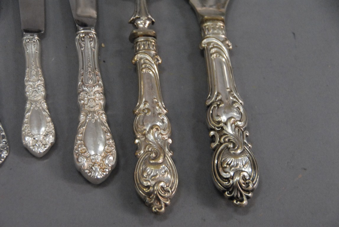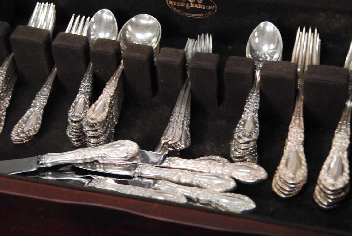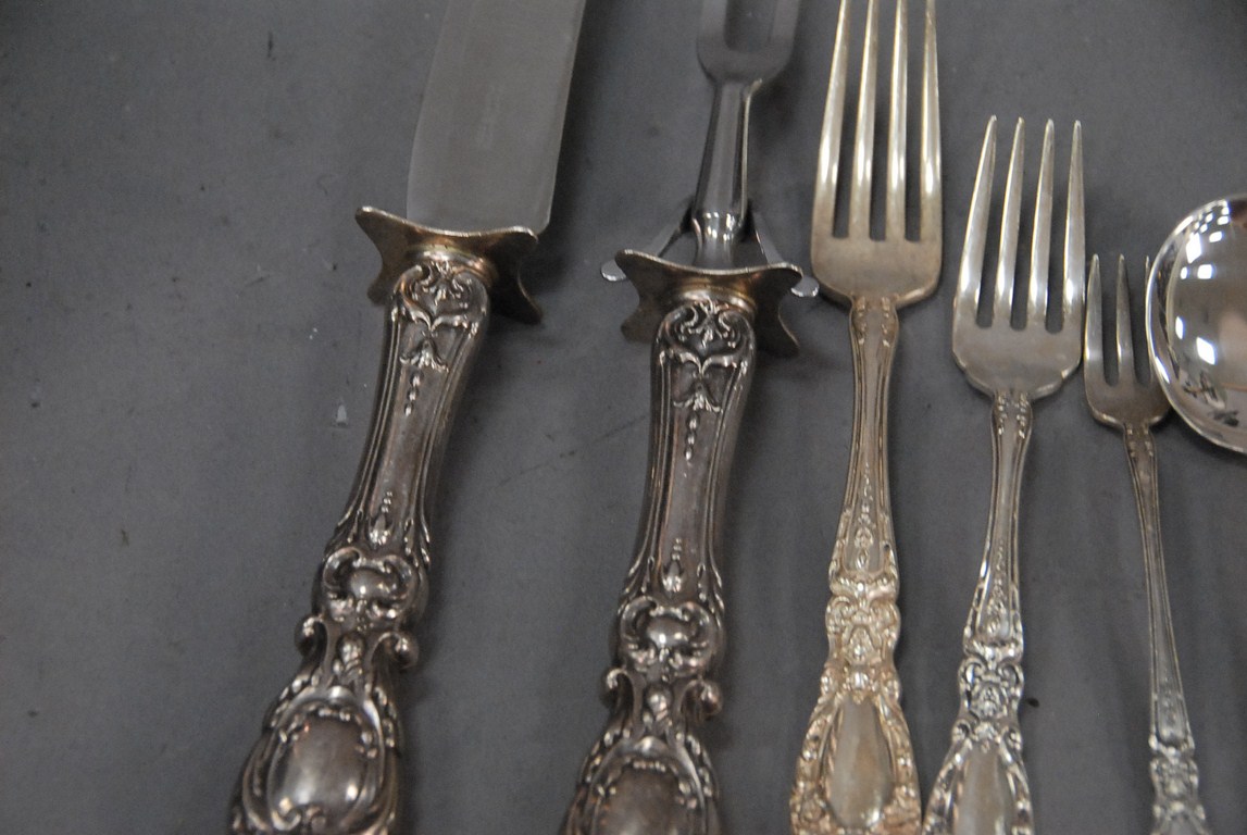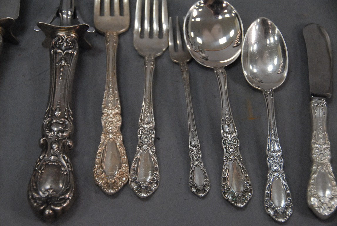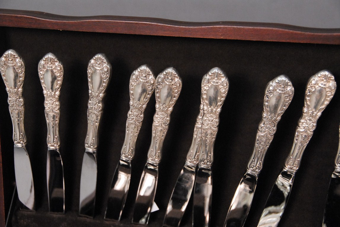 Lot 292: Alvin sterling silver flatware setting for twelve, Prince Eugene pattern, in a fitted box, having 101 total pieces. 102 t oz. plus 2…