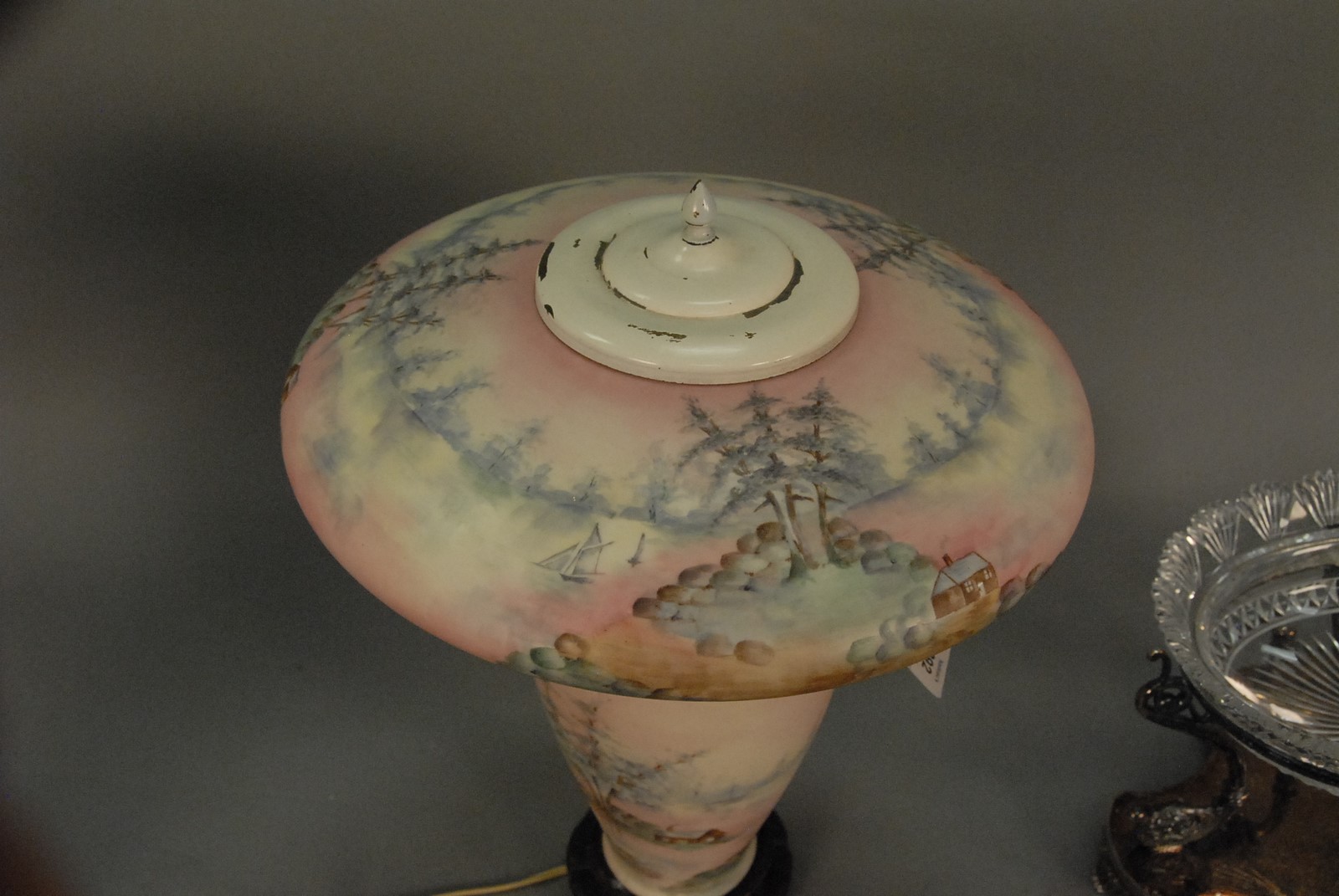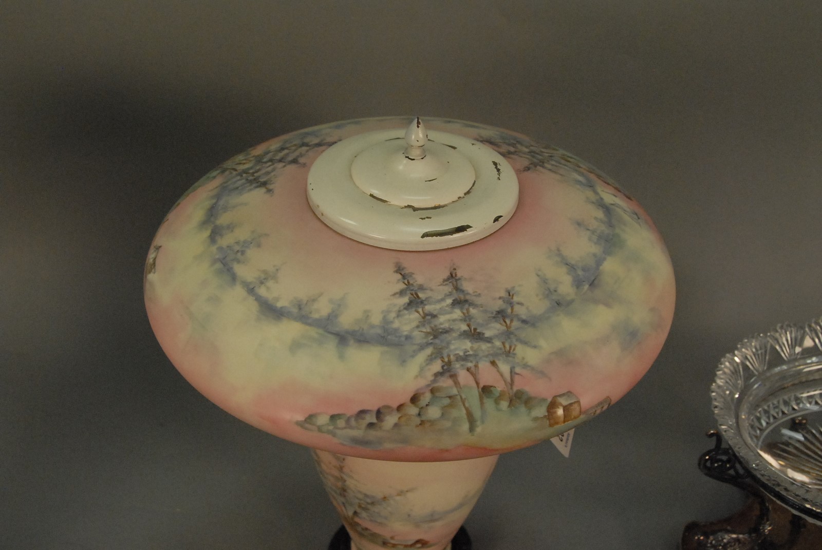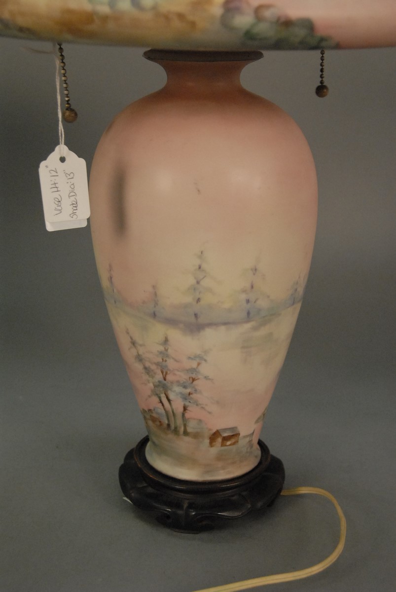 Lot 292: American Belleek scenic table lamp, hand painted with cabin and landscape with spruce trees, round tapered base and mushroom shade with two socket light. total ht. 13 in.